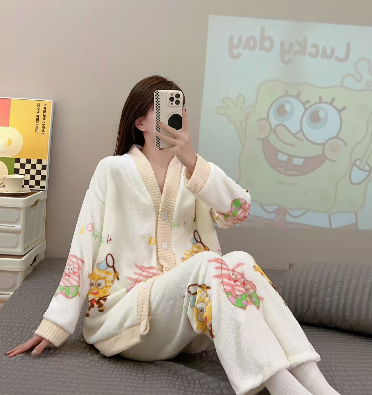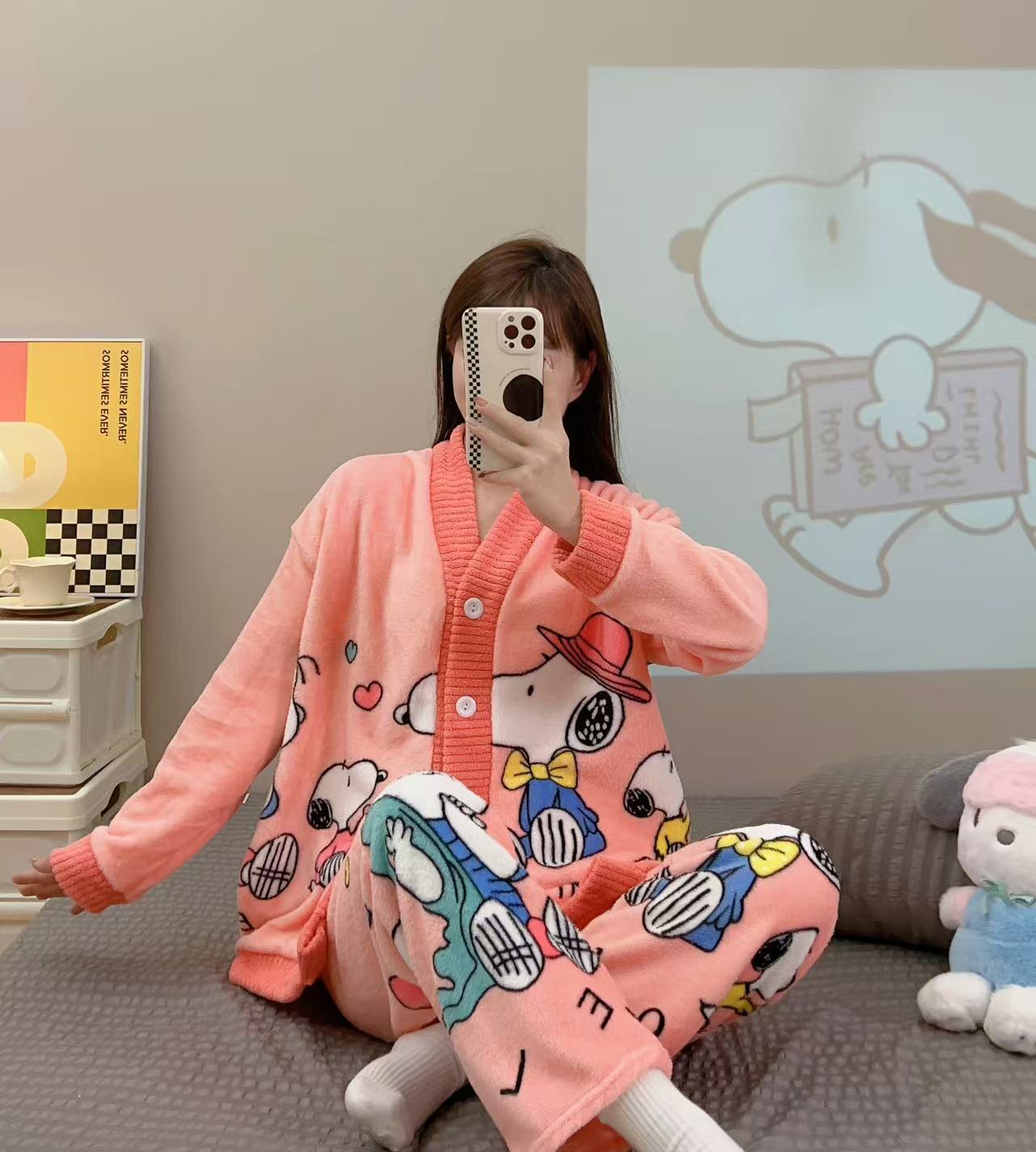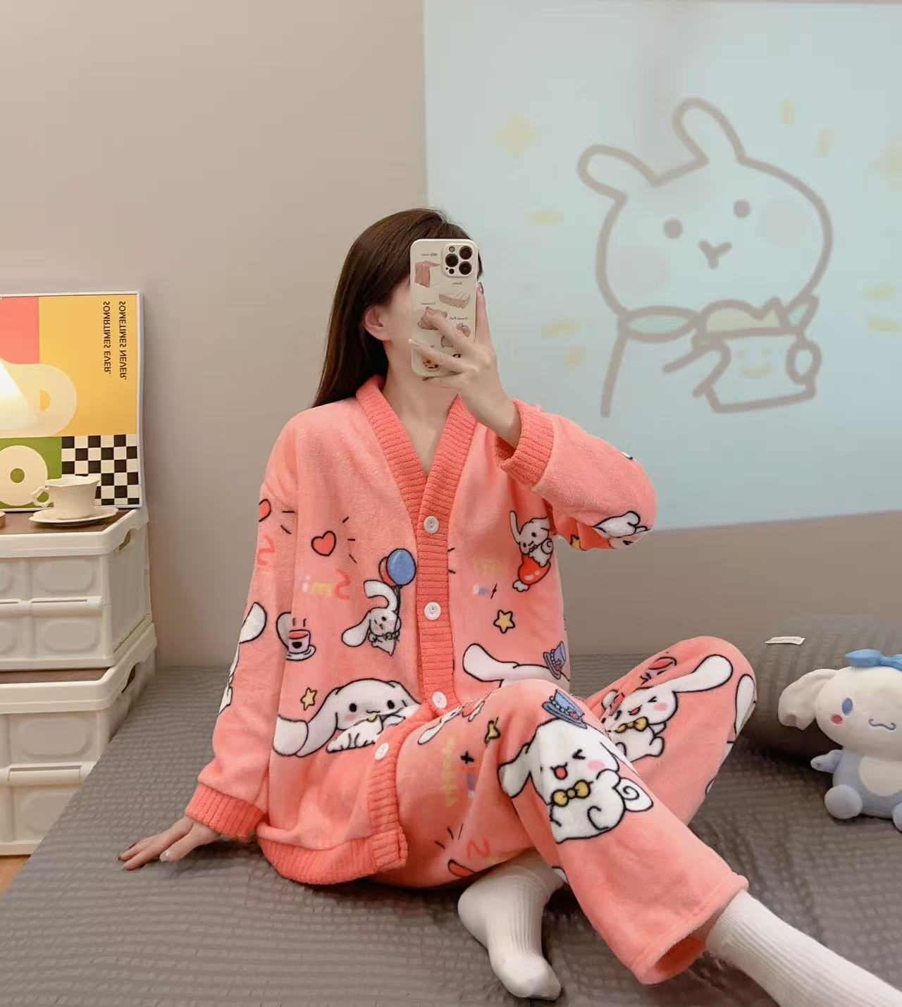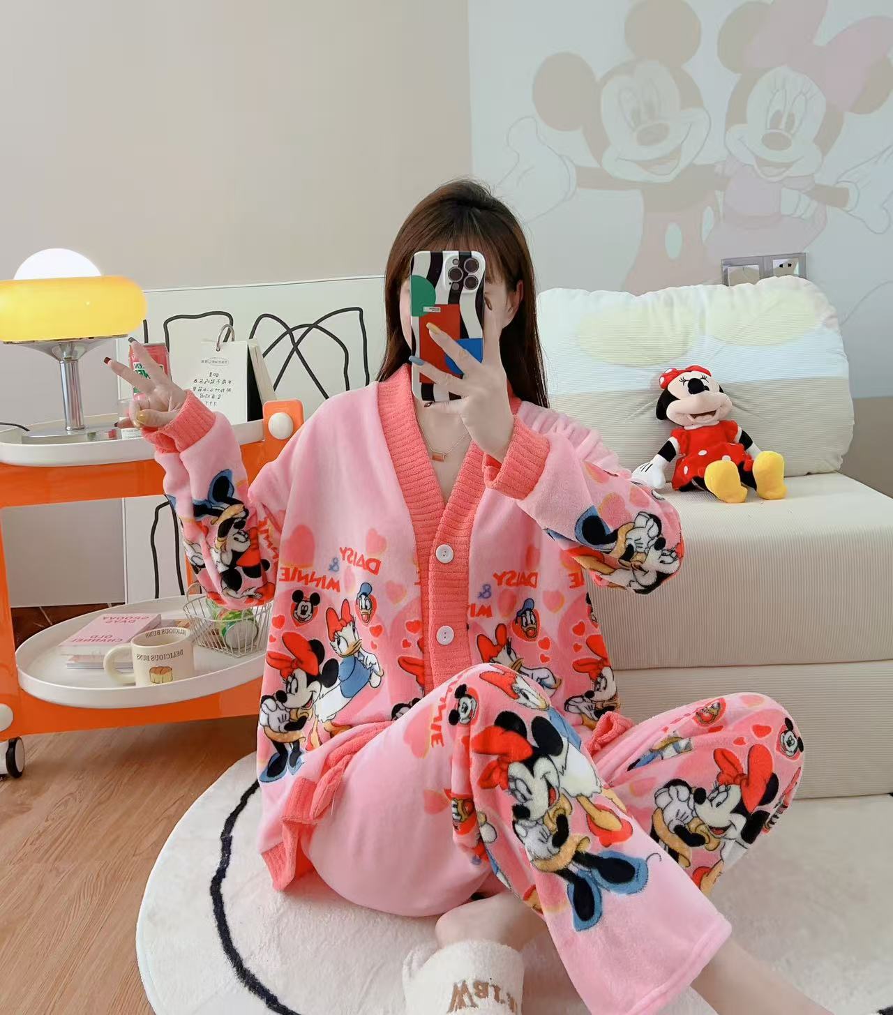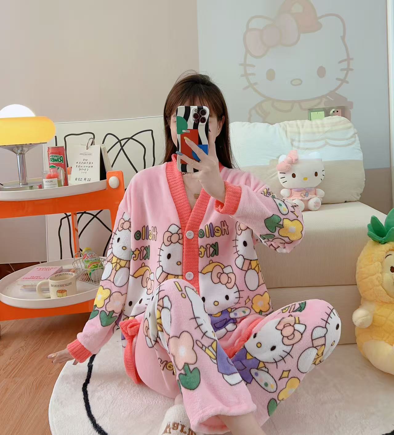 法兰绒睡衣女士v领开衫厚款外贸大码可爱保暖家居服套装