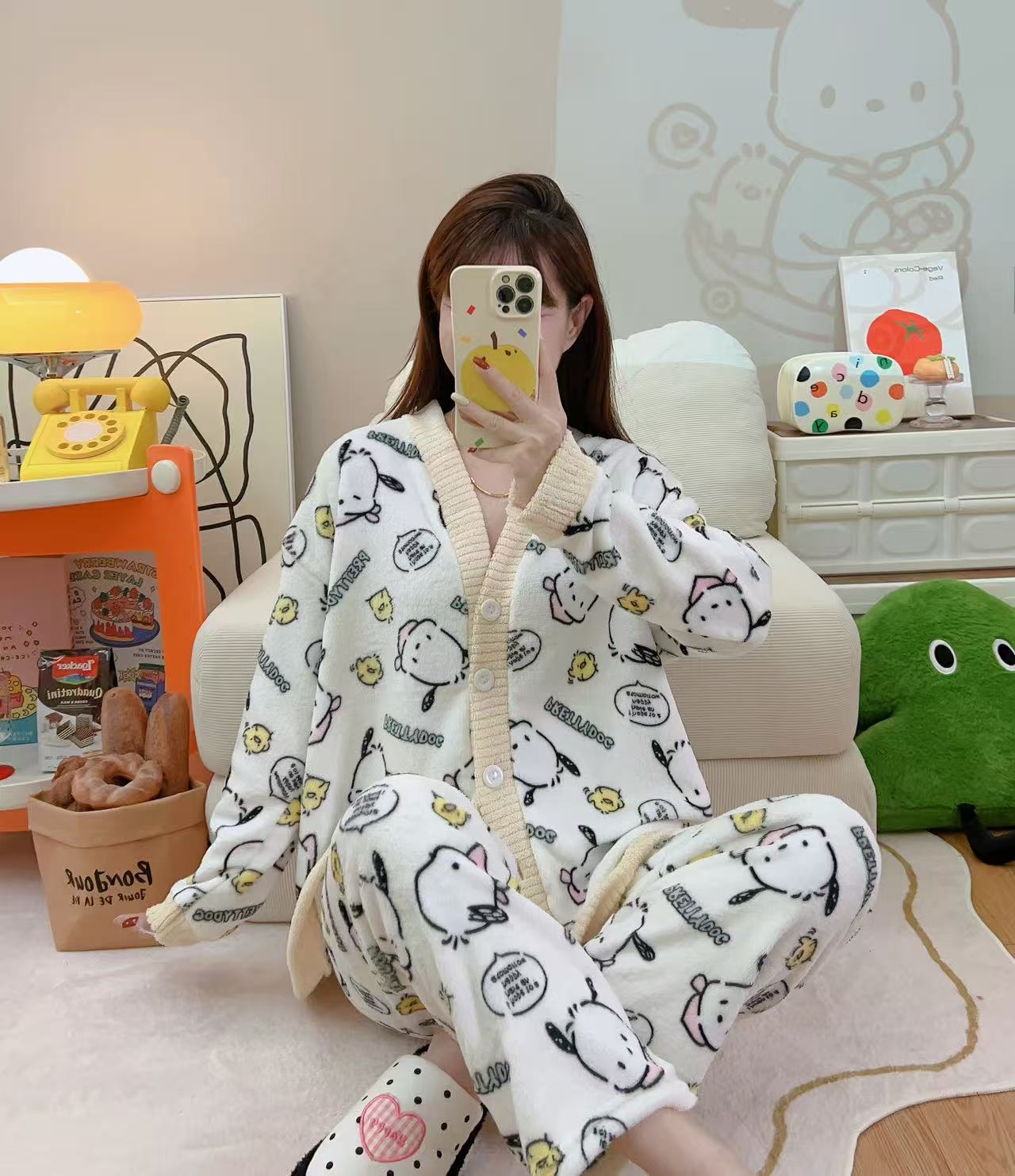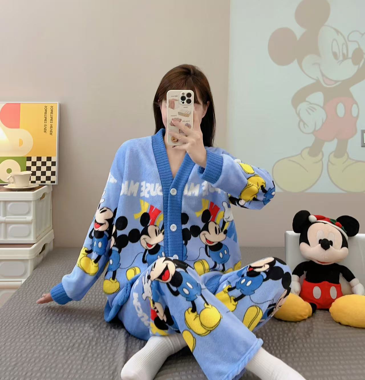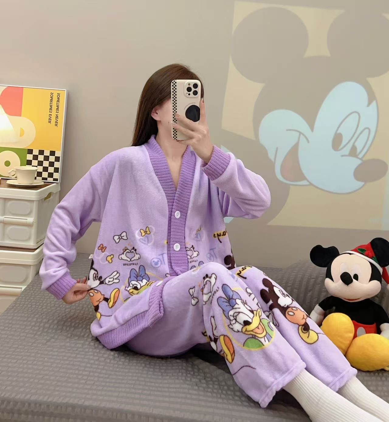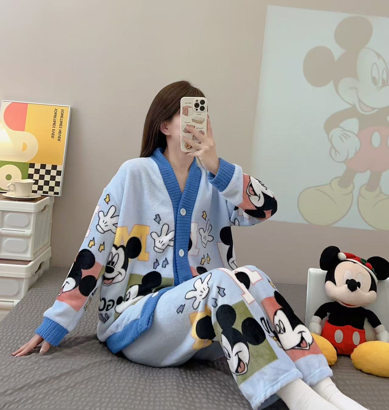 法兰绒睡衣女士v领开衫厚款外贸大码可爱保暖家居服套装