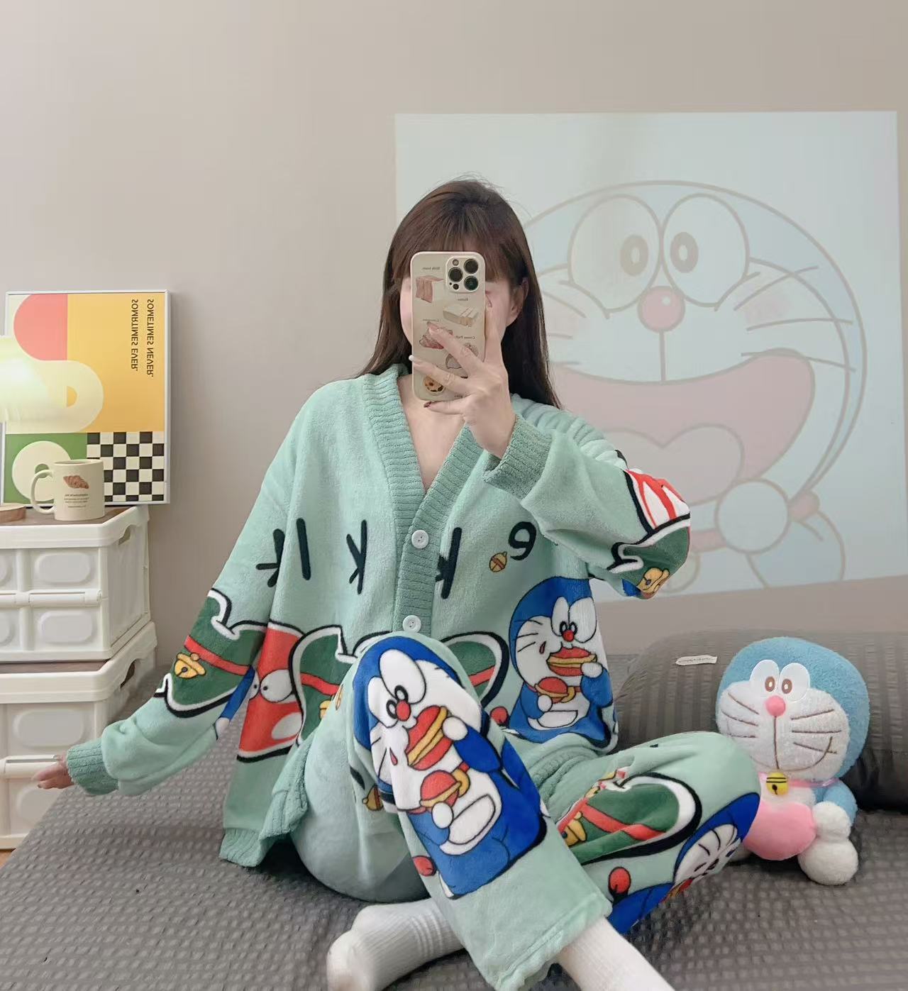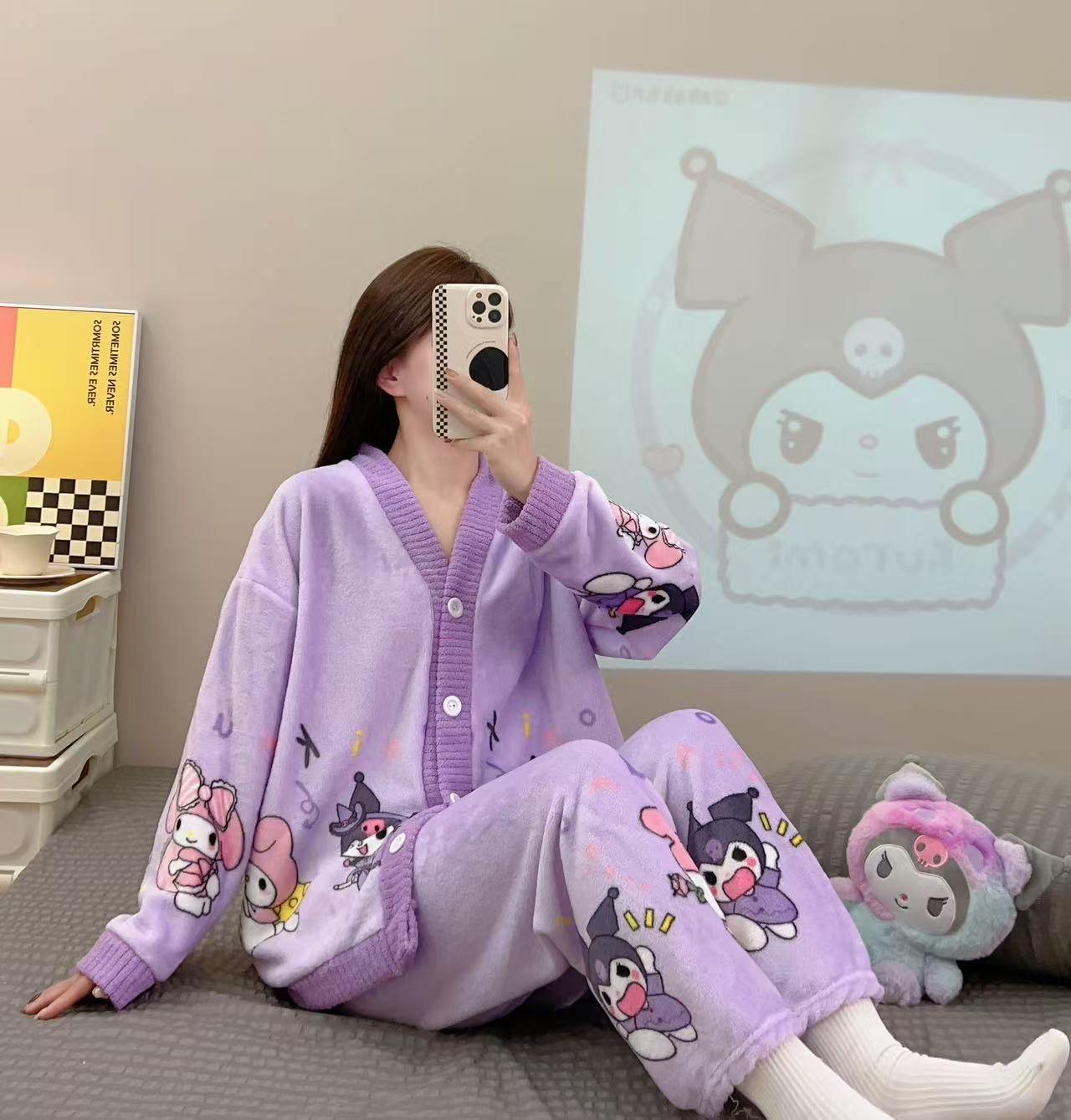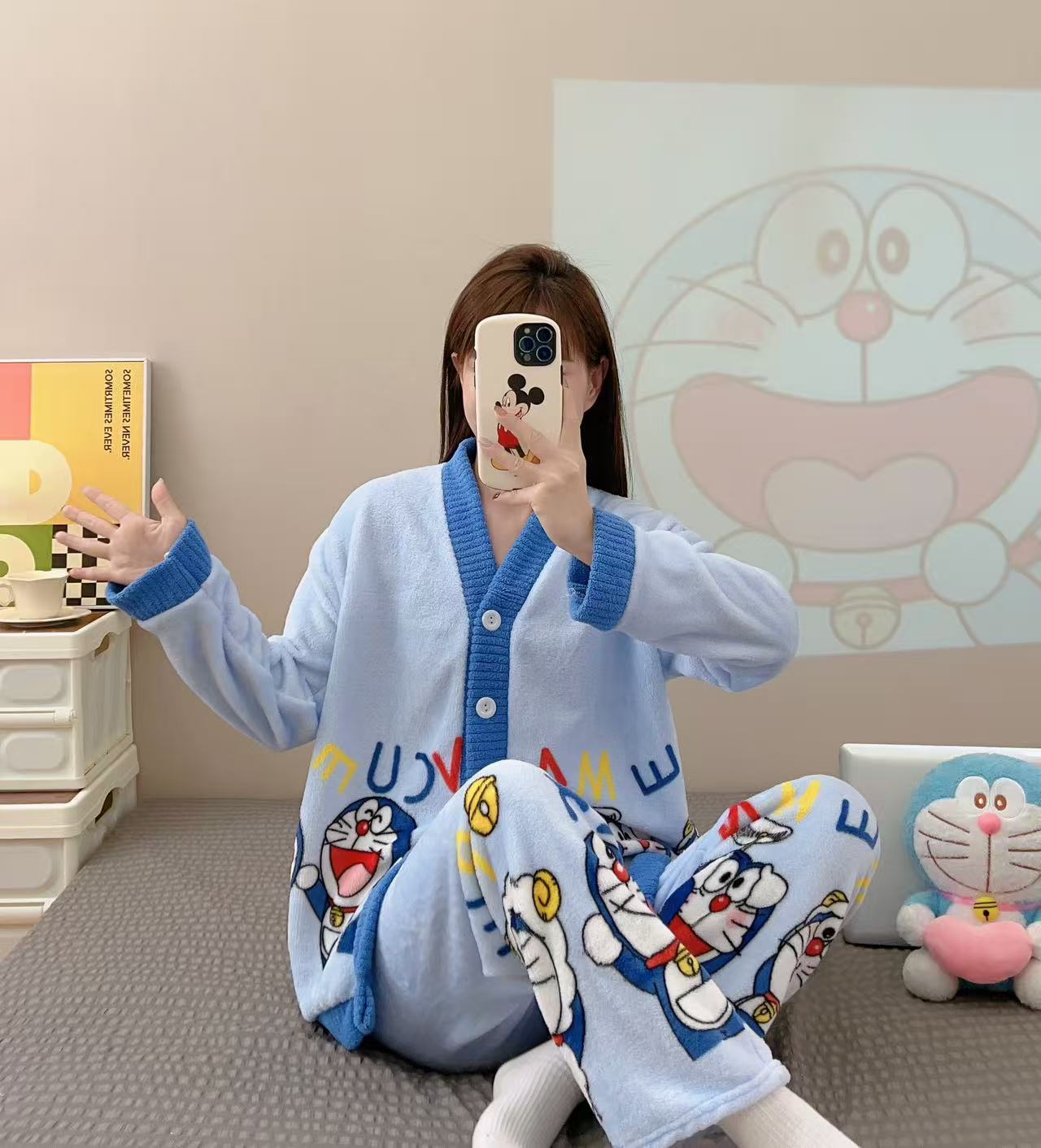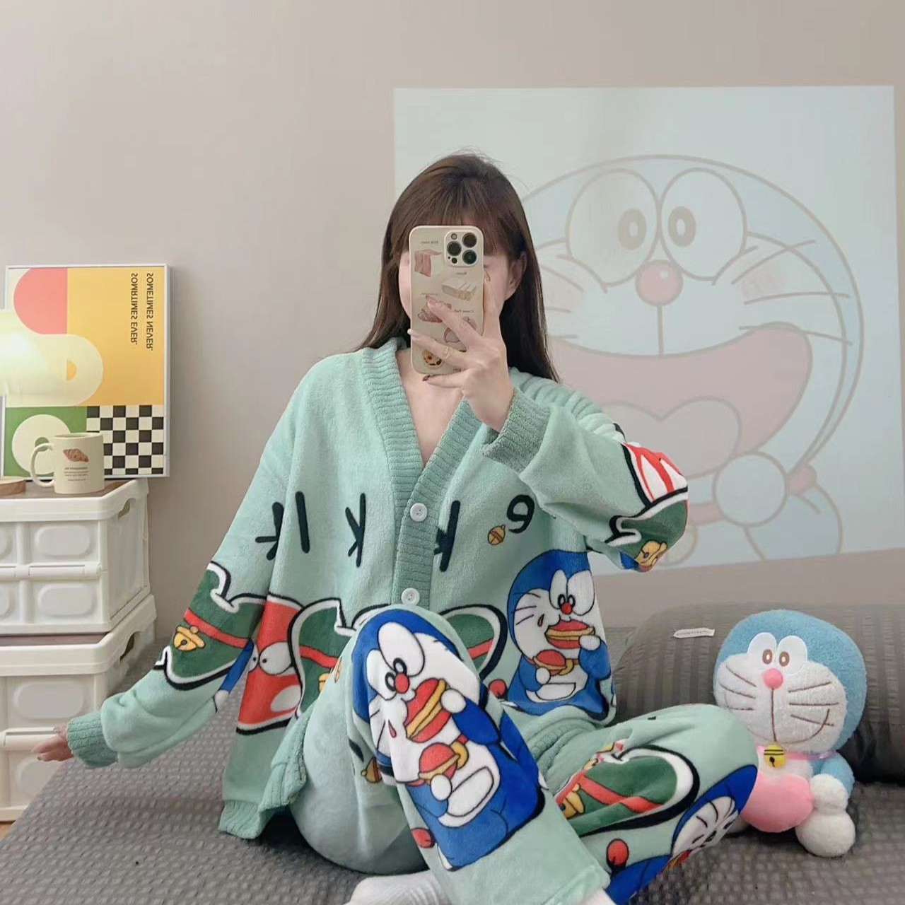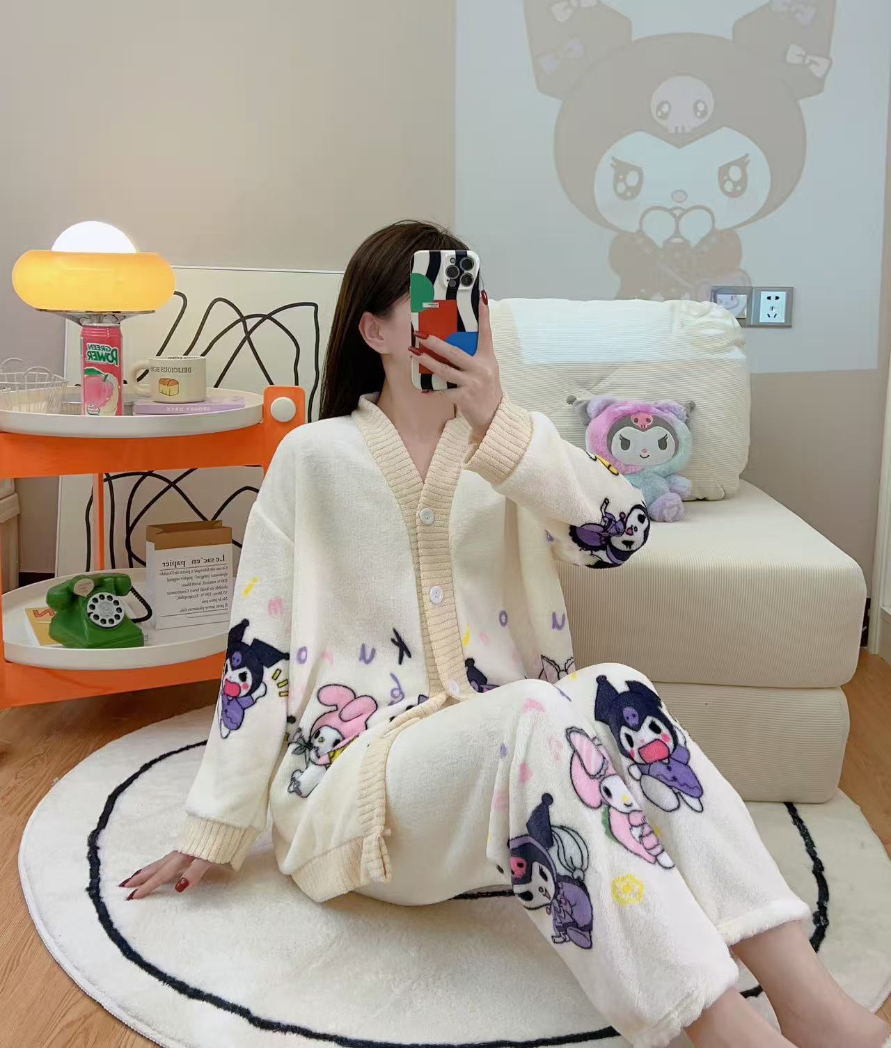 法兰绒睡衣女士v领开衫厚款外贸大码可爱保暖家居服套装