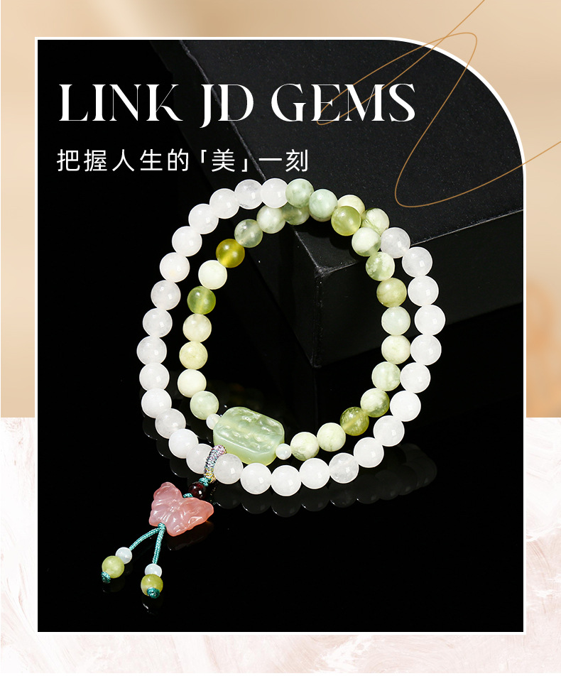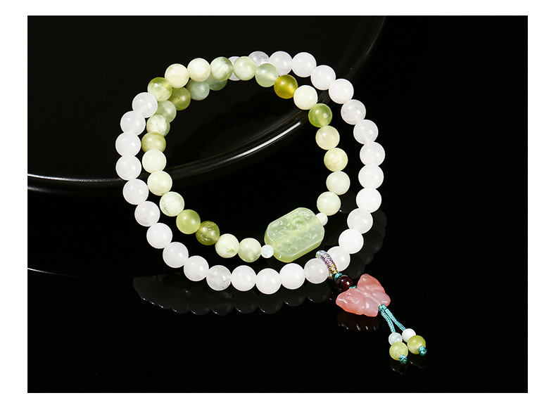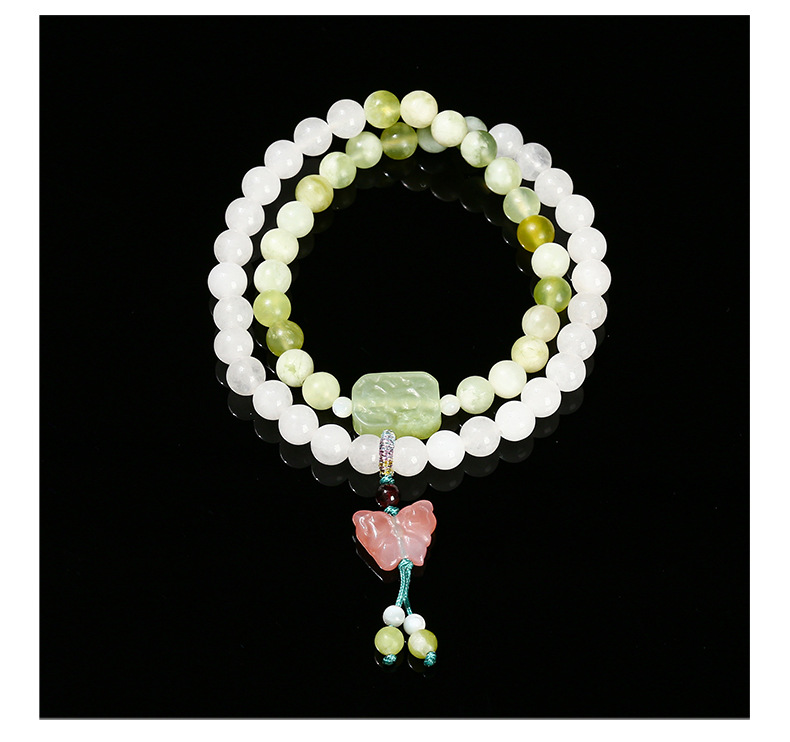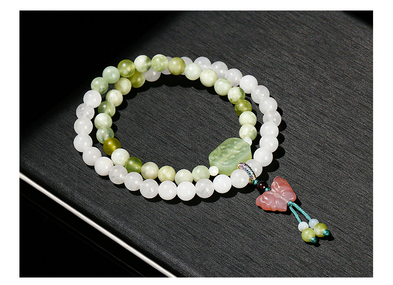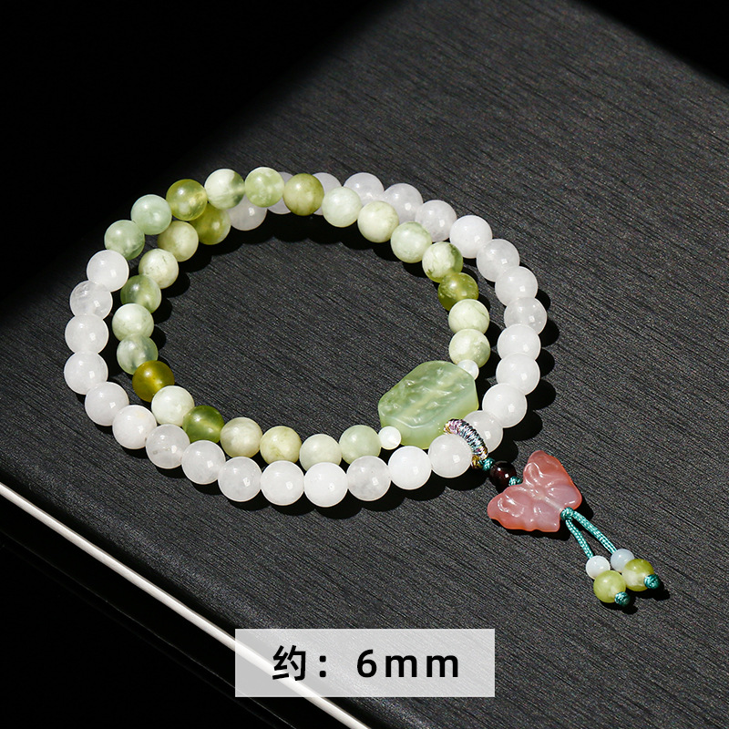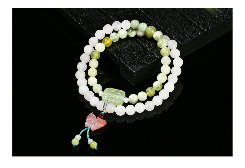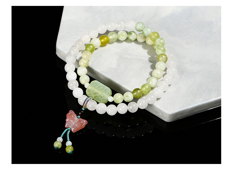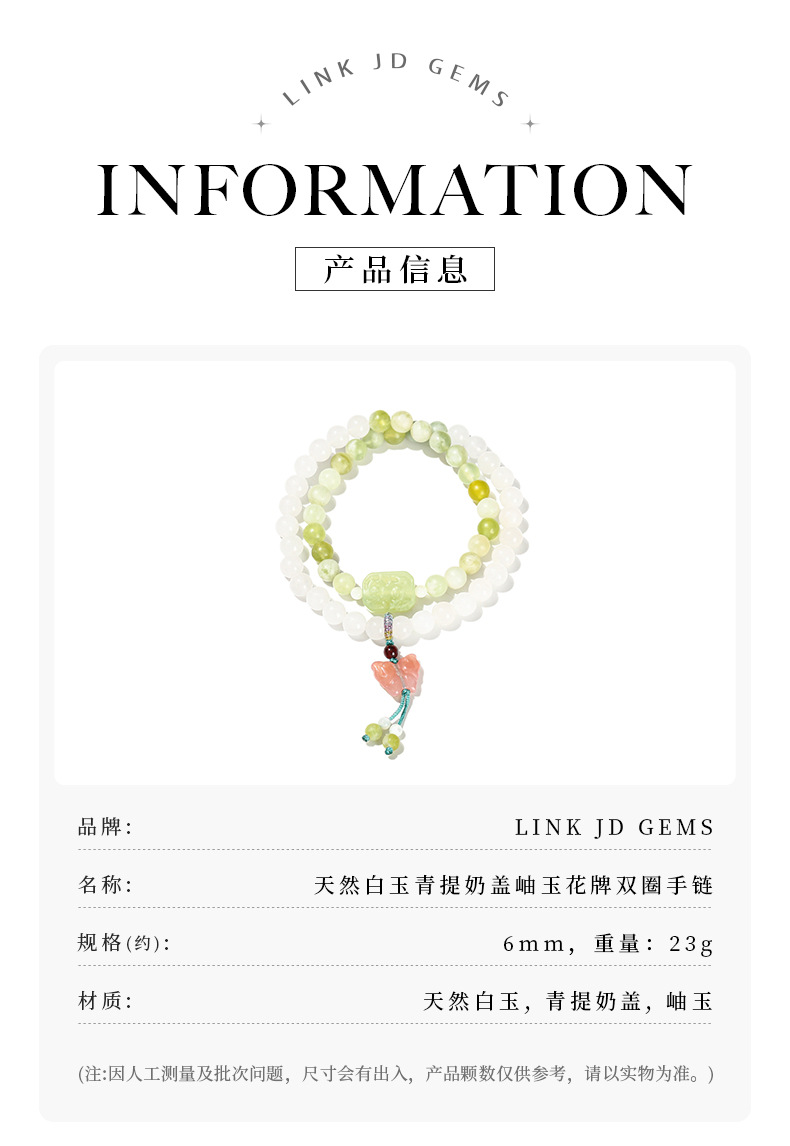 晶州珠宝 天然白玉青提奶盖岫玉花牌双圈手链小清新百搭手串批发