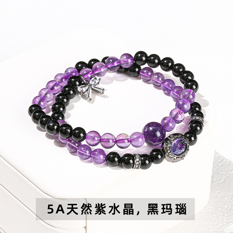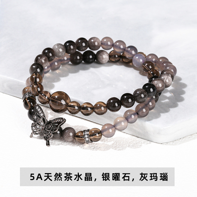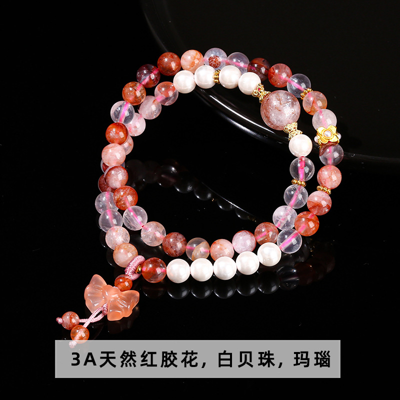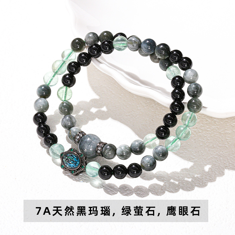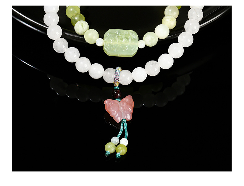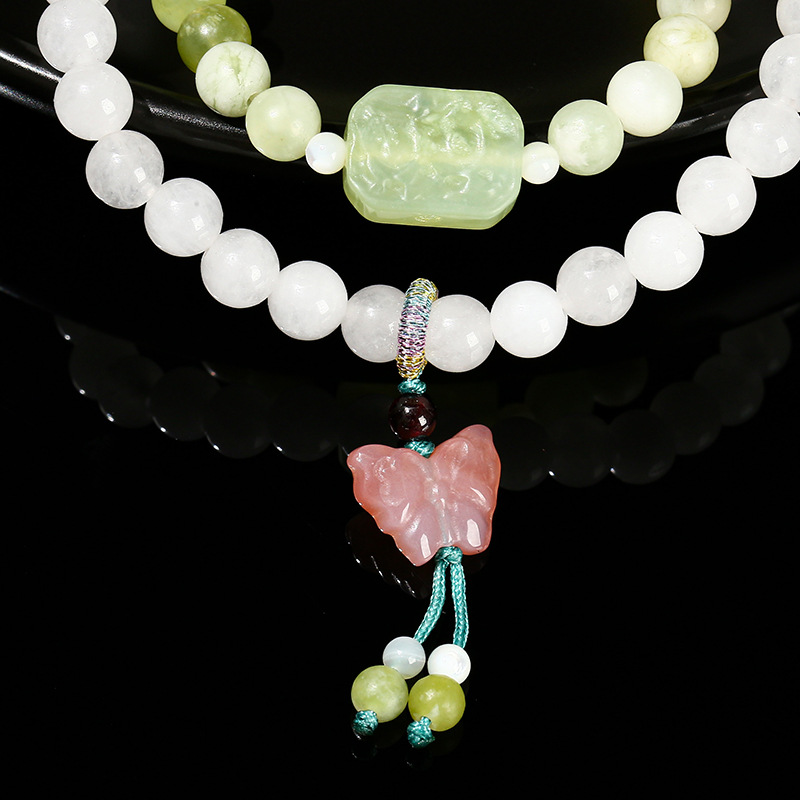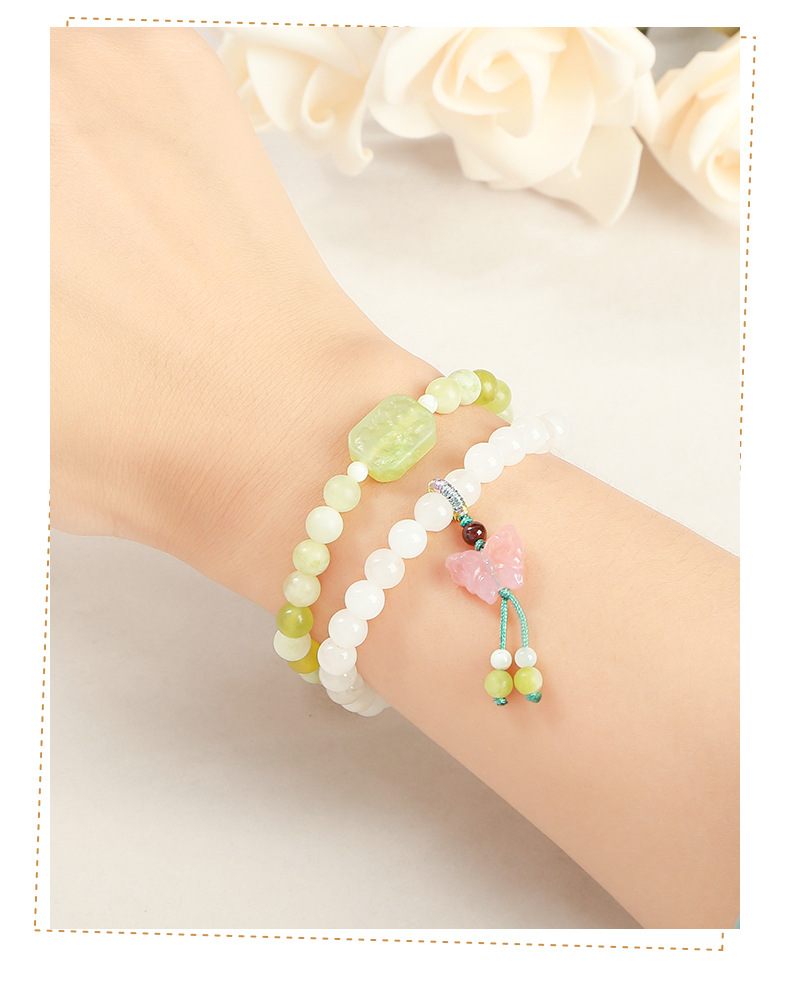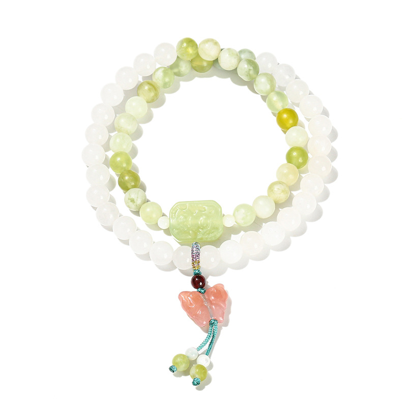 晶州珠宝 天然白玉青提奶盖岫玉花牌双圈手链小清新百搭手串批发