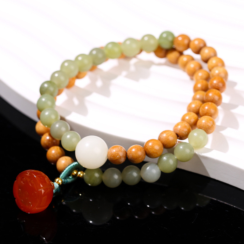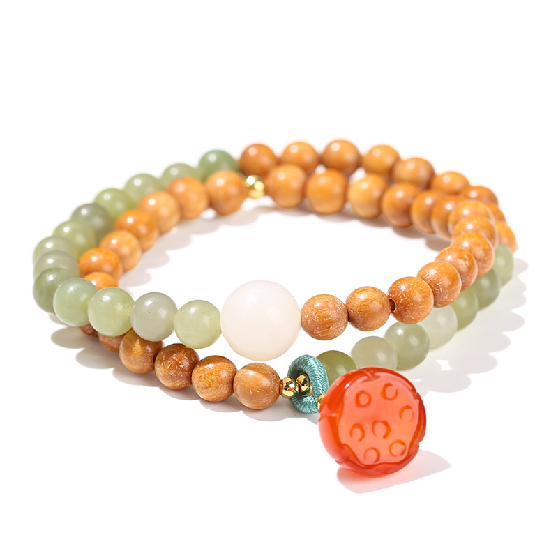 晶州珠宝 天然青玉拼檀木玛瑙莲蓬挂件双圈手链国风女生手饰批发