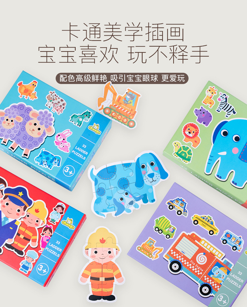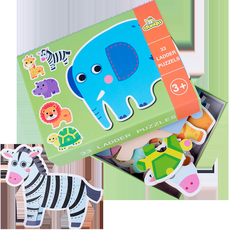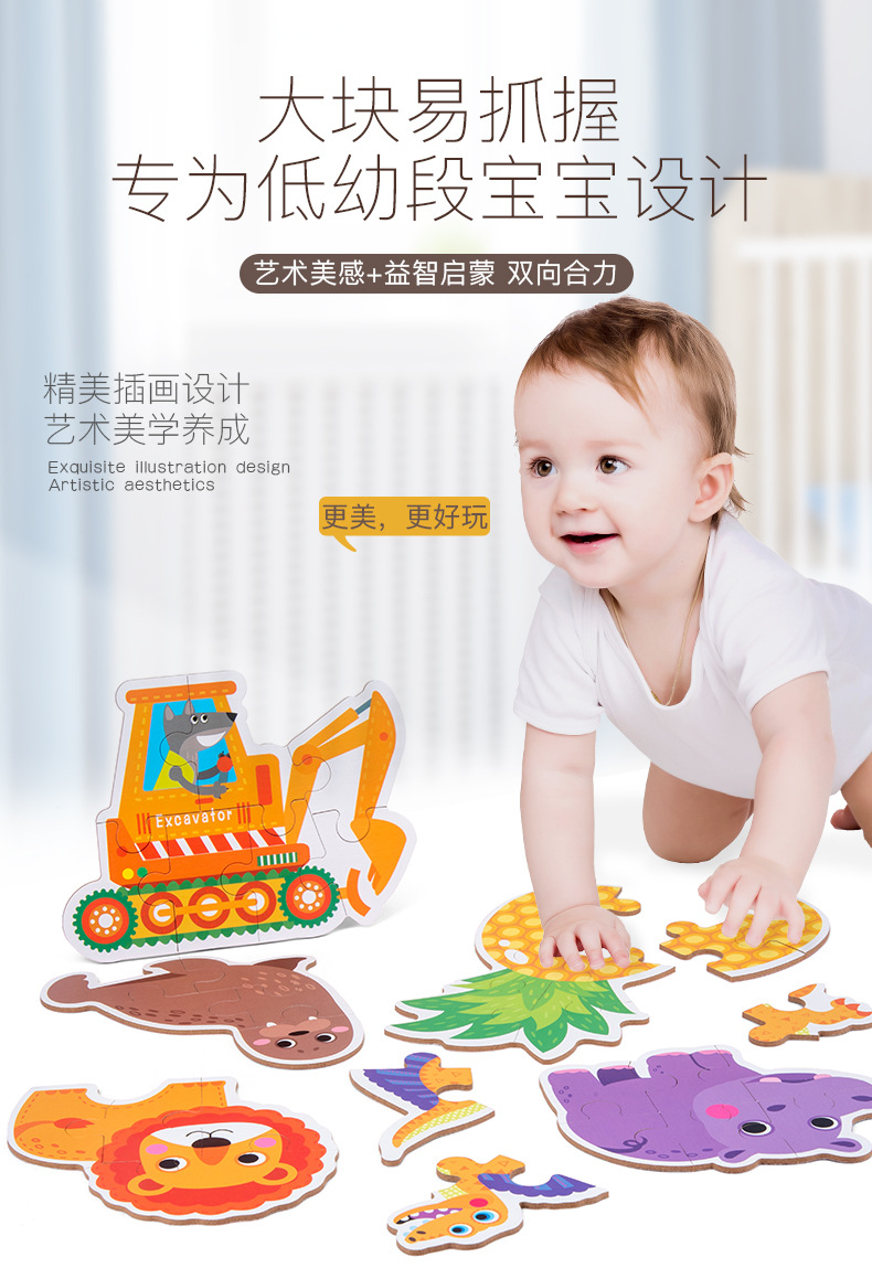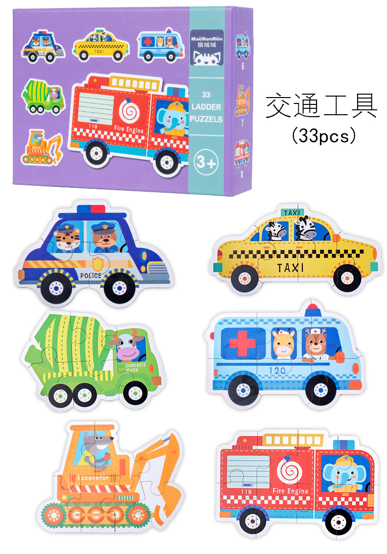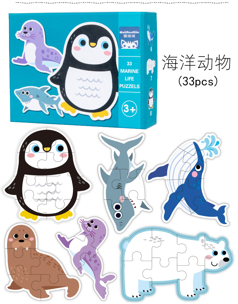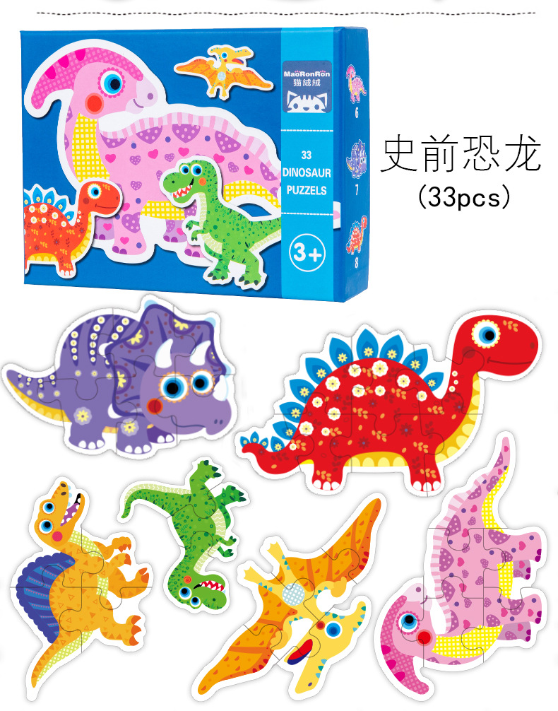 跨境创意3岁儿童早教异形盒装33片动物恐龙交通插画纸质拼图玩具