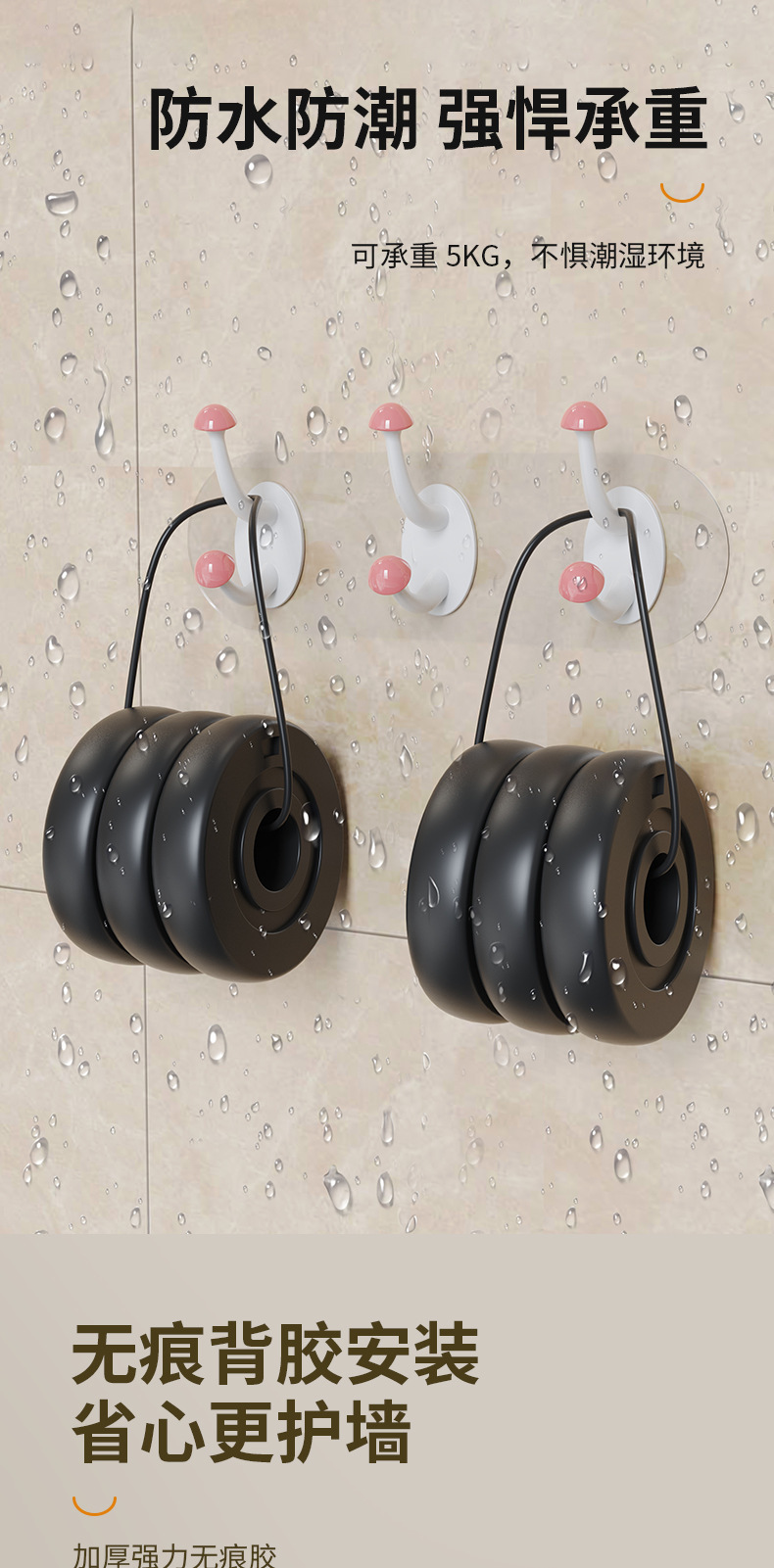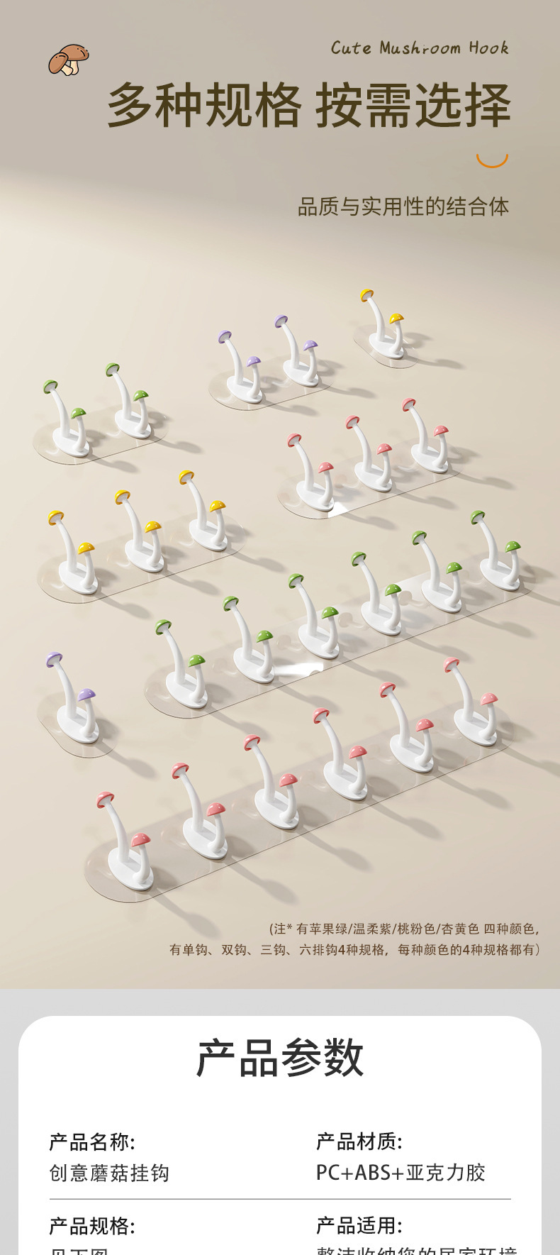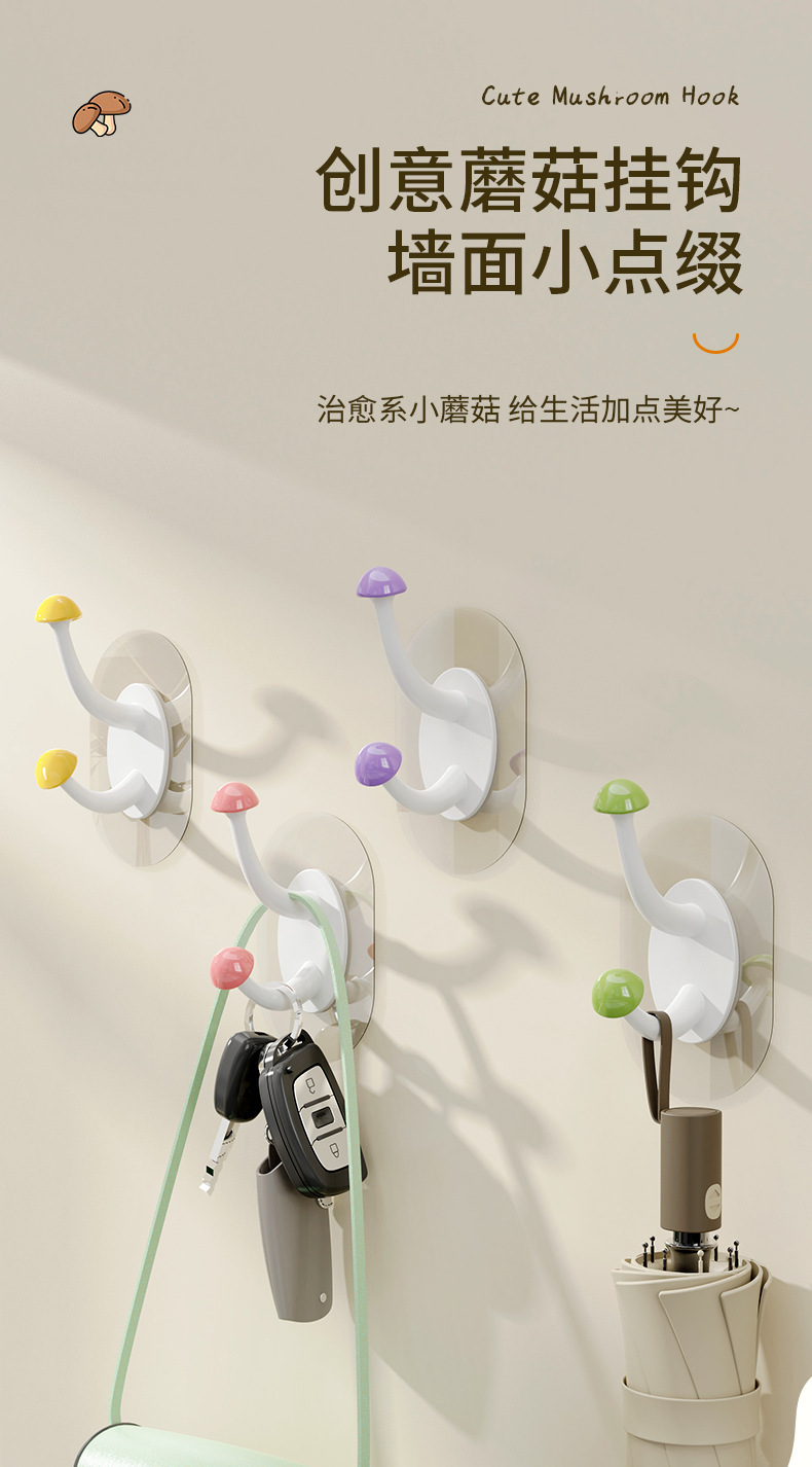 跨境免打孔无痕强力创意卡通蘑菇挂钩粘钩一排挂衣钩