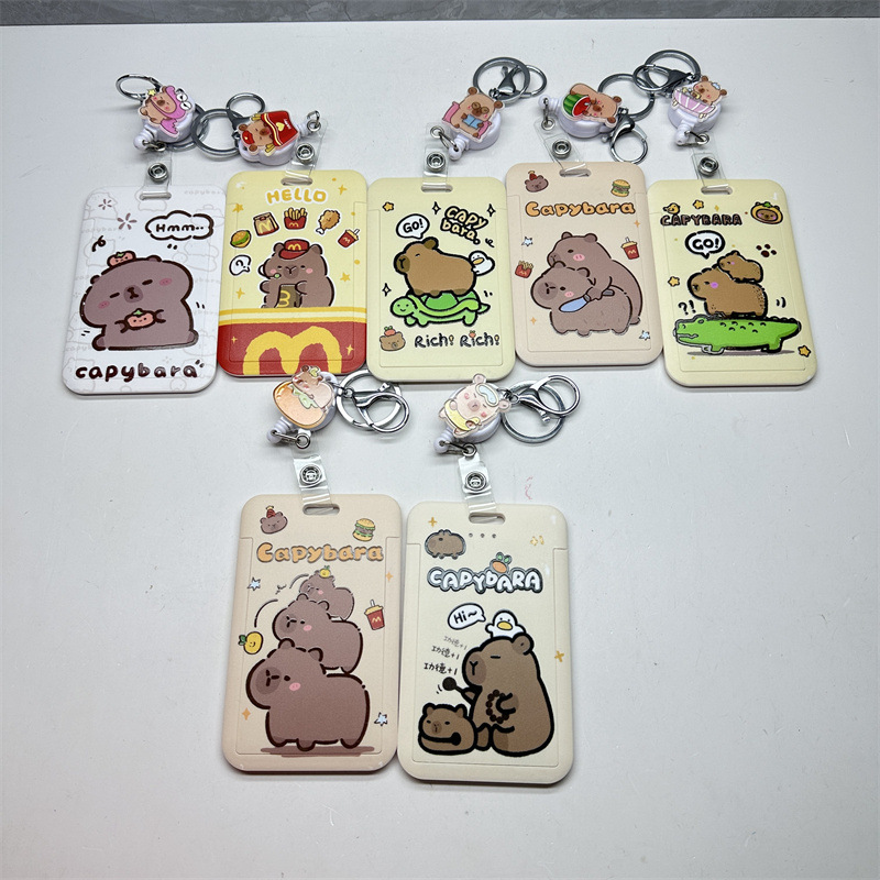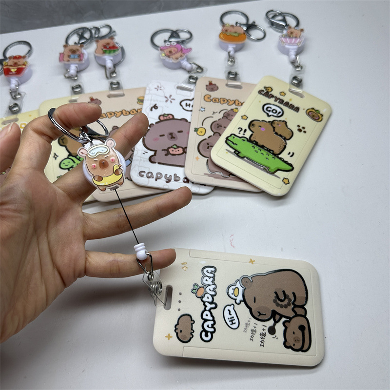 外贸卡皮巴拉伸缩易拉扣证件套佛系水豚公交卡套工作证套背包挂件