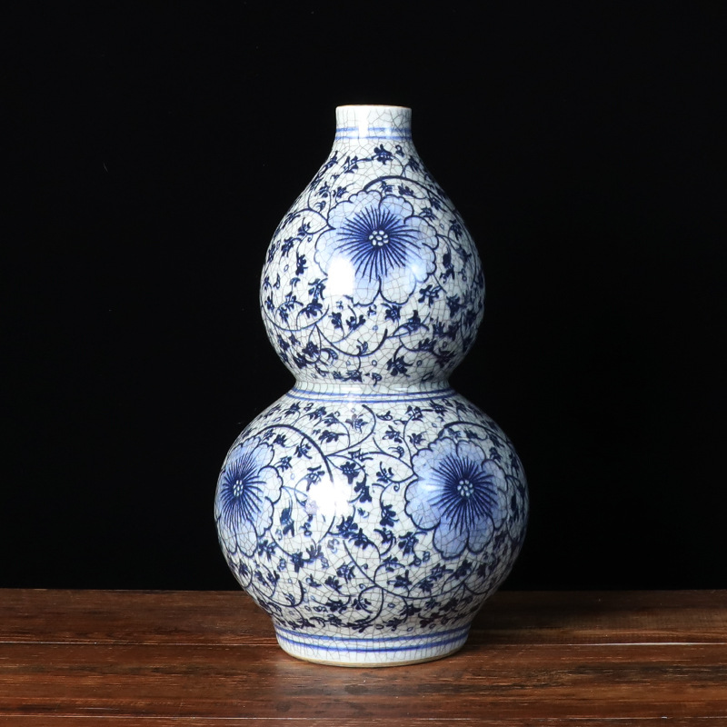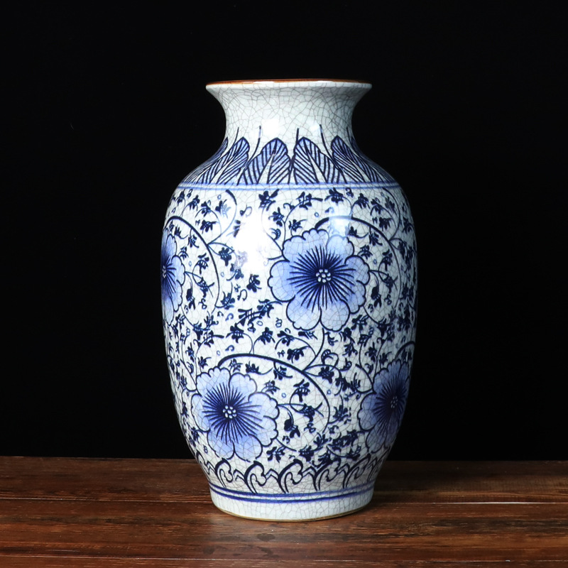 景德镇复古手绘青花瓷花瓶 家居客厅装饰摆件 中式裂釉花瓶工艺品