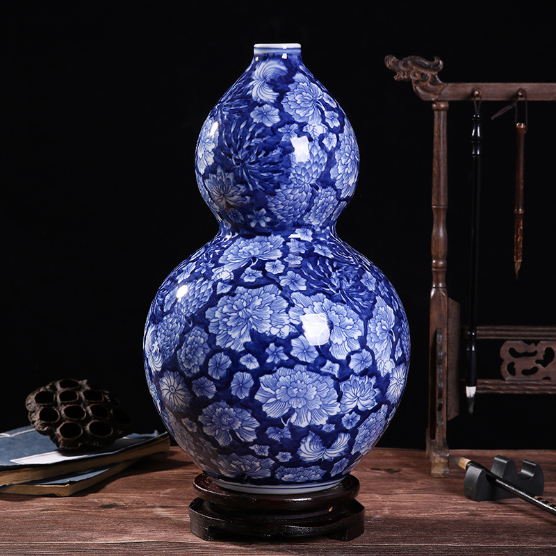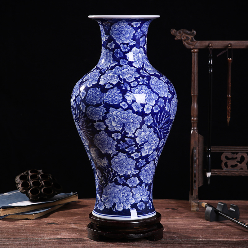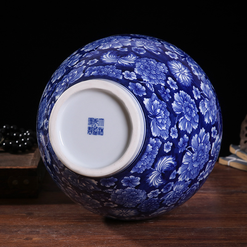 景德镇手绘混水蓝底牡丹赏瓶陶瓷新中式客厅家居工艺品博古架摆件