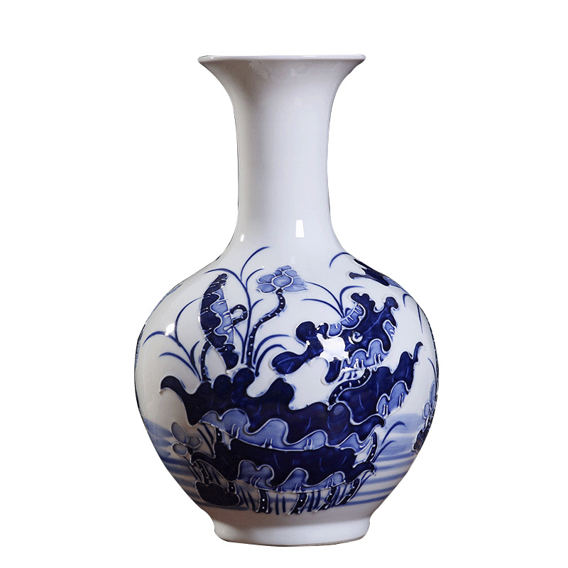 景德镇陶瓷装饰花瓶手绘汾水中式浮雕青花工艺品摆件