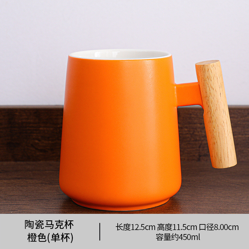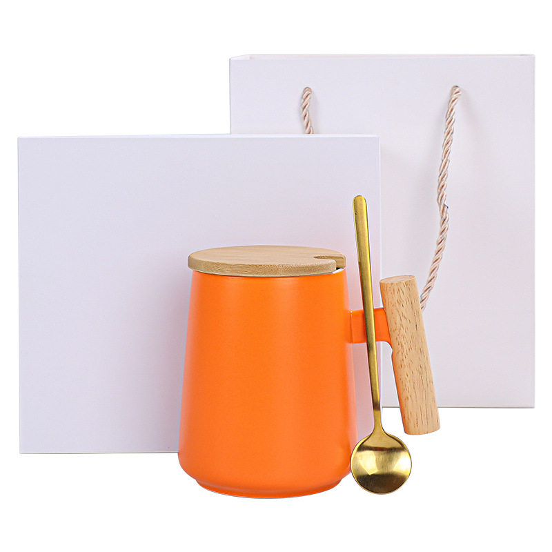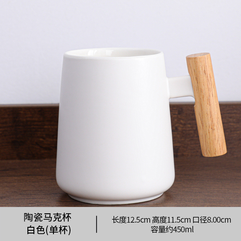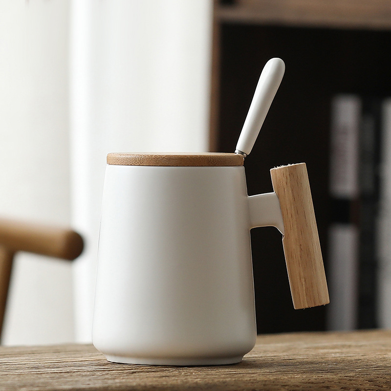 跨境 木柄把手陶瓷杯 创意马克杯 咖啡杯 泡茶杯带盖勺伴手礼