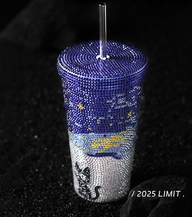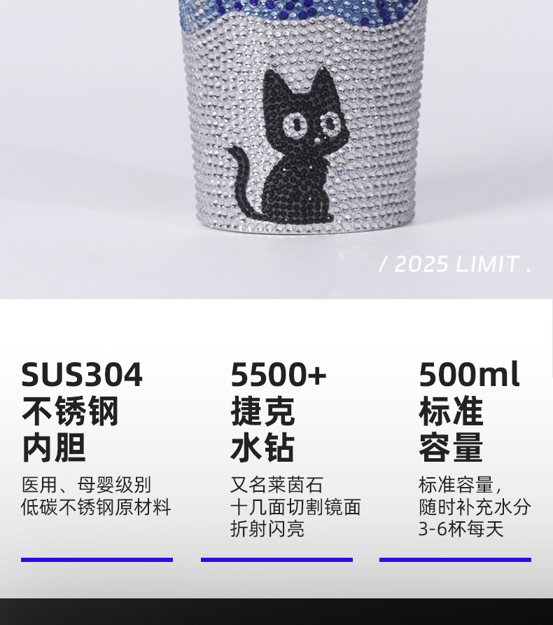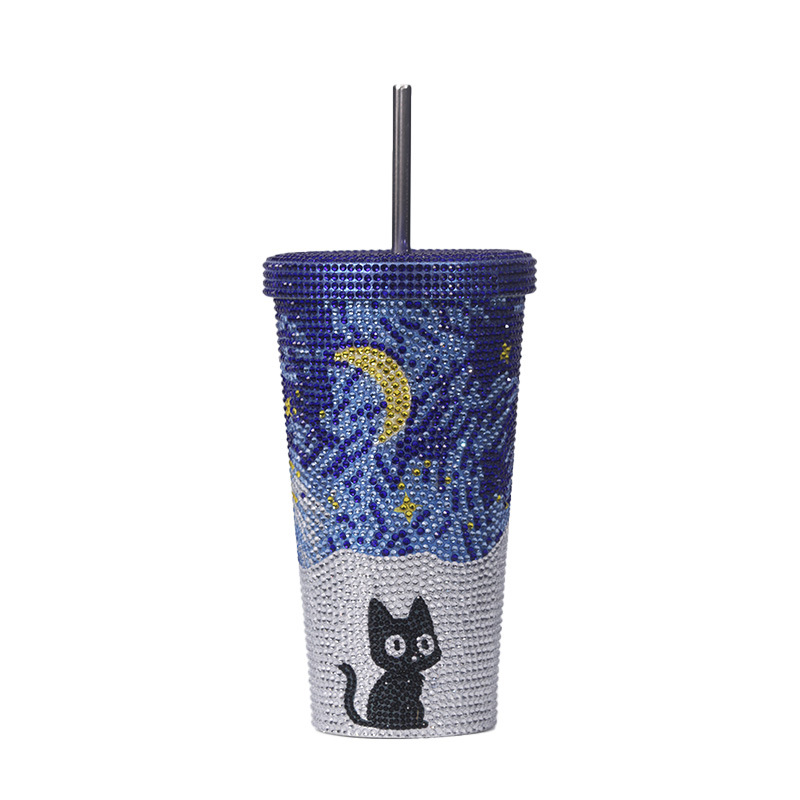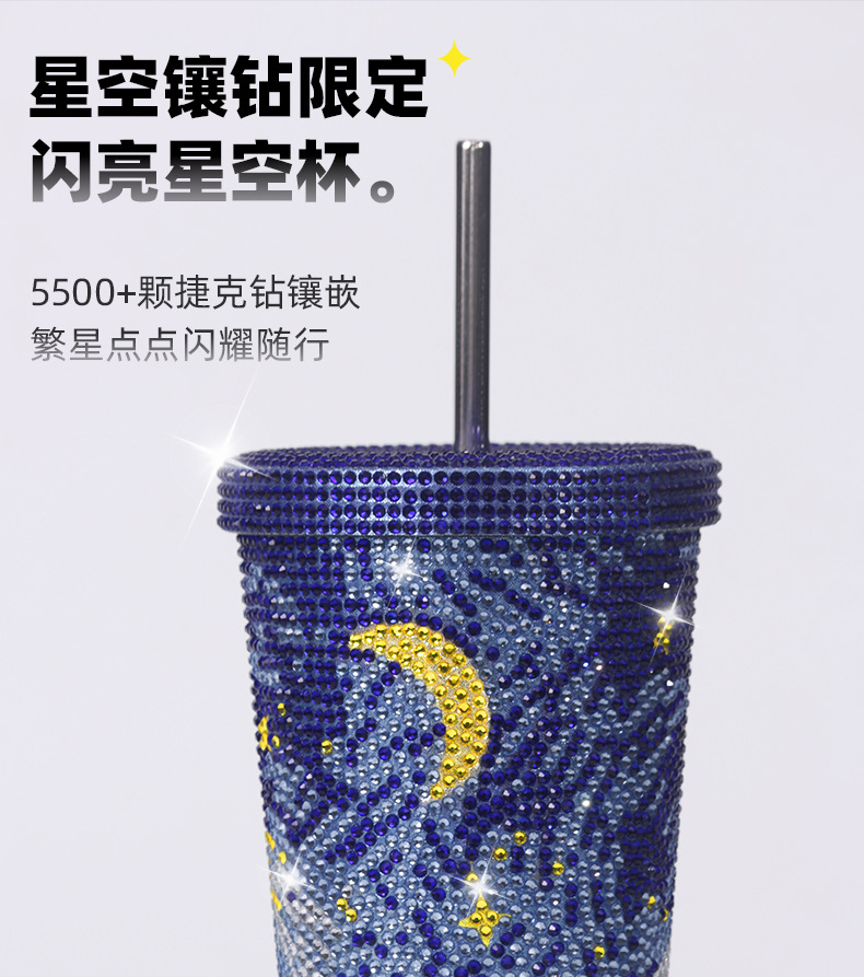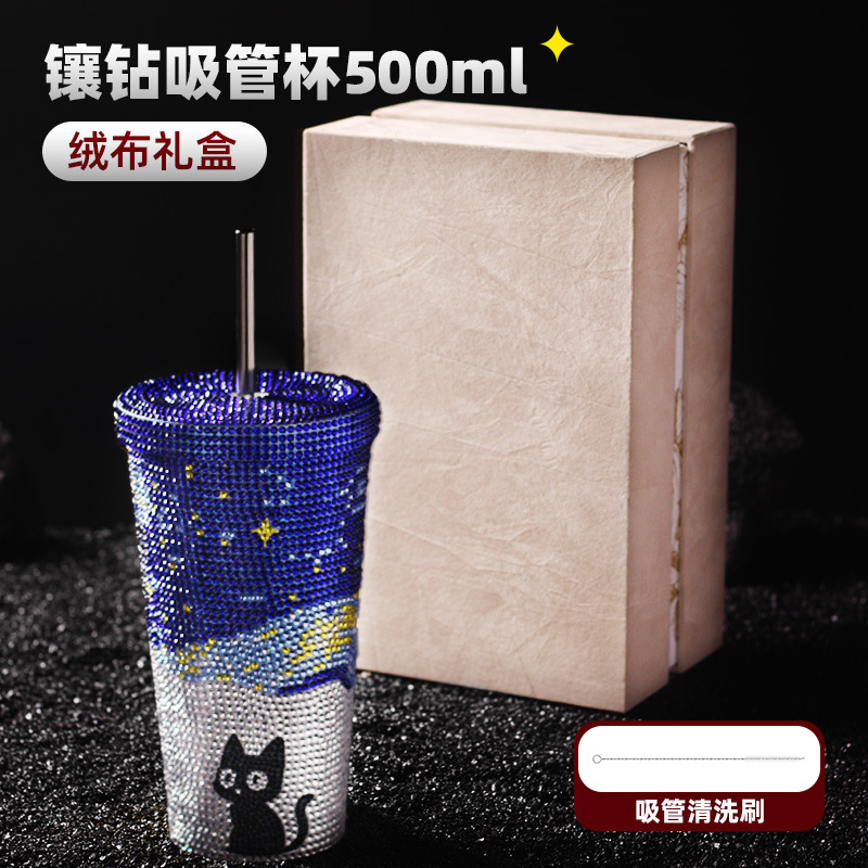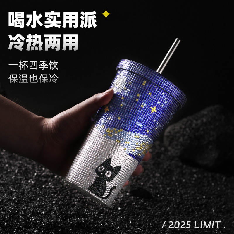 猫咪星空超萌网红吸管杯车载校园两用304不锈钢镶钻水钻吸管水杯