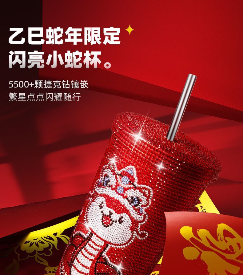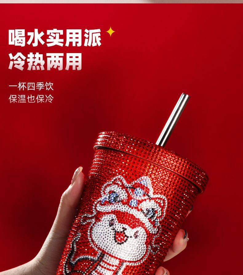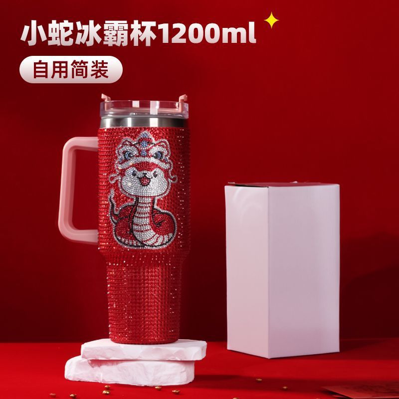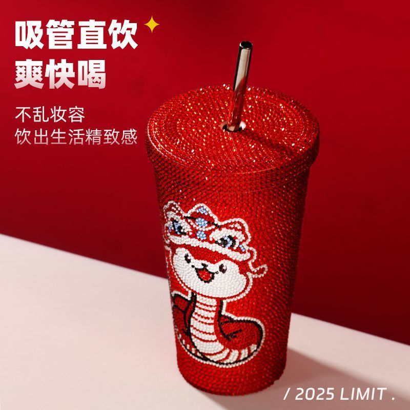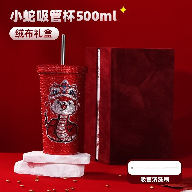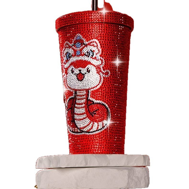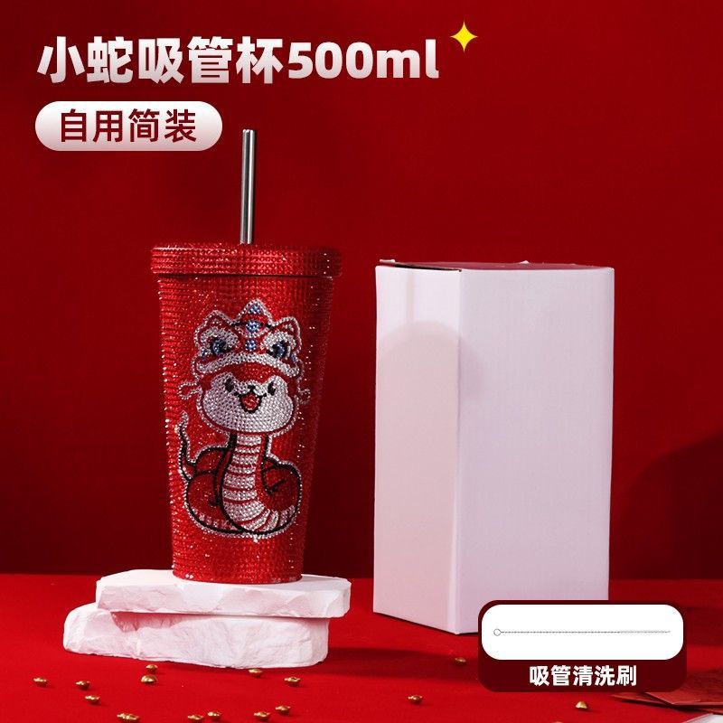 蛇年限定超萌网红吸管杯车载校园两用304不锈钢镶钻水钻吸管水杯