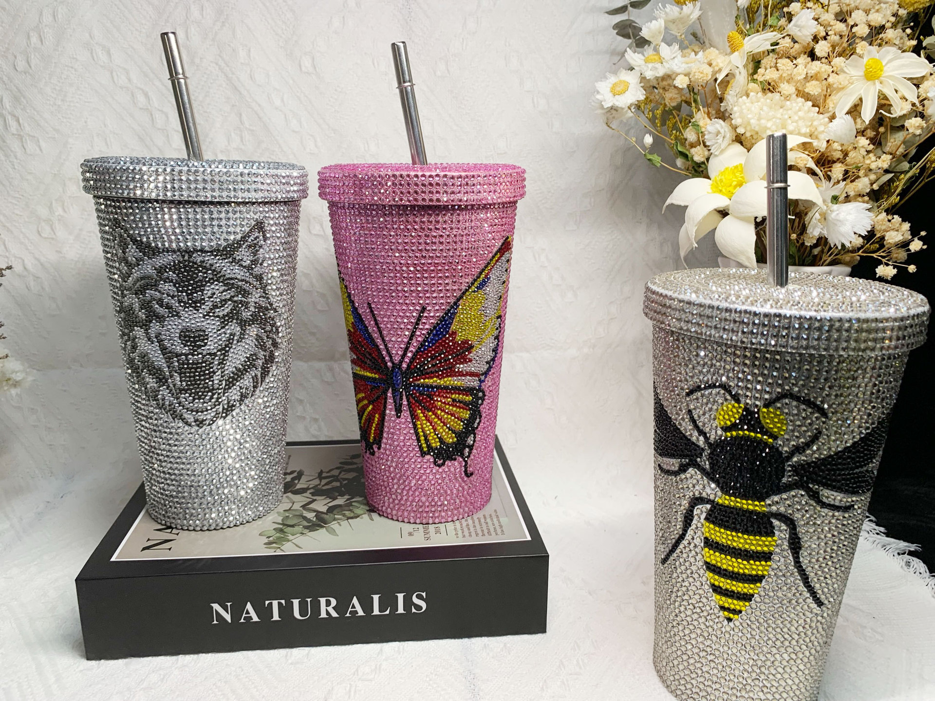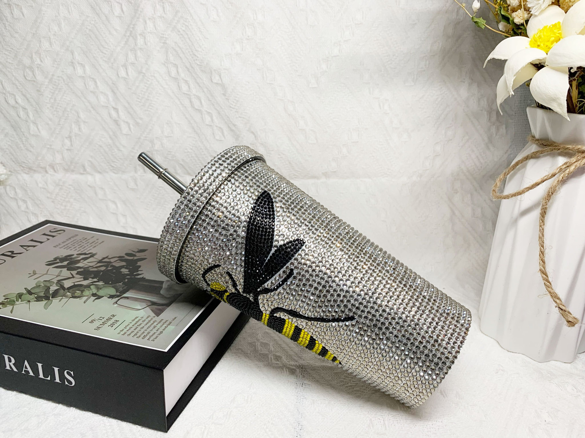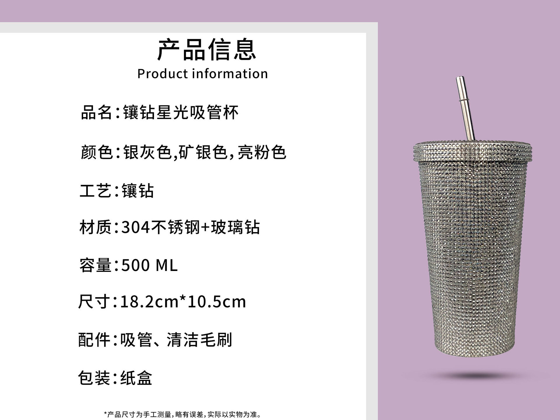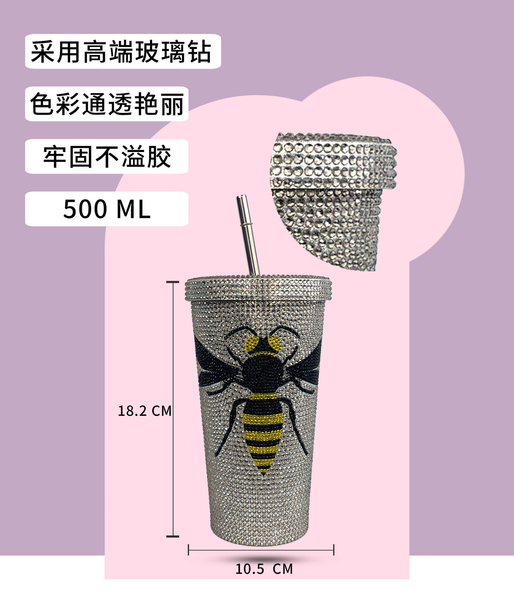 跨境欧美轻奢网红礼物水钻钻石镶钻满钻带盖水杯304不锈钢吸管杯