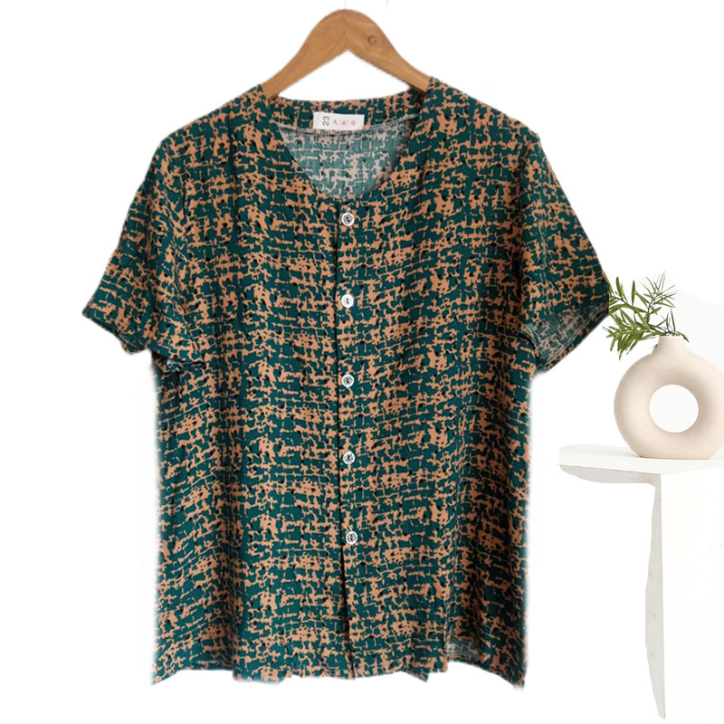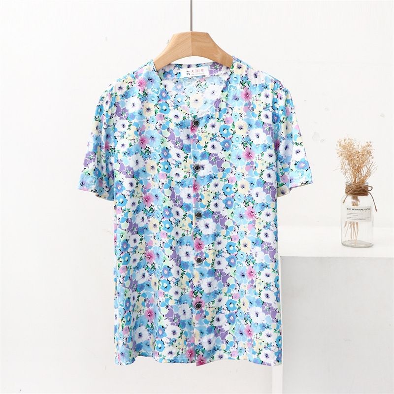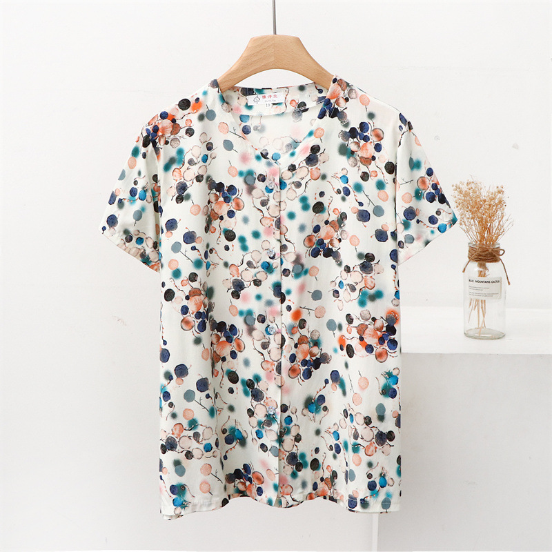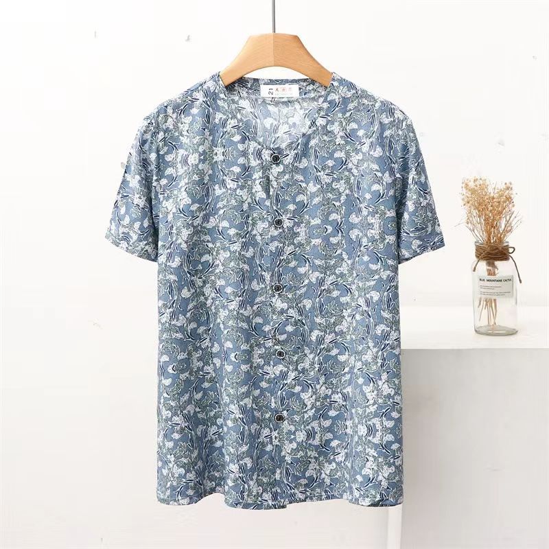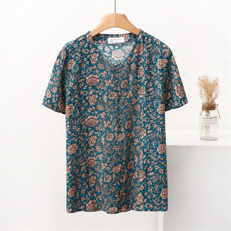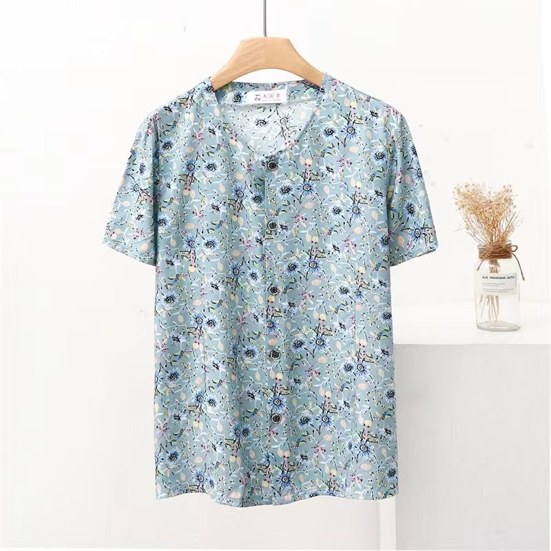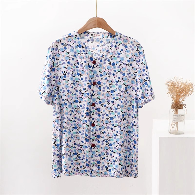 棉绸中老年妈妈装女上衣夏季薄款人造棉开衫印花宽松碎花衫T恤