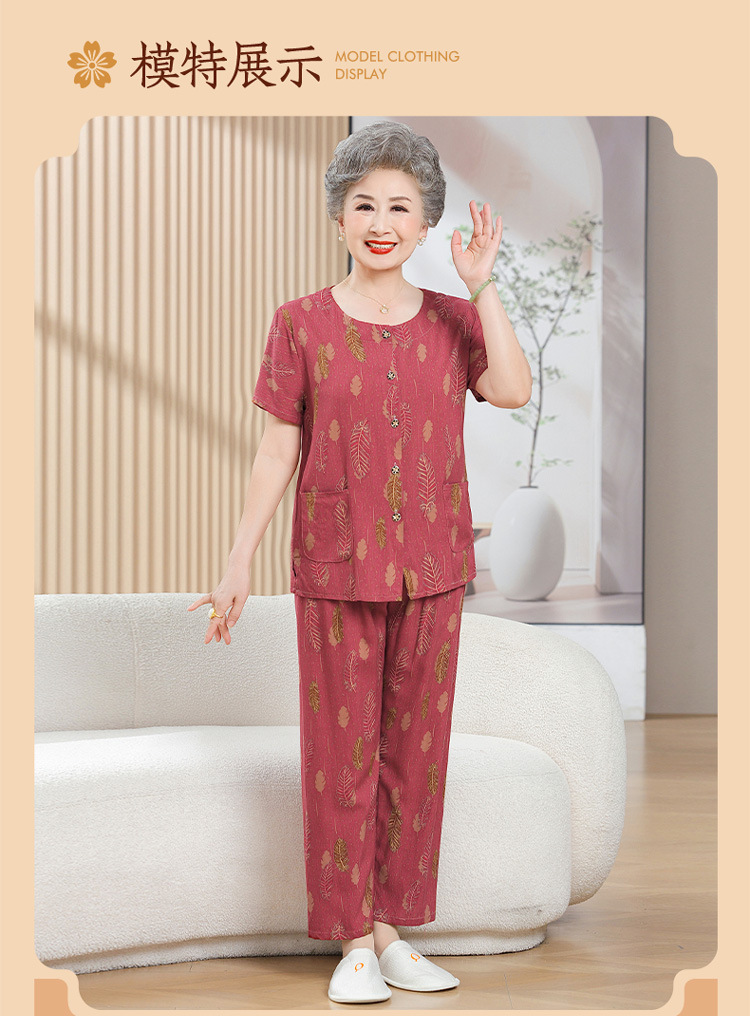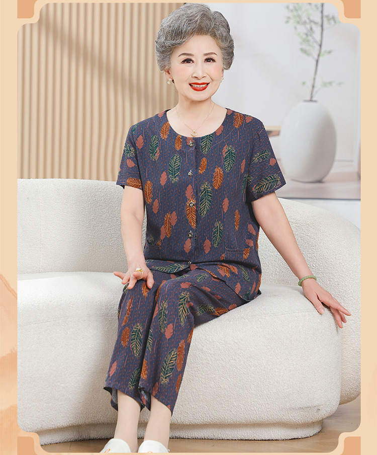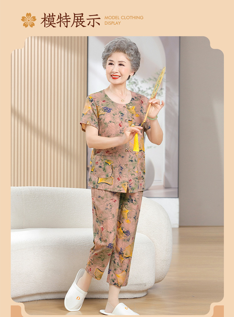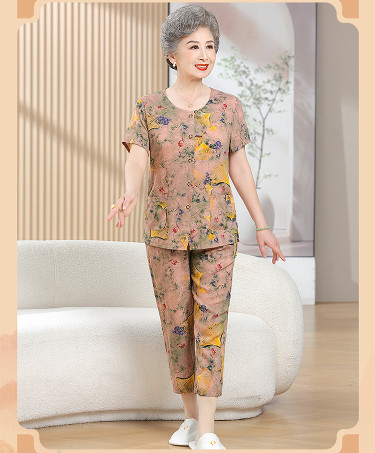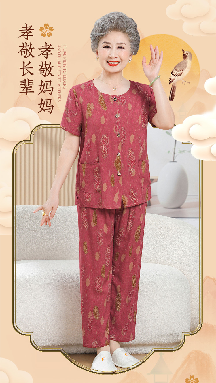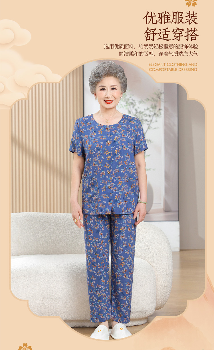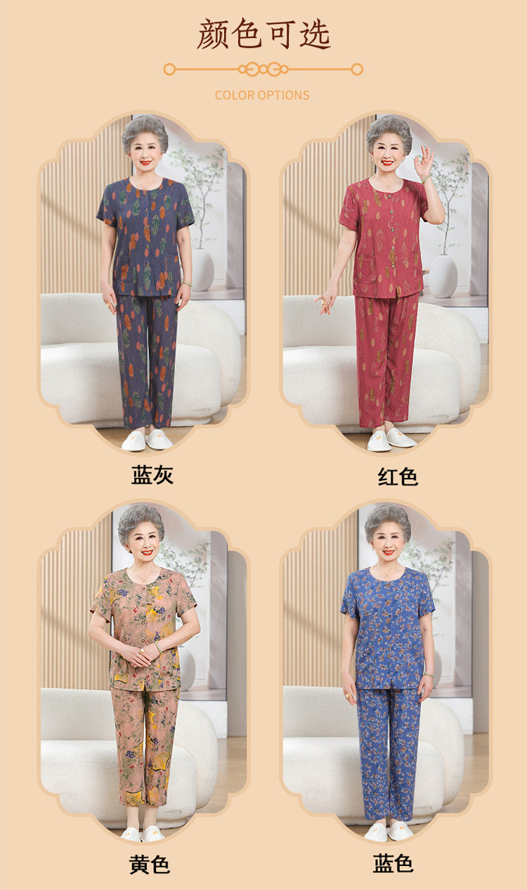 中老年女装短袖长裤棉绸套装奶奶夏装人造棉妈妈开衫两件套老太太