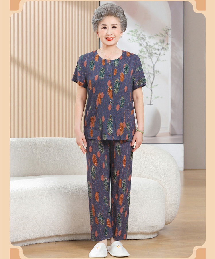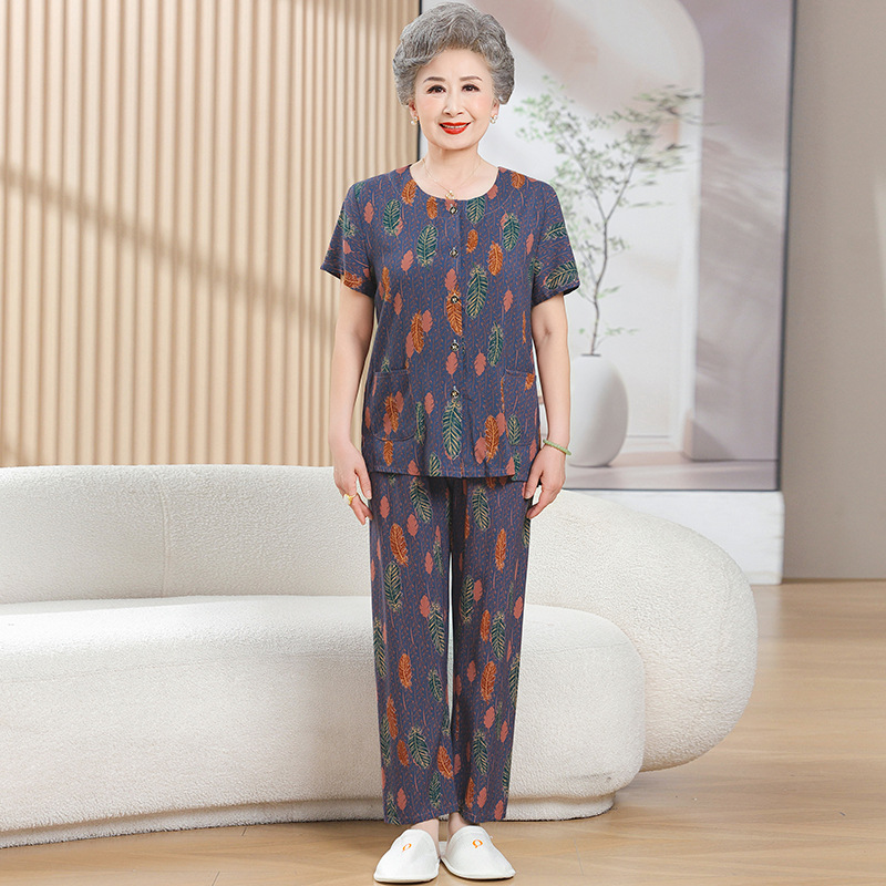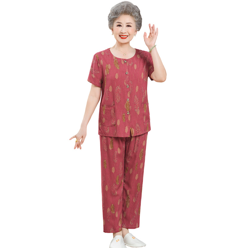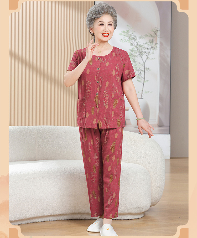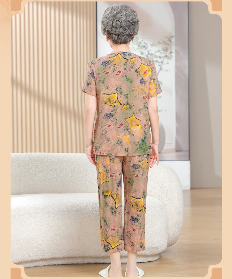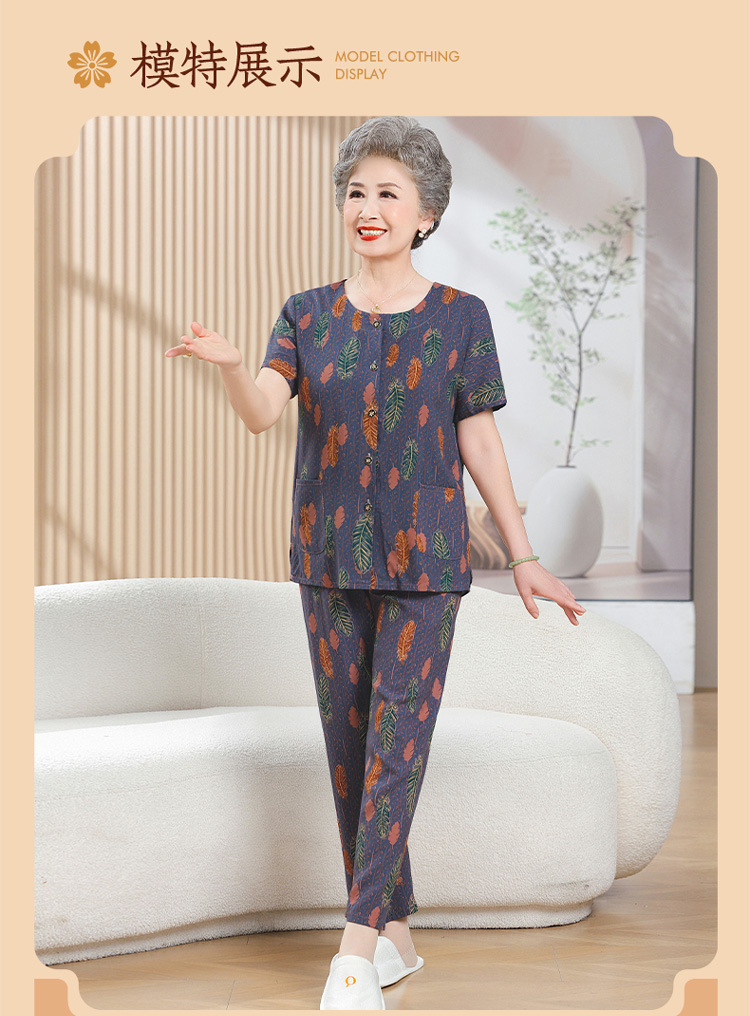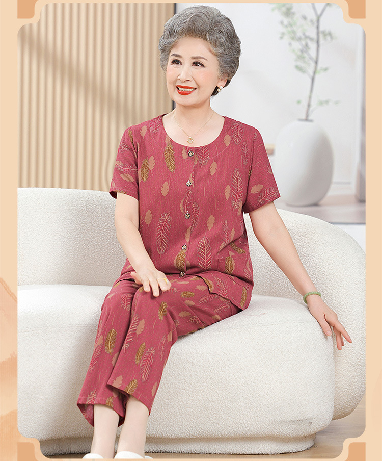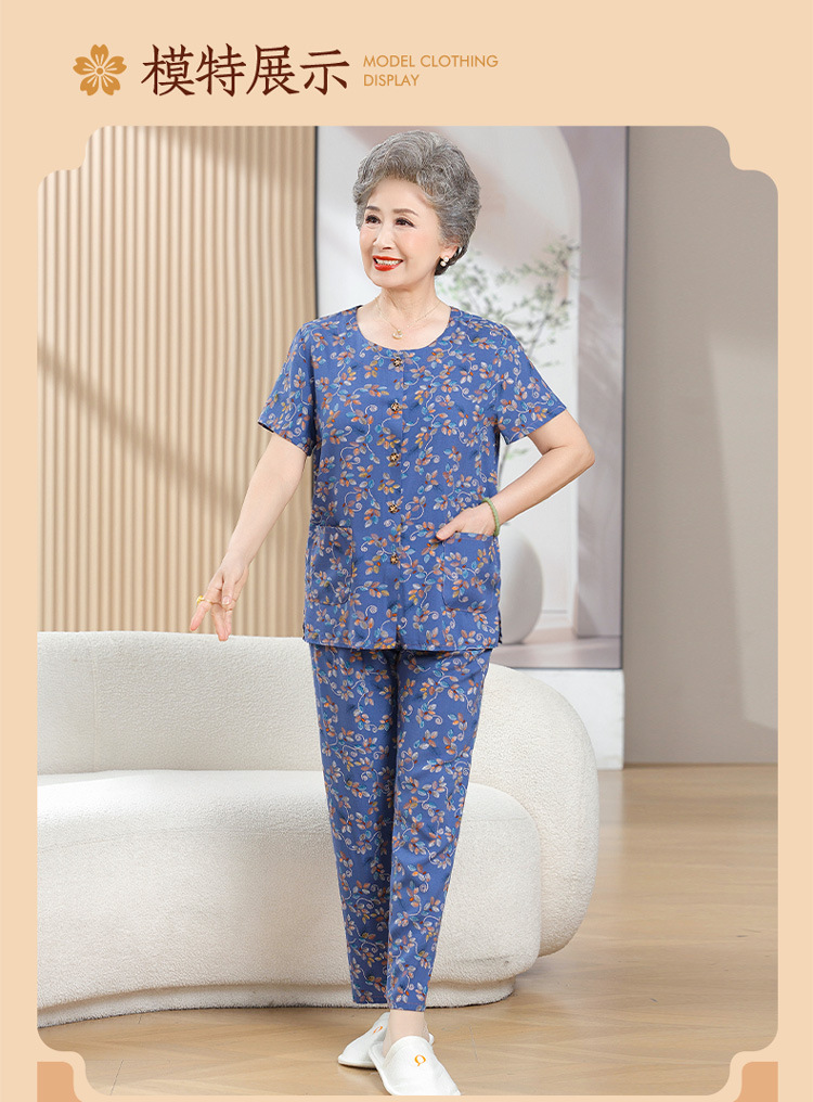 中老年女装短袖长裤棉绸套装奶奶夏装人造棉妈妈开衫两件套老太太
