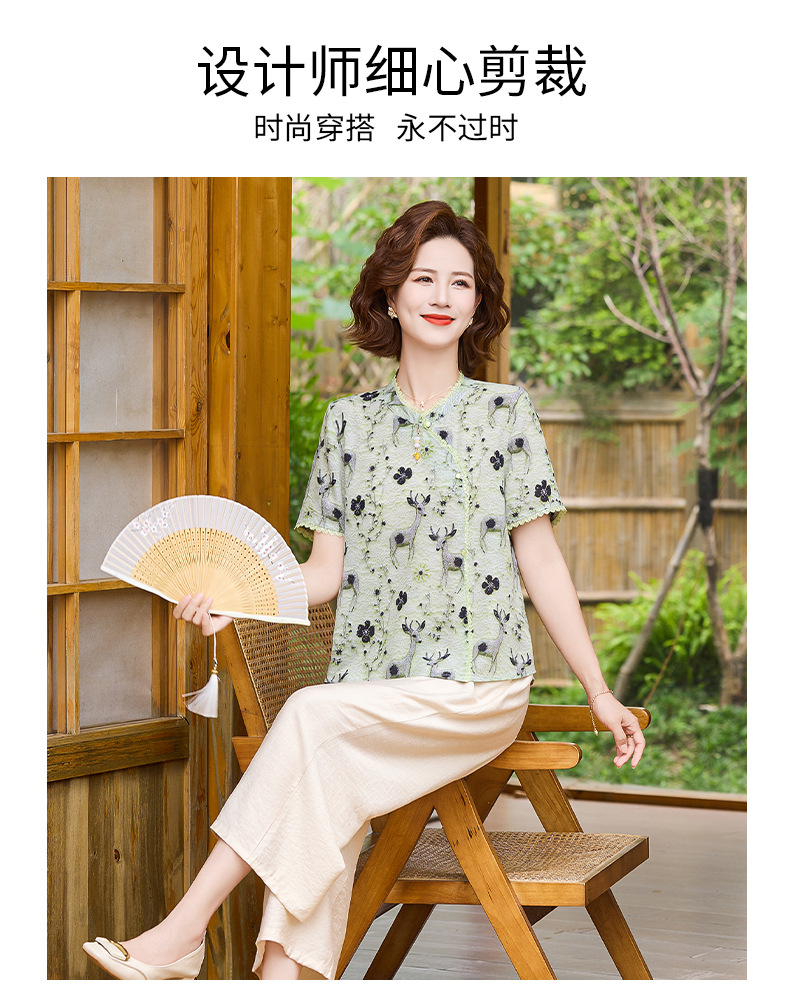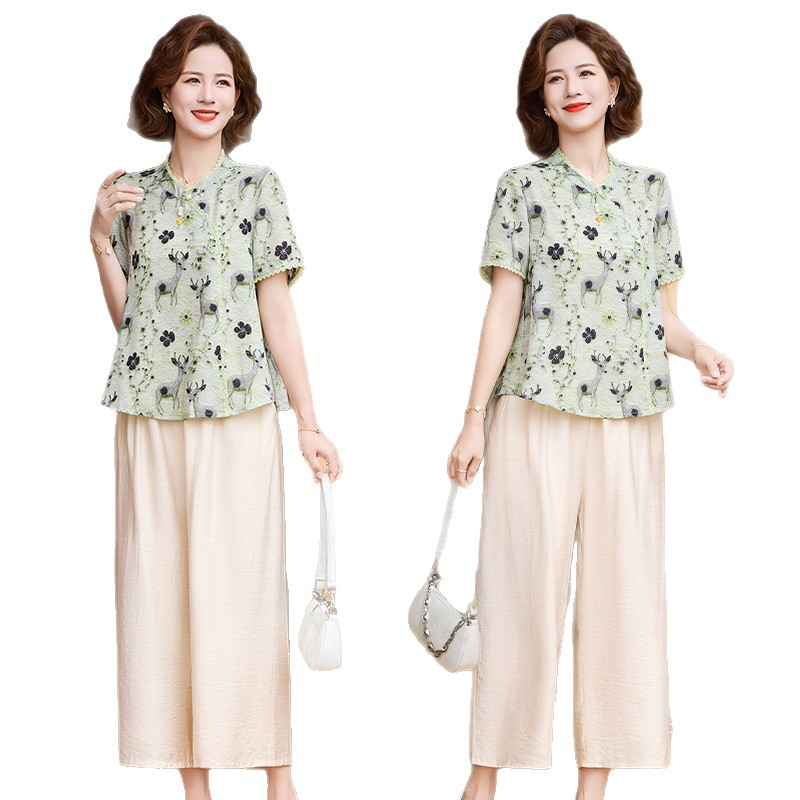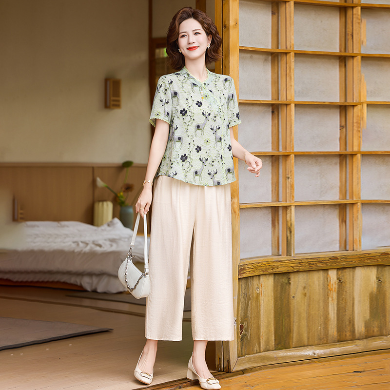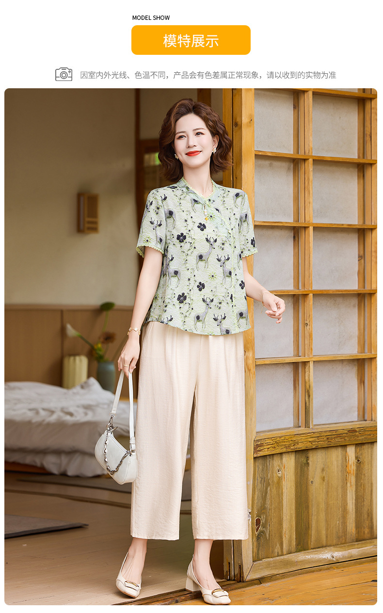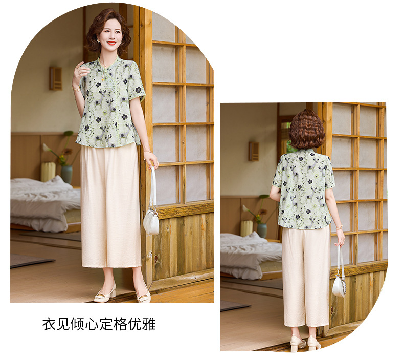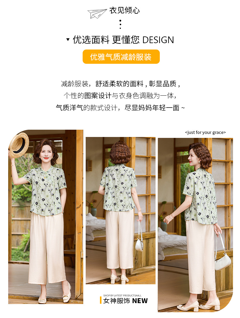 夏季妈妈短袖套装2025新款中老年印花短袖上衣洋气婆婆大码两件套