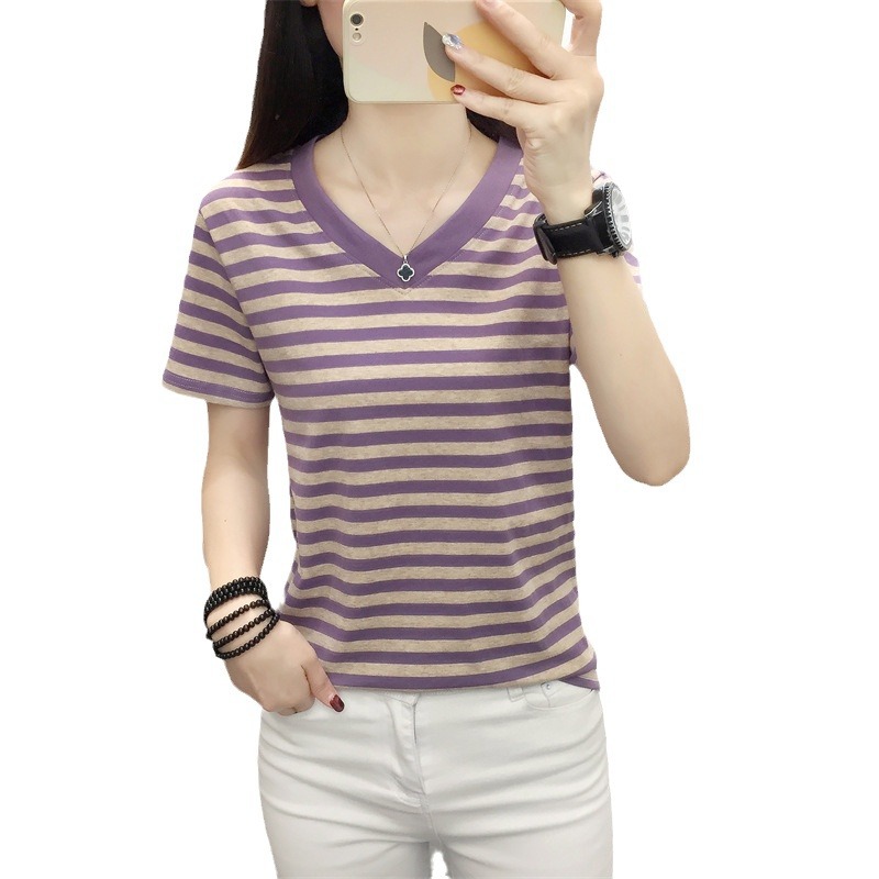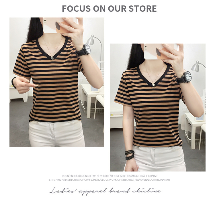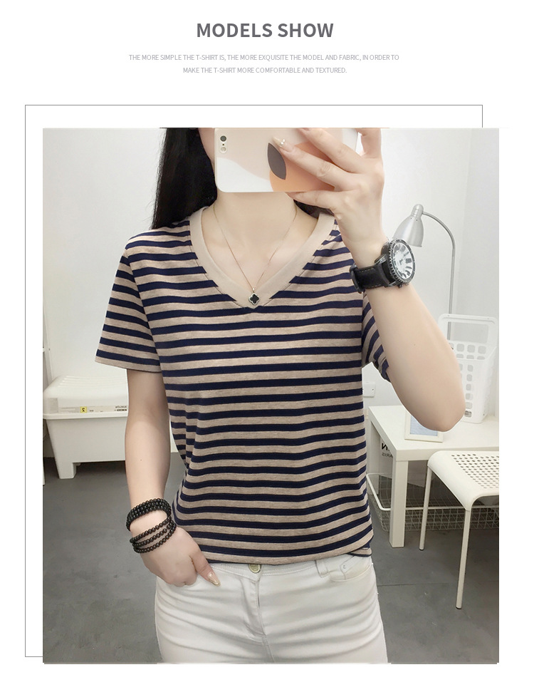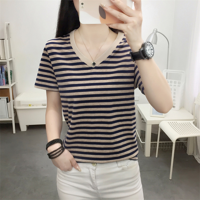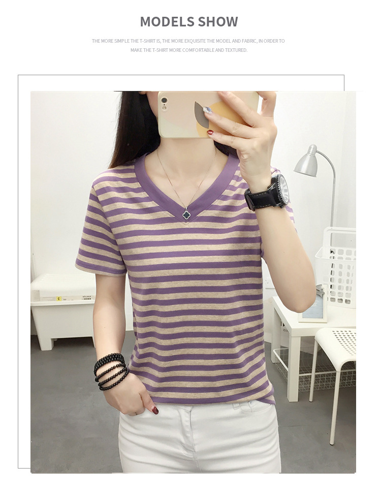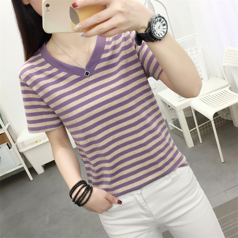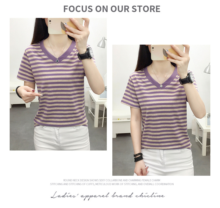 胖mm大码宽松纯棉短袖T恤女装中年妈妈夏装条纹体恤衫半袖上衣服