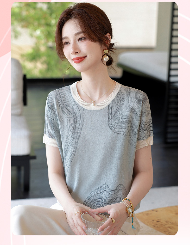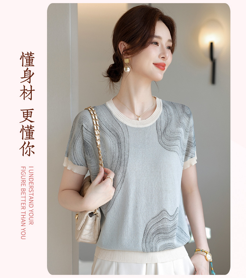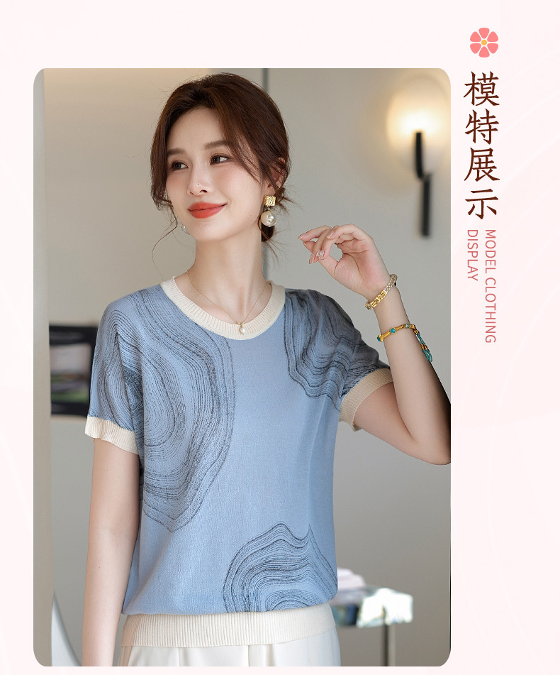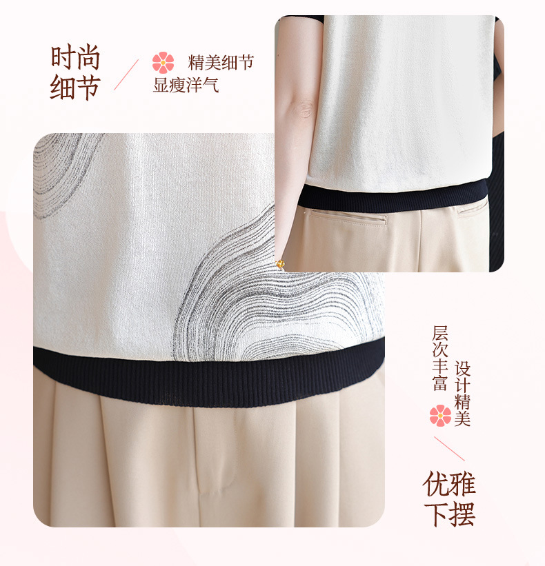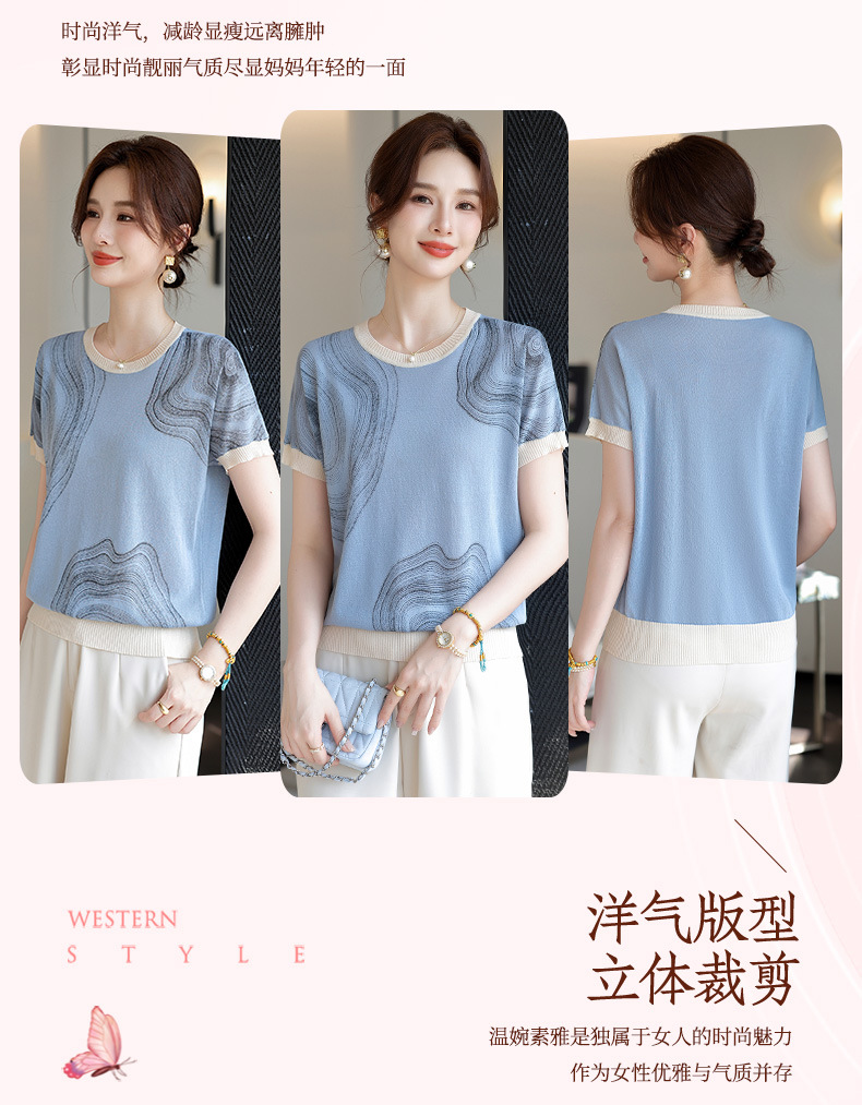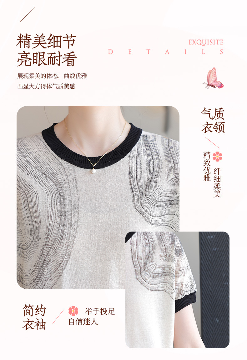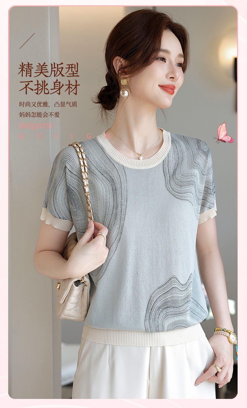 妈妈装设计感印花针织衫短袖2025新款时尚休闲显瘦中老年女装上衣