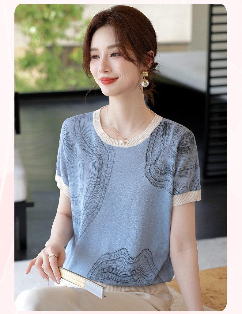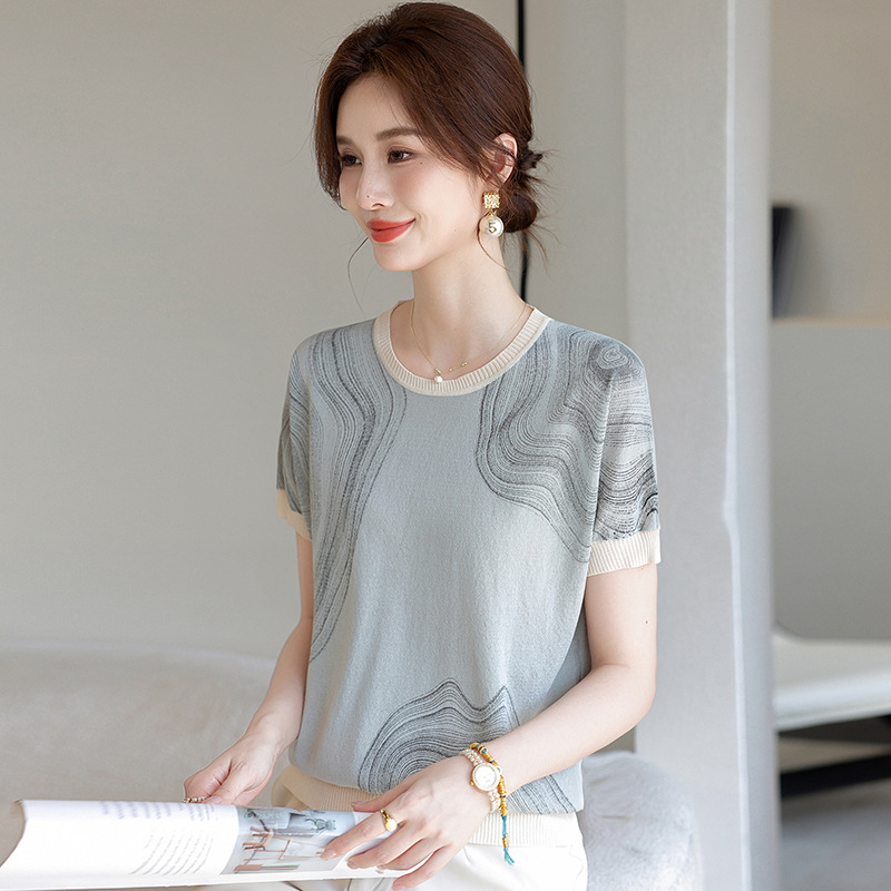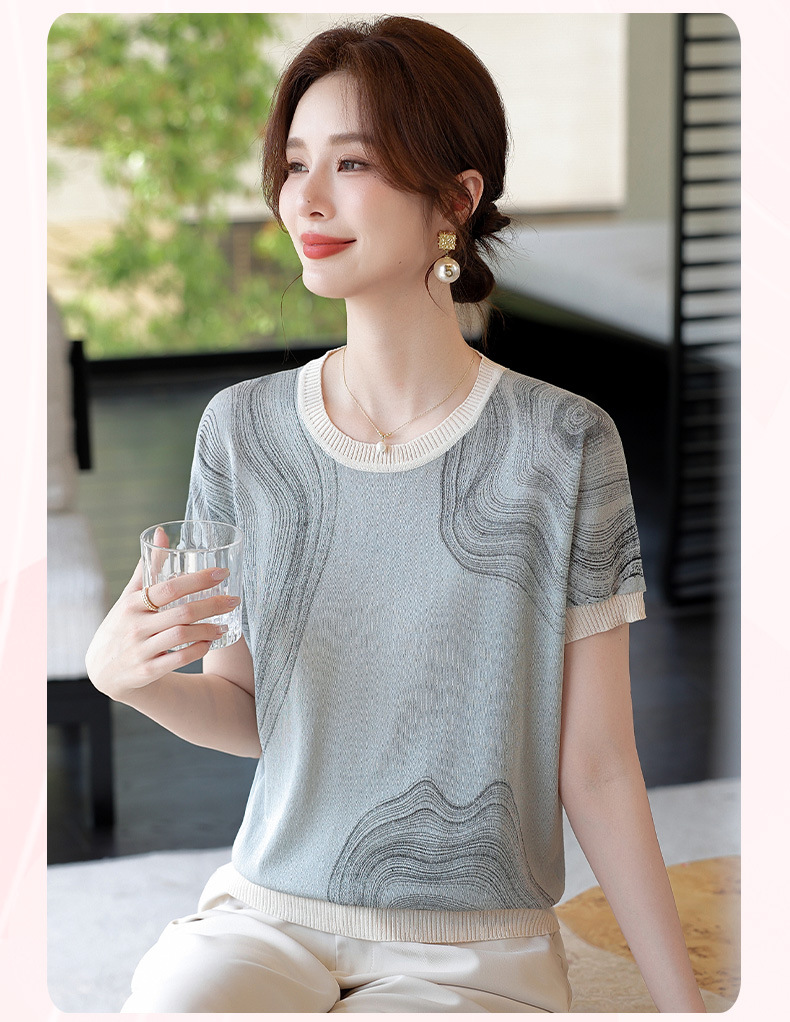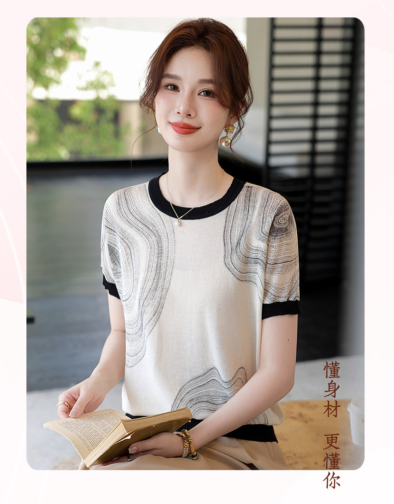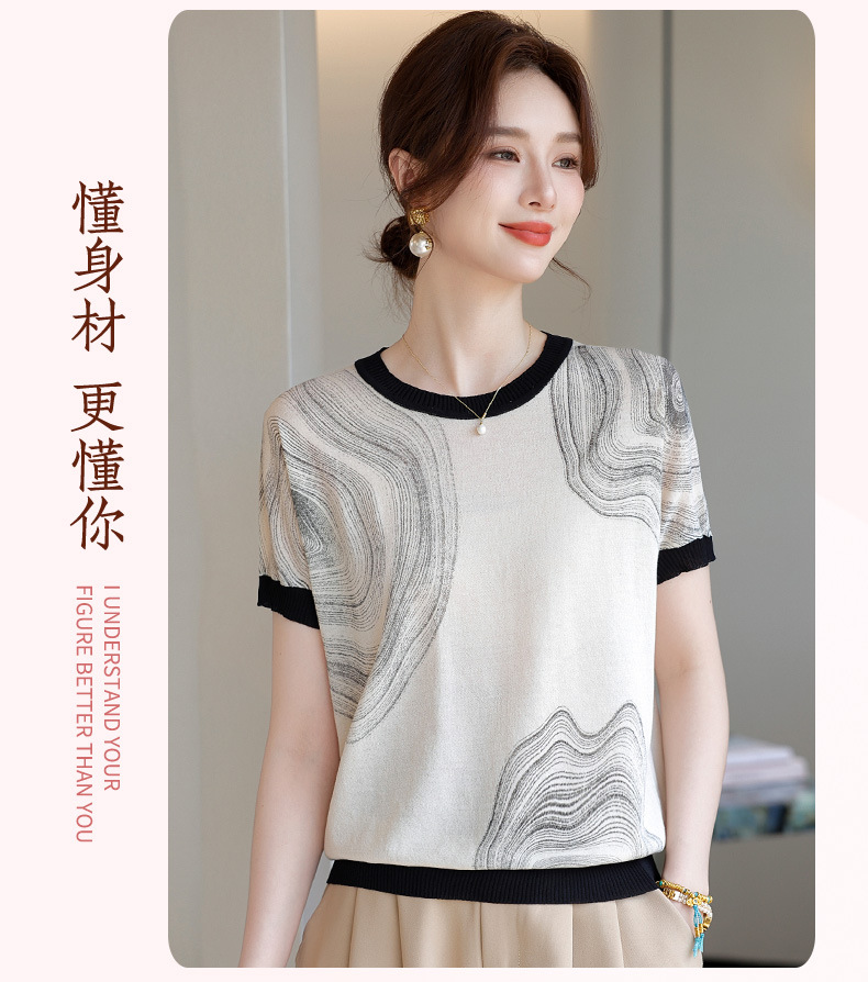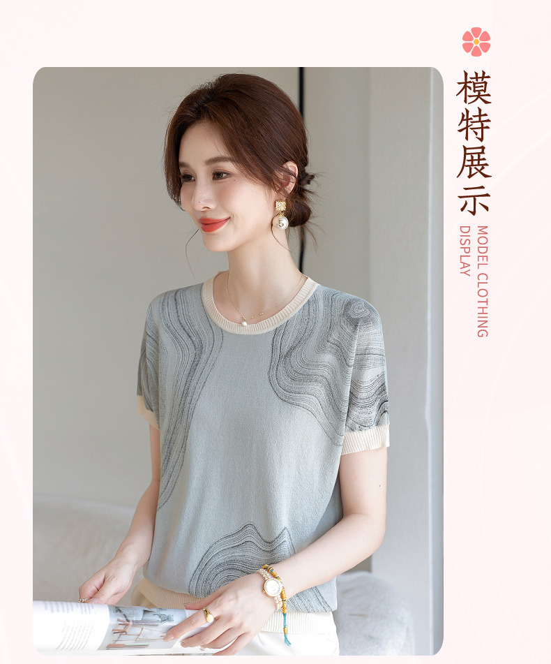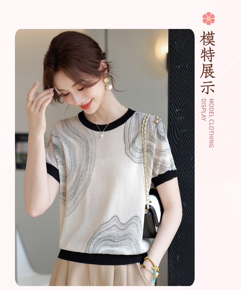 妈妈装设计感印花针织衫短袖2025新款时尚休闲显瘦中老年女装上衣