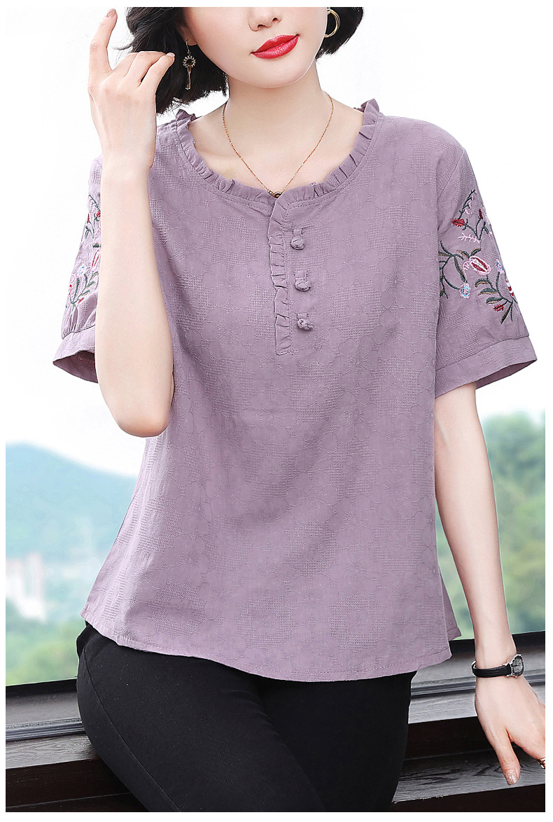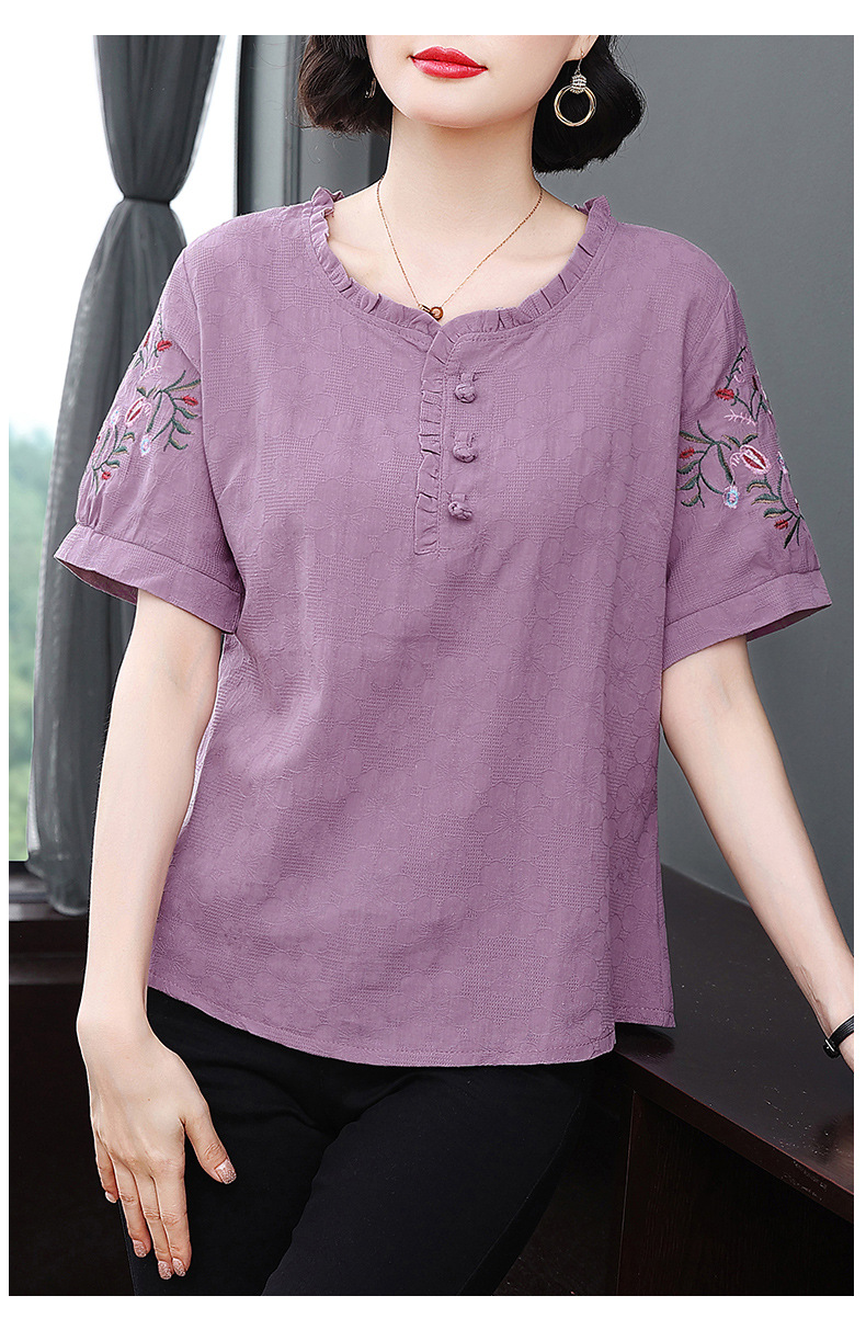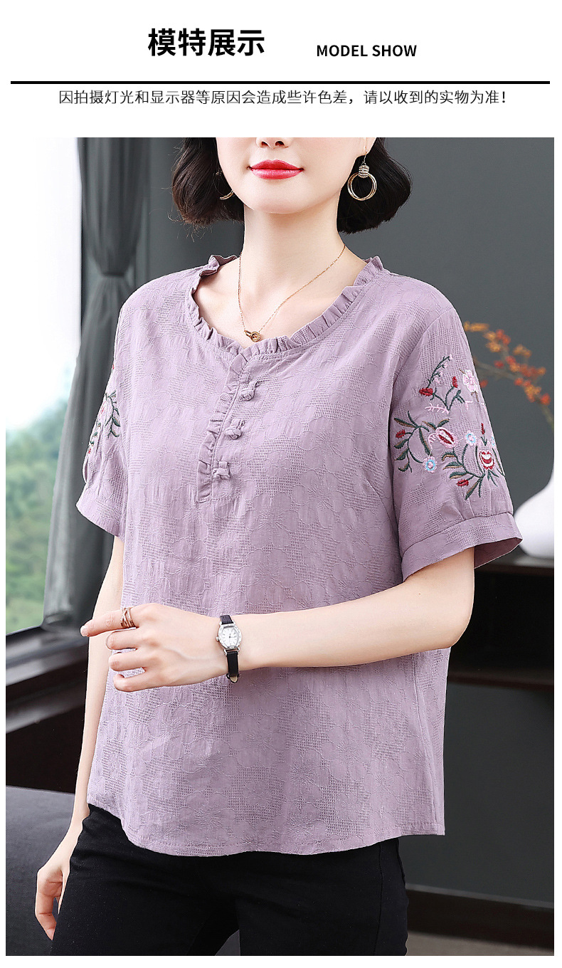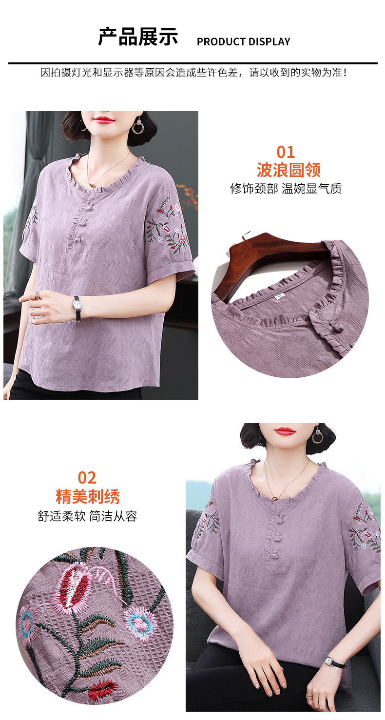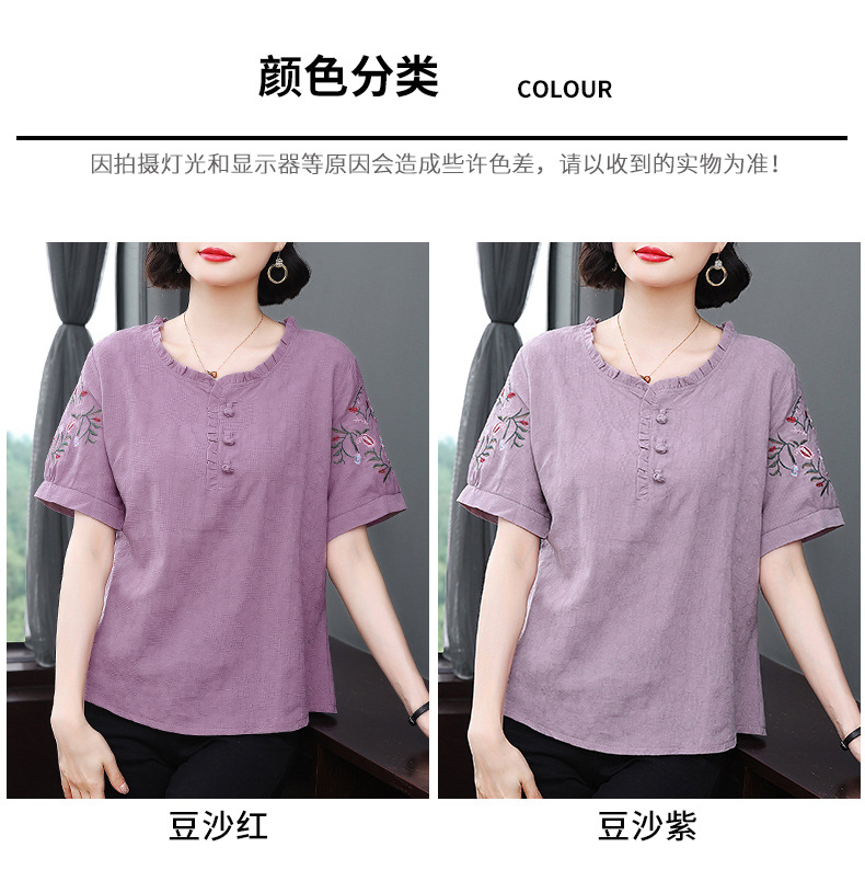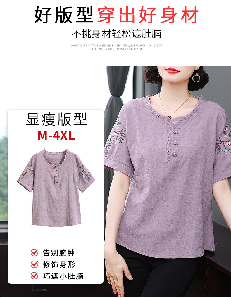 中年妈妈夏装棉麻宽松2025新款刺绣短袖t恤上衣大码中老年女装