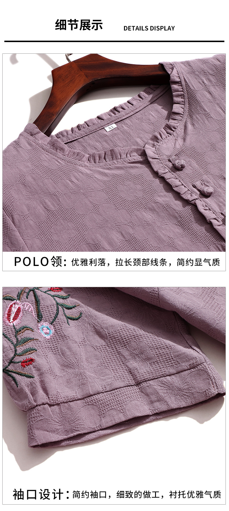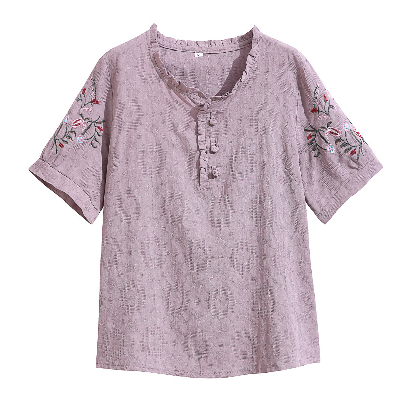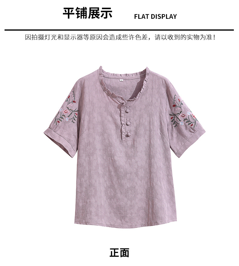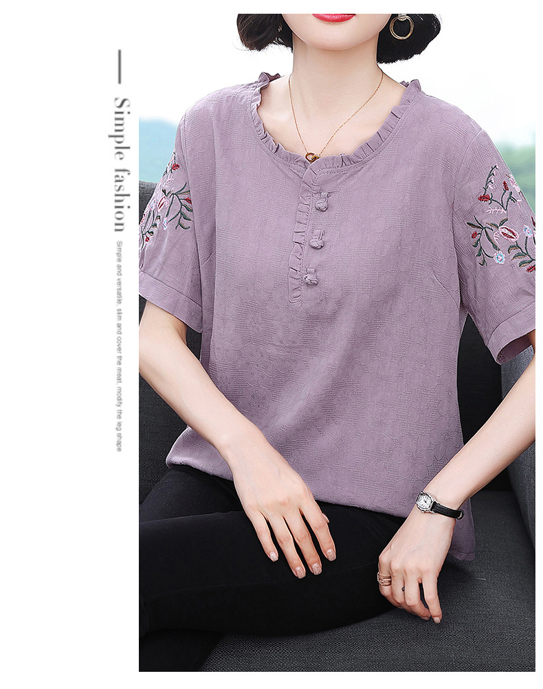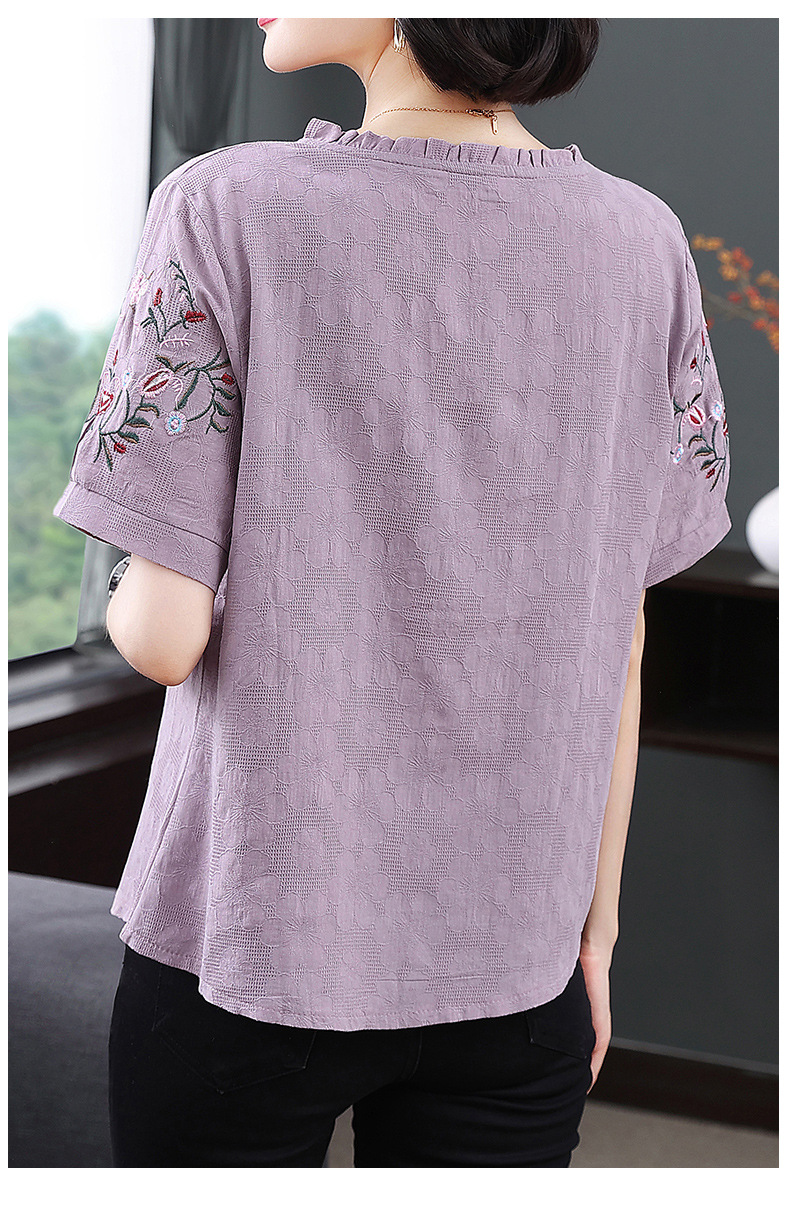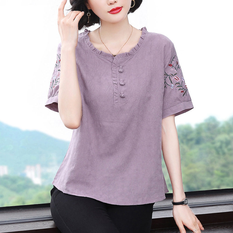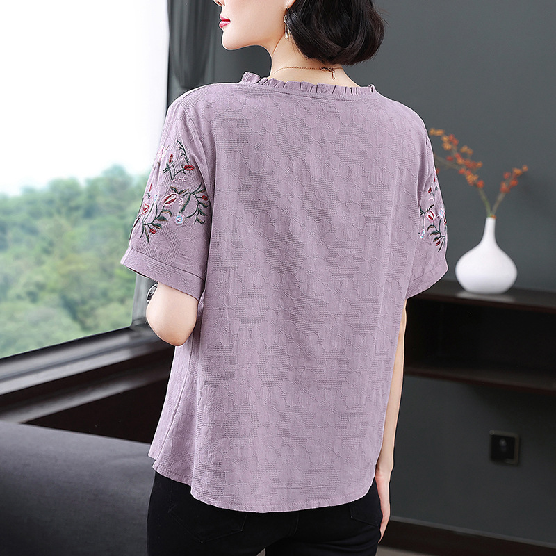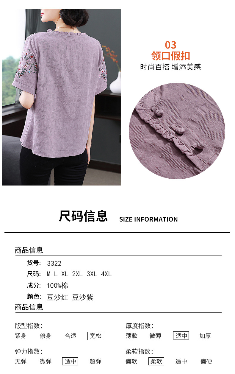 中年妈妈夏装棉麻宽松2025新款刺绣短袖t恤上衣大码中老年女装