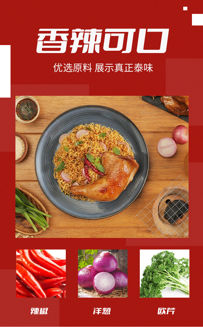 | thai spicy roast chicken flavor noodles served with sauce 350g(泰式香辣烤鸡味干拌面350g) | USD $3.05 | 18 piece available |