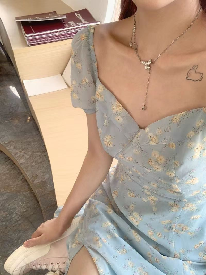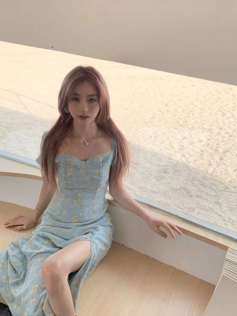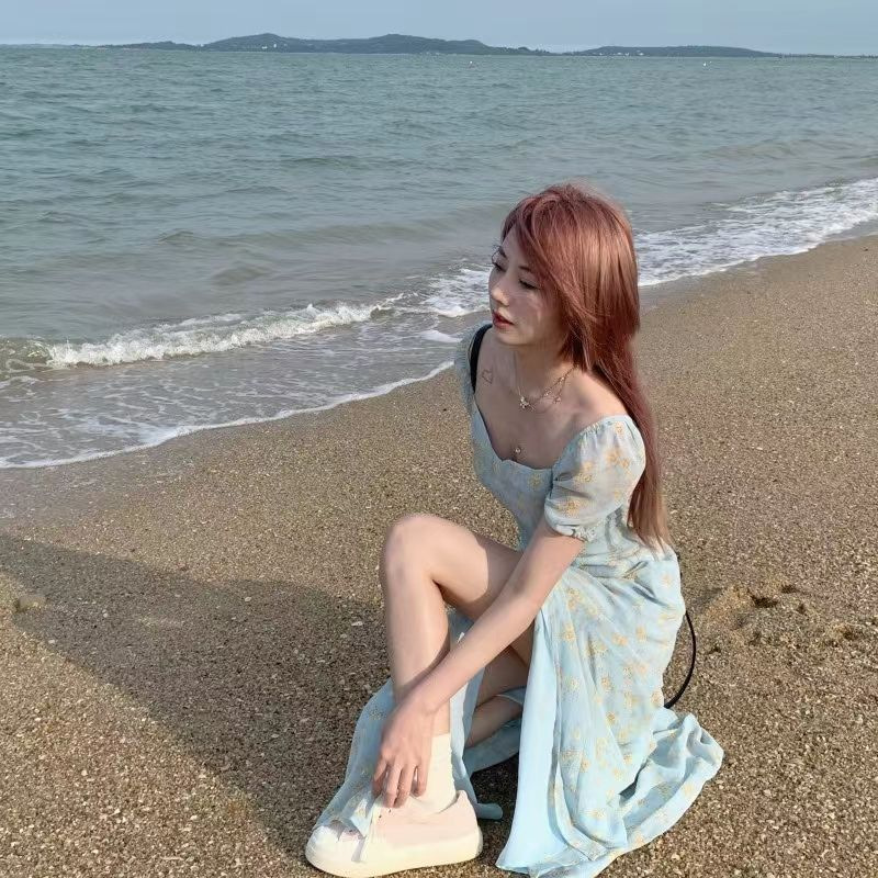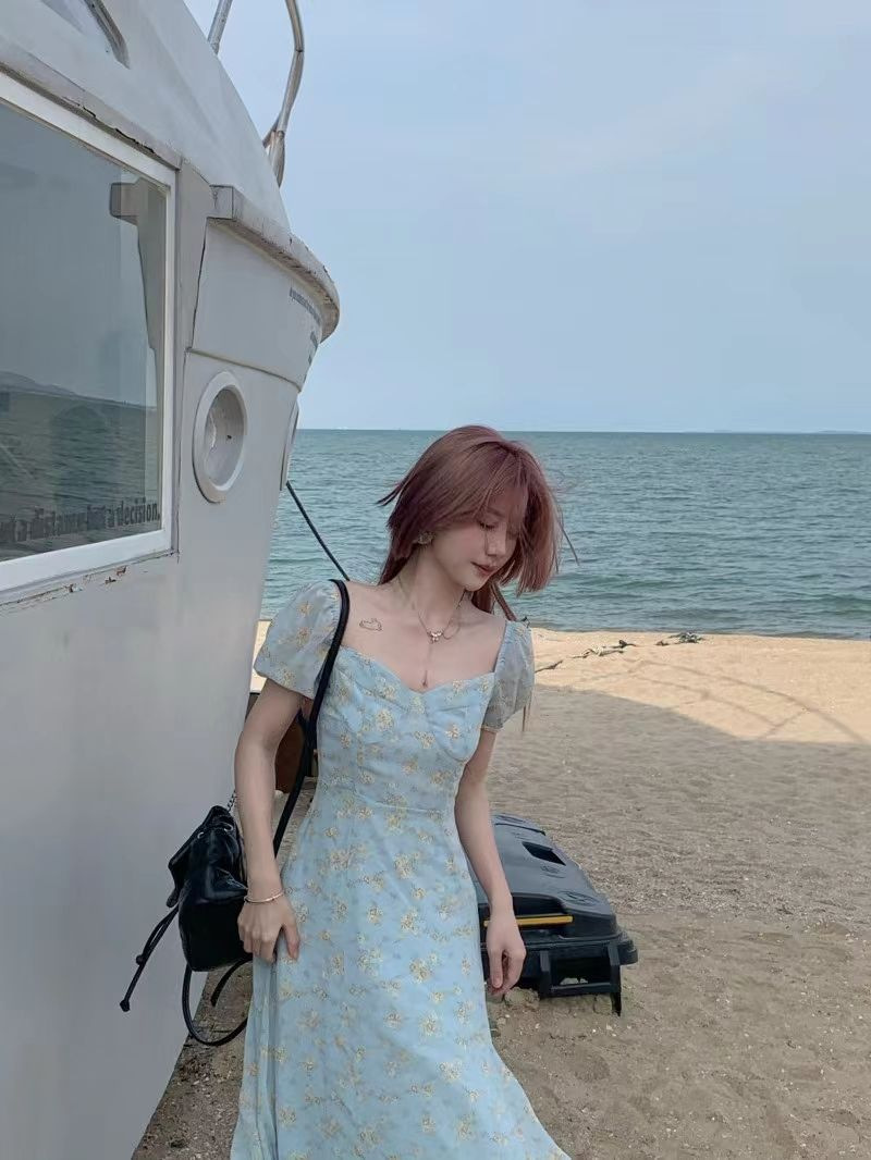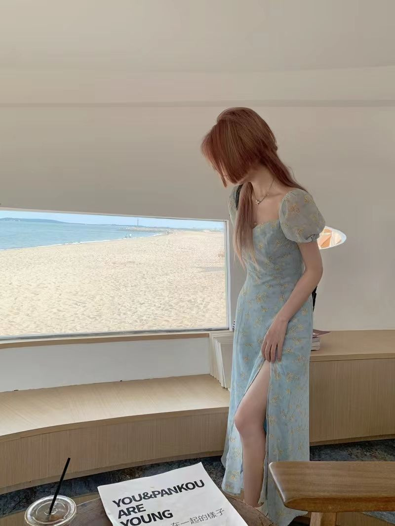 茶歇法式泡泡袖碎花连衣裙仙女夏季气质感高级感海边度假沙滩裙子