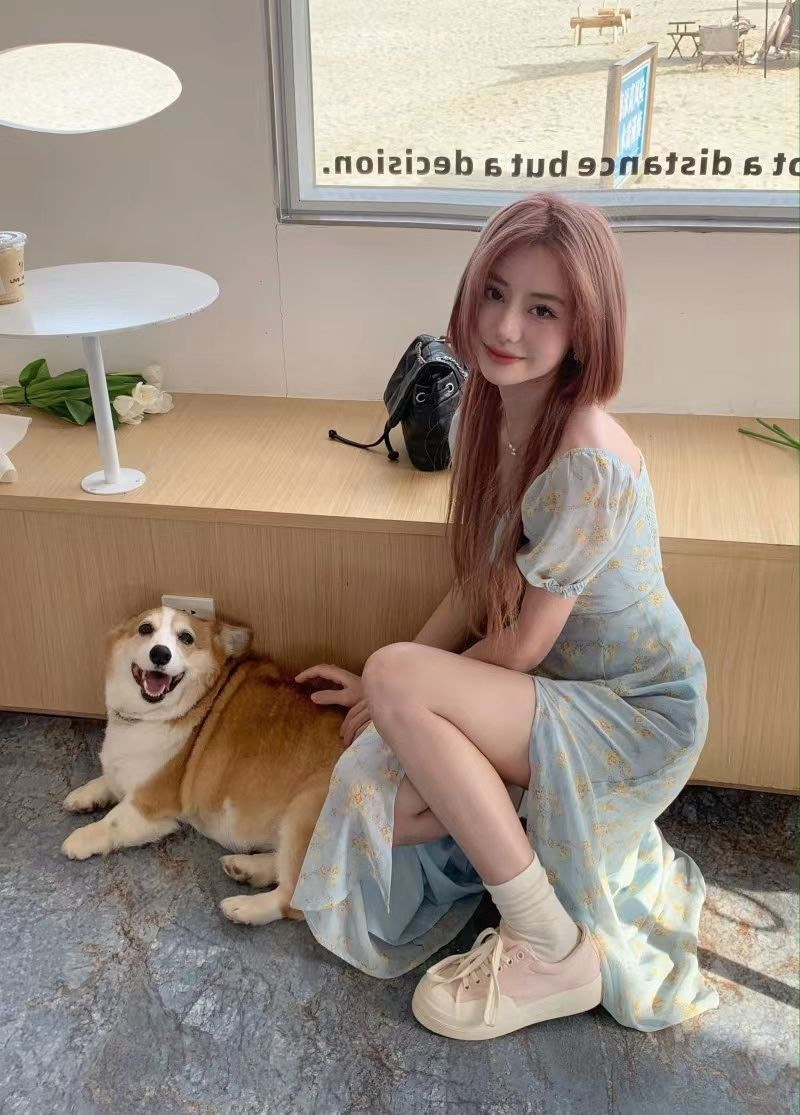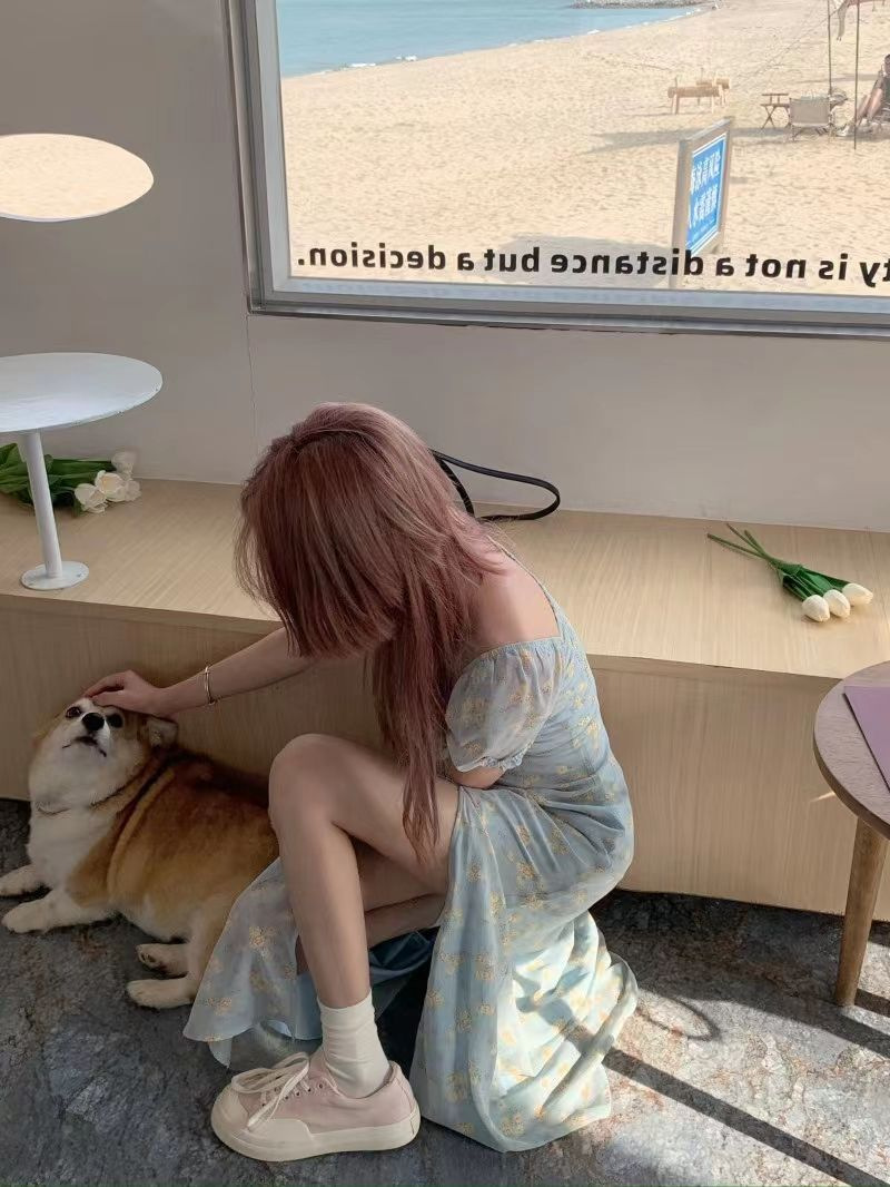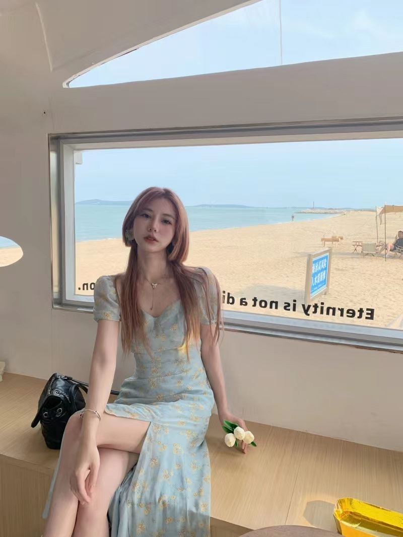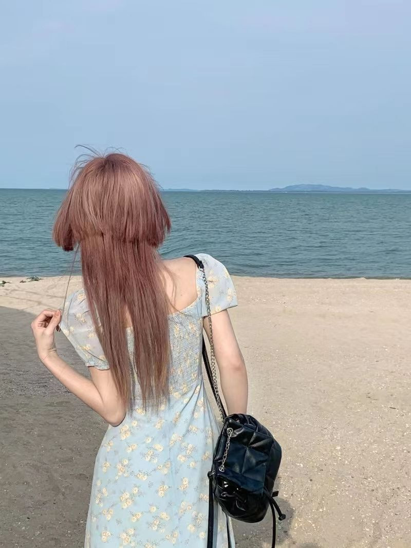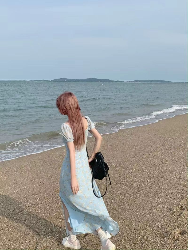 茶歇法式泡泡袖碎花连衣裙仙女夏季气质感高级感海边度假沙滩裙子