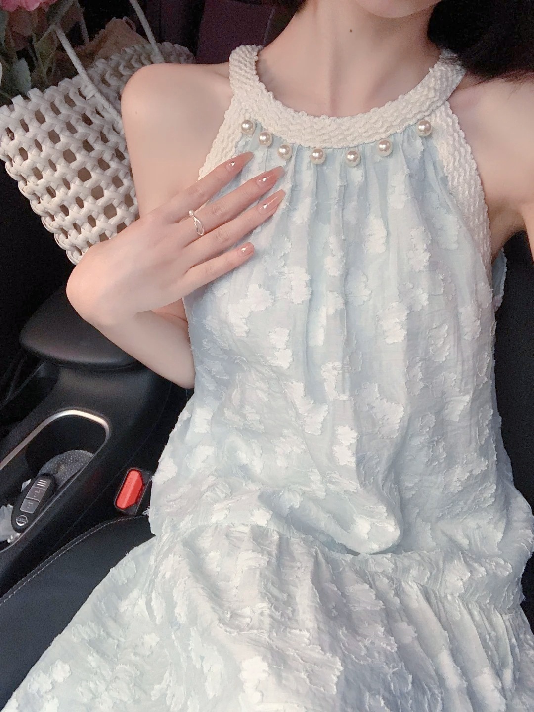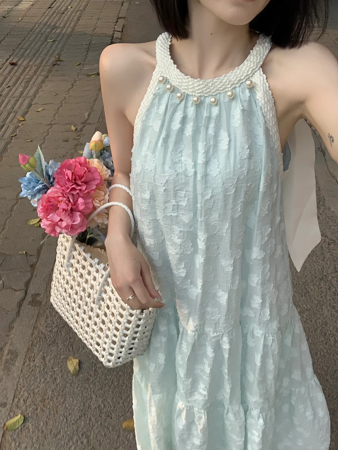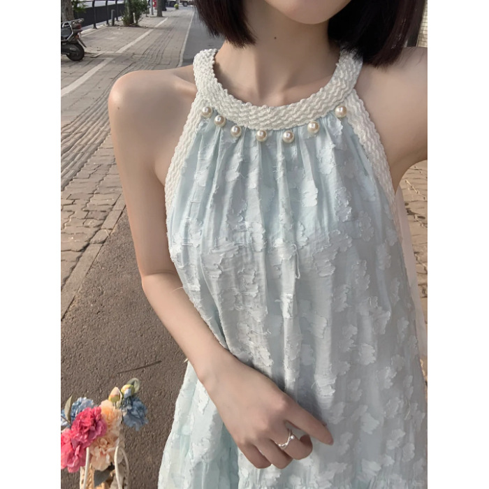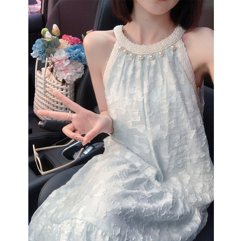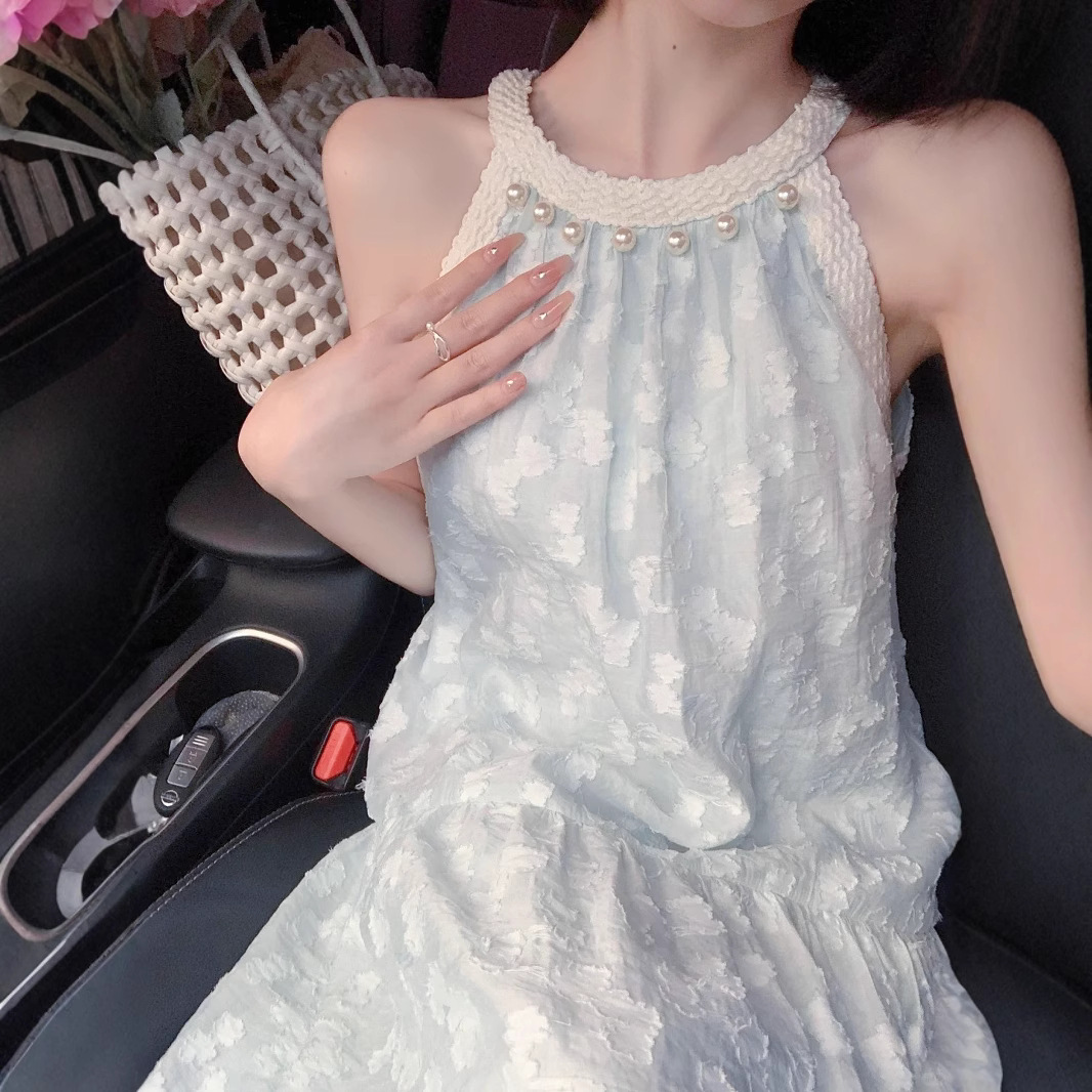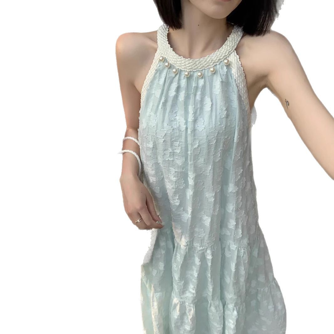 法式气质珍珠无袖挂脖连衣裙女夏季新款小众设计感海边度假风长裙