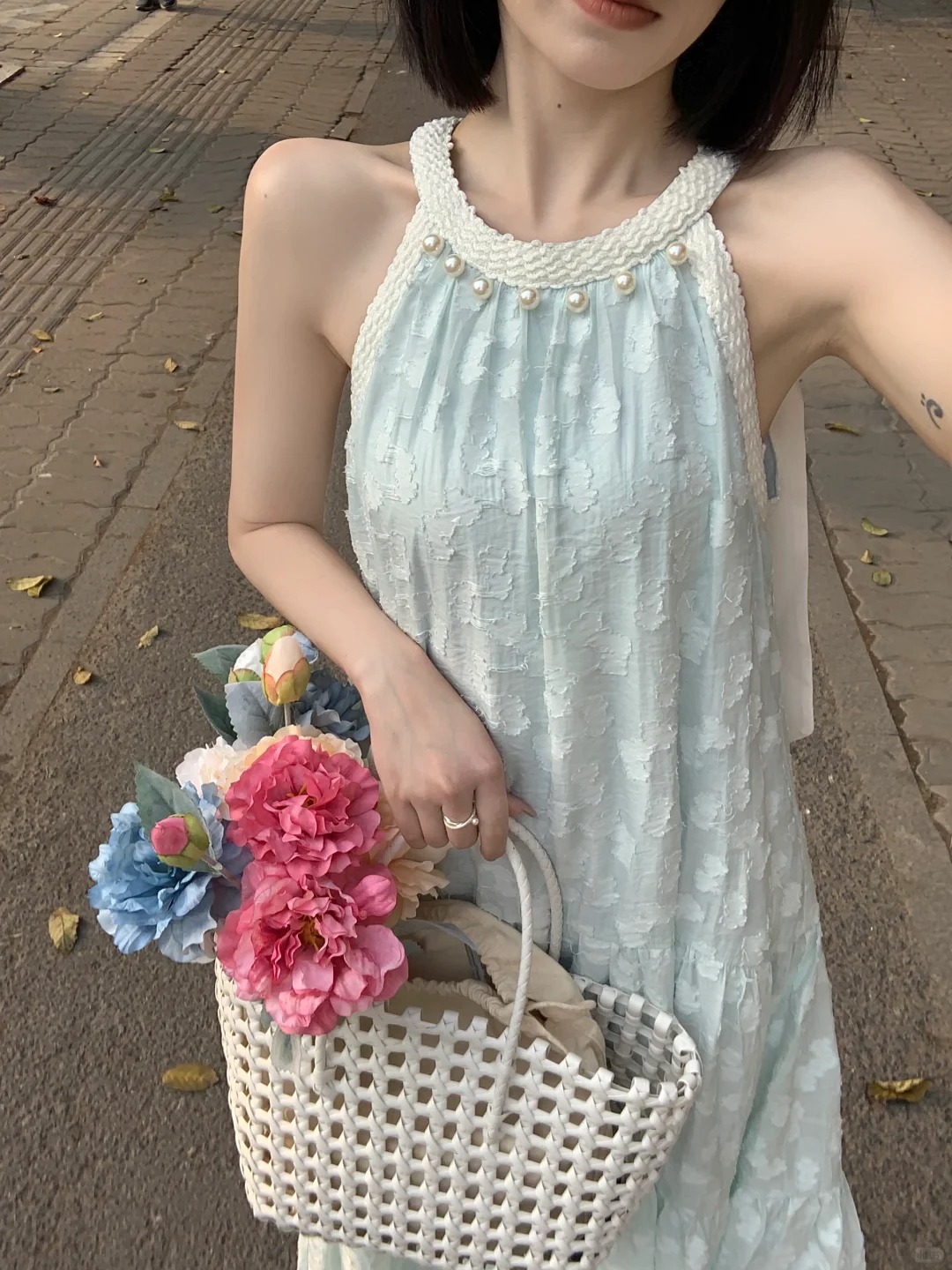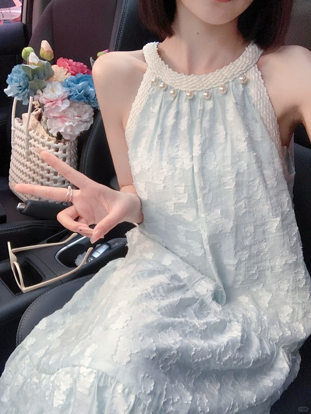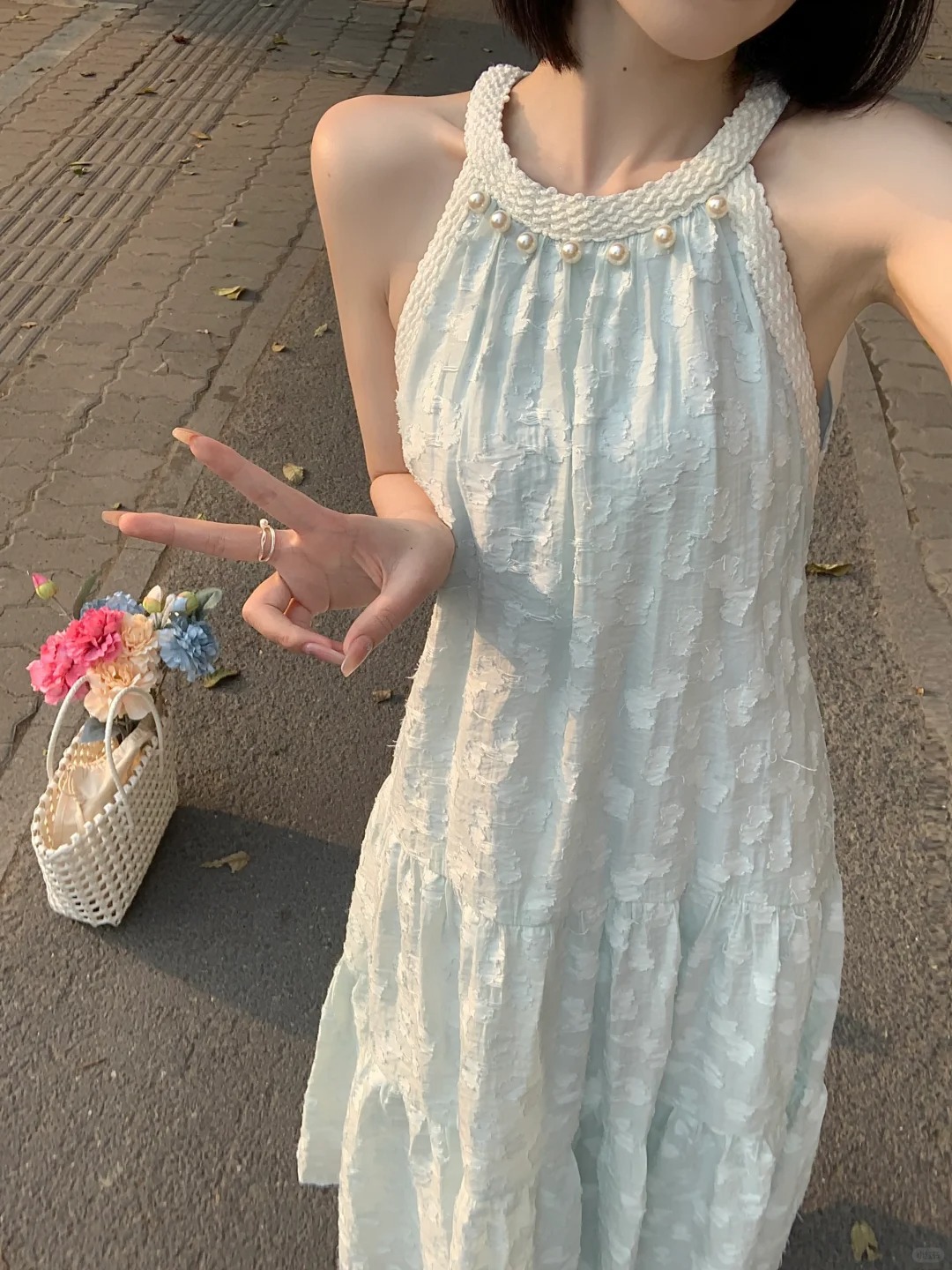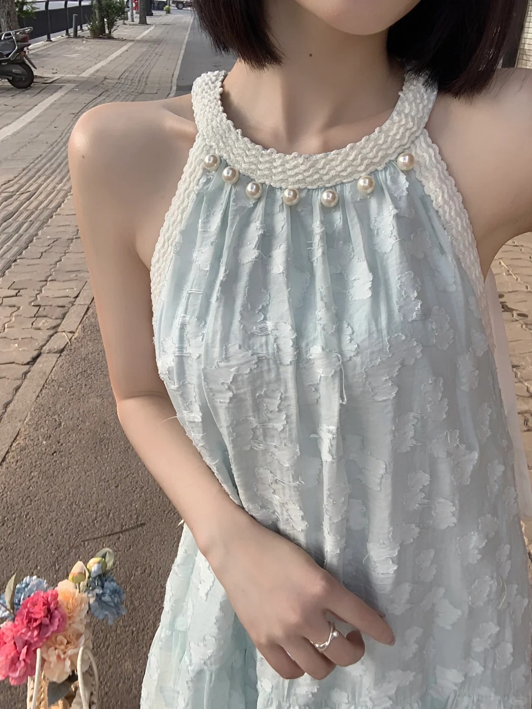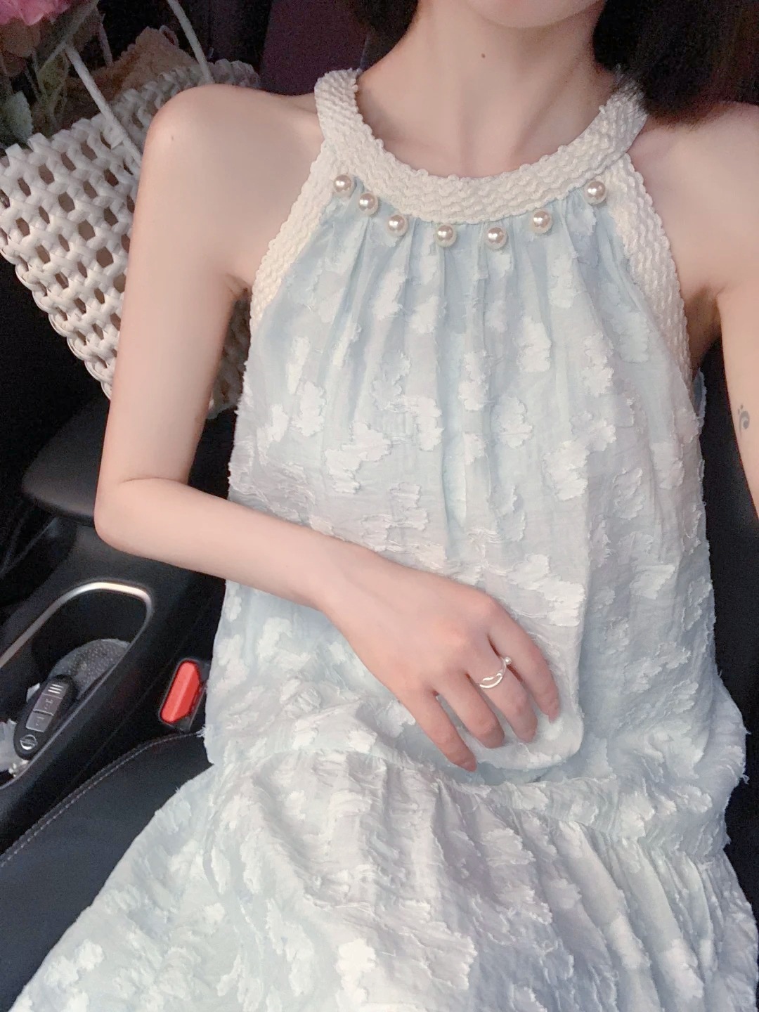 法式气质珍珠无袖挂脖连衣裙女夏季新款小众设计感海边度假风长裙