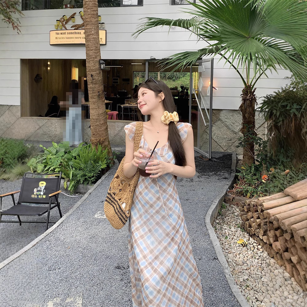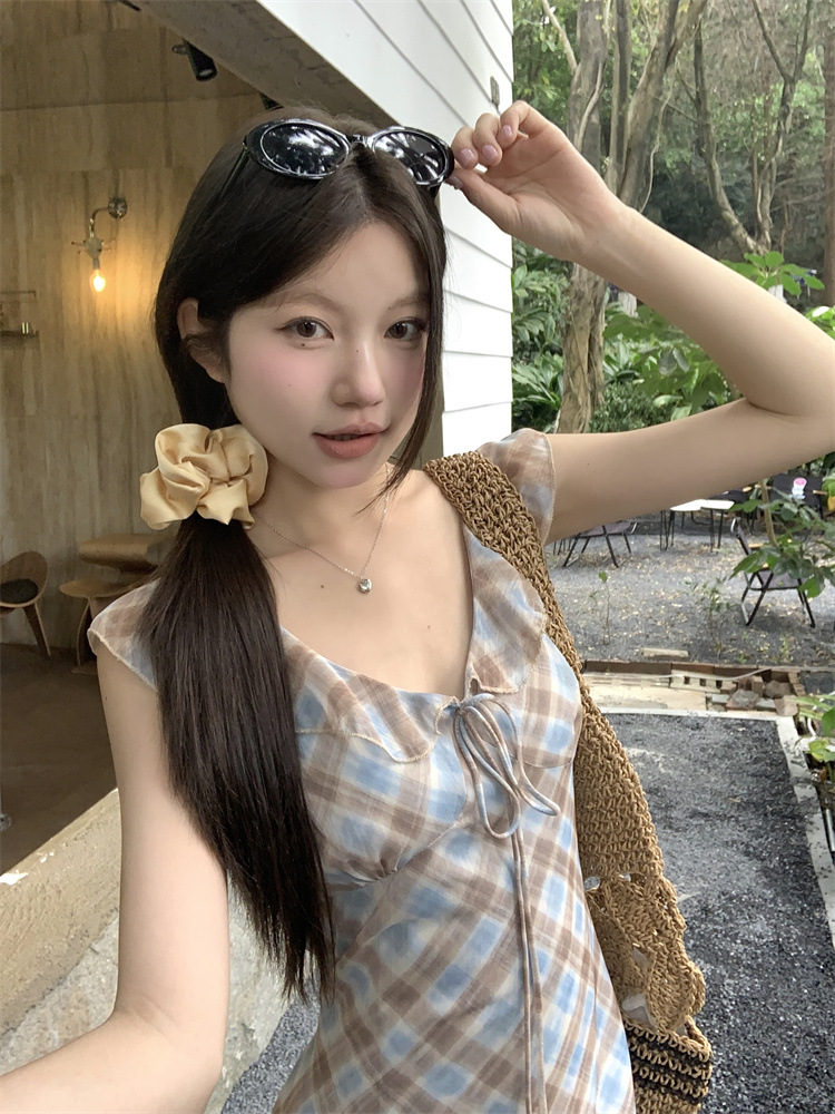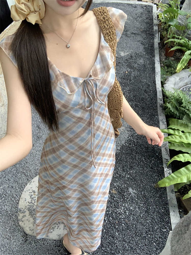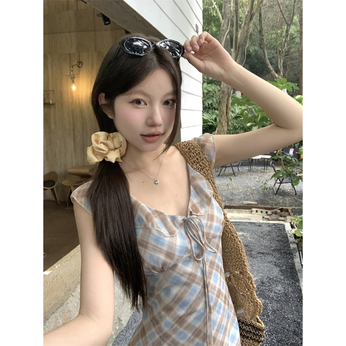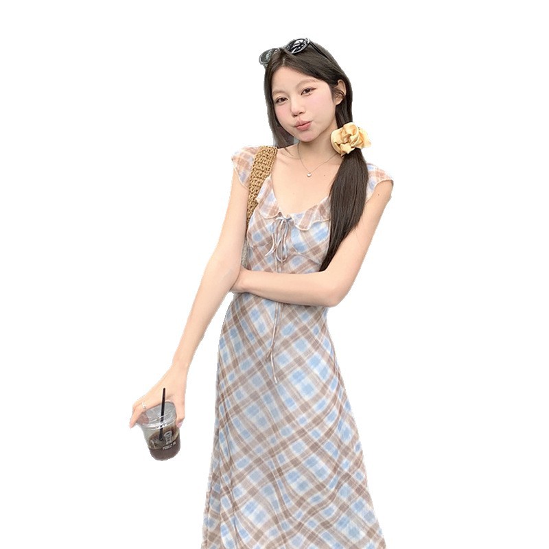 法式复古气质系带格纹连衣裙女2025夏季新款简约时尚小飞袖长裙女