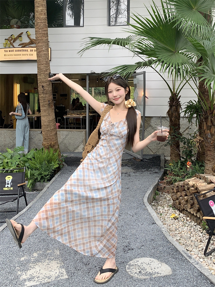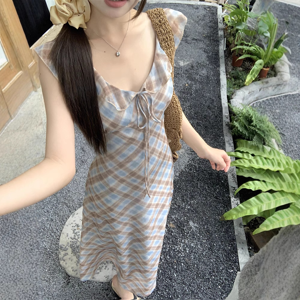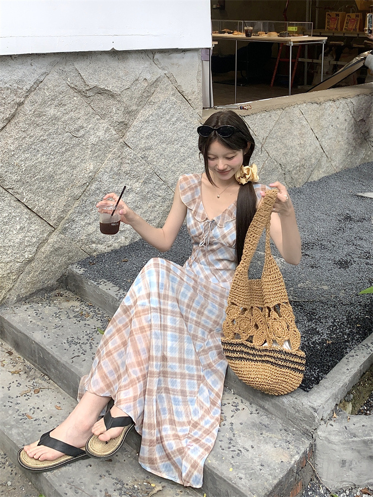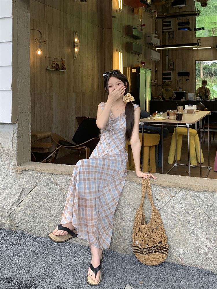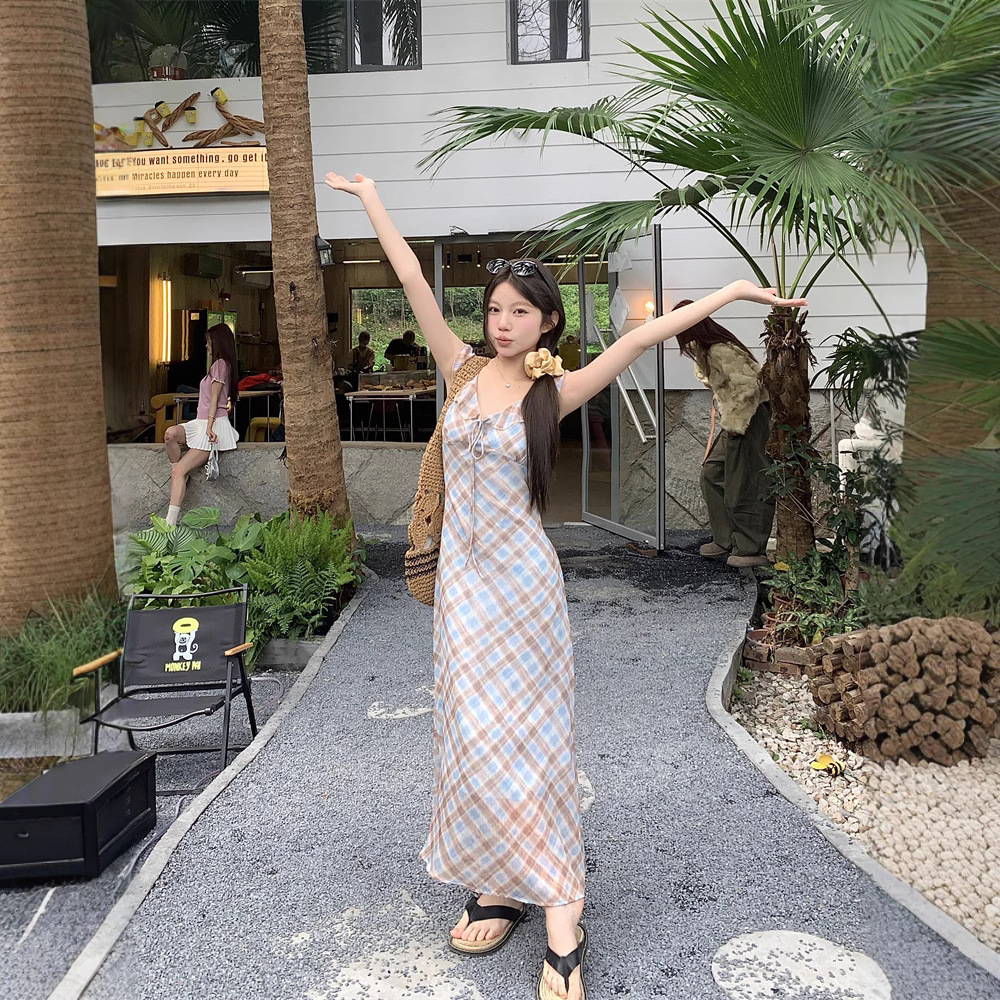 法式复古气质系带格纹连衣裙女2025夏季新款简约时尚小飞袖长裙女
