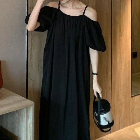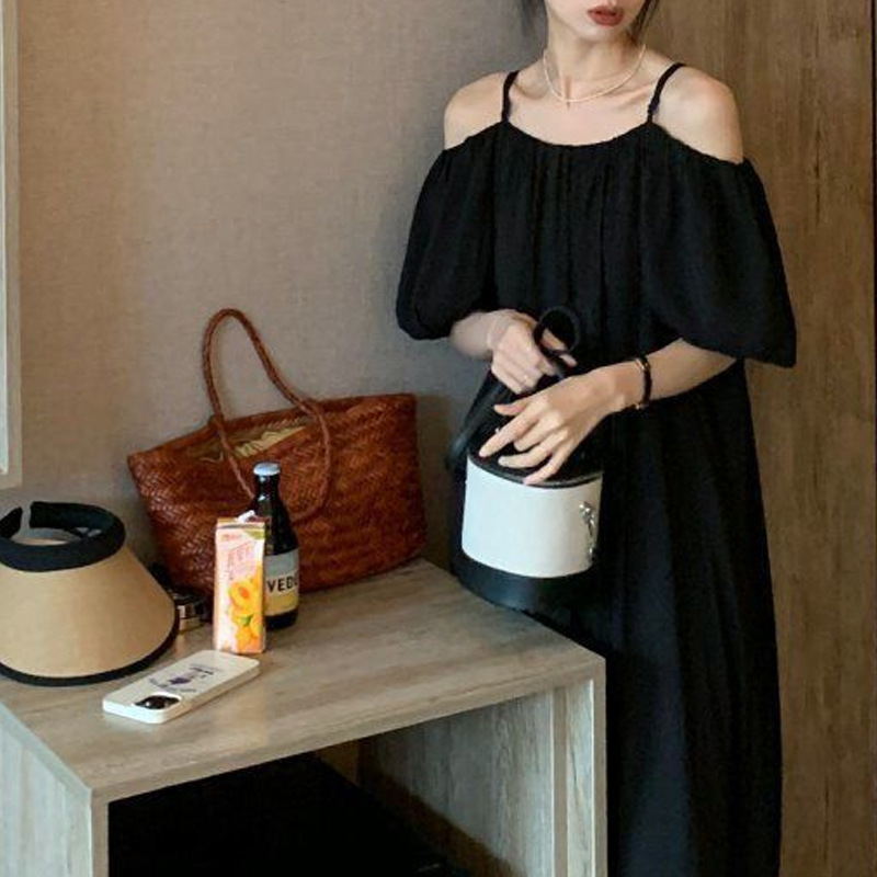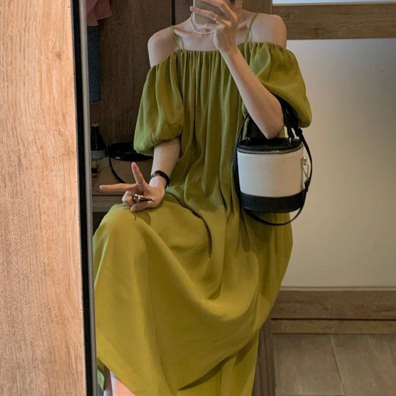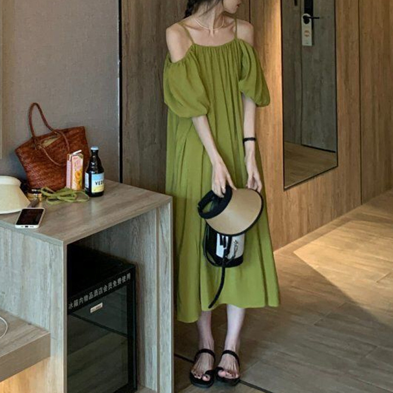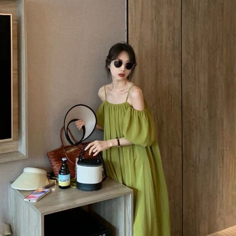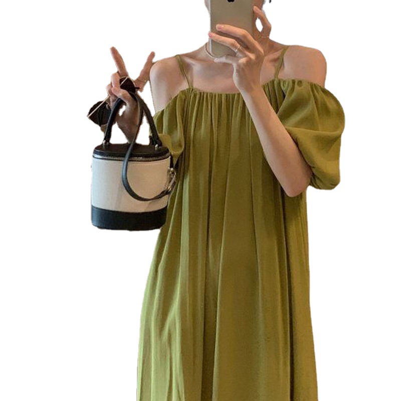 绿色露肩吊带连衣裙子女夏季2025新款法式一字肩气质显瘦沙滩长裙