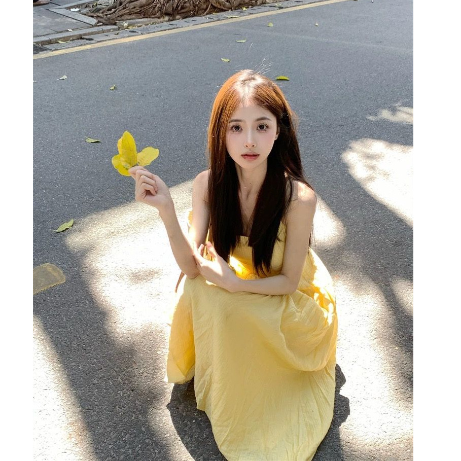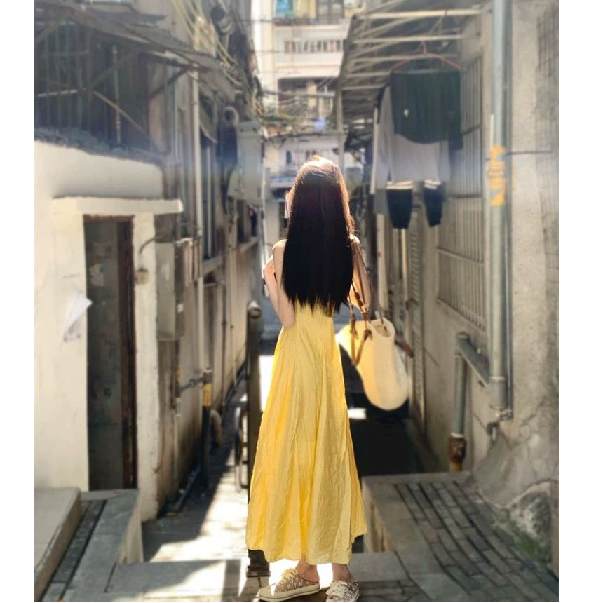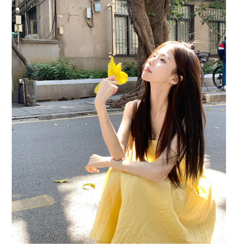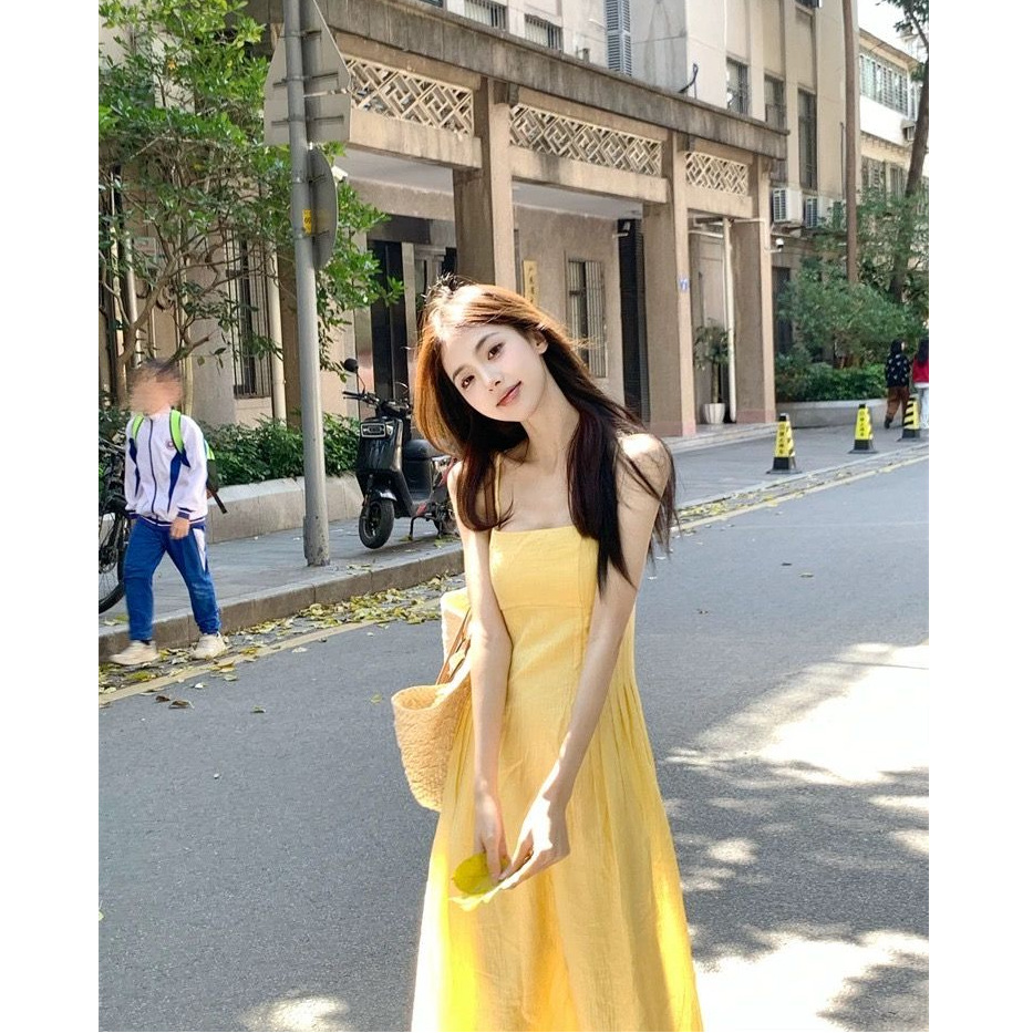 法式露背性感黄色吊带连衣裙2025夏季新款吊带裙收腰长裙度假裙子