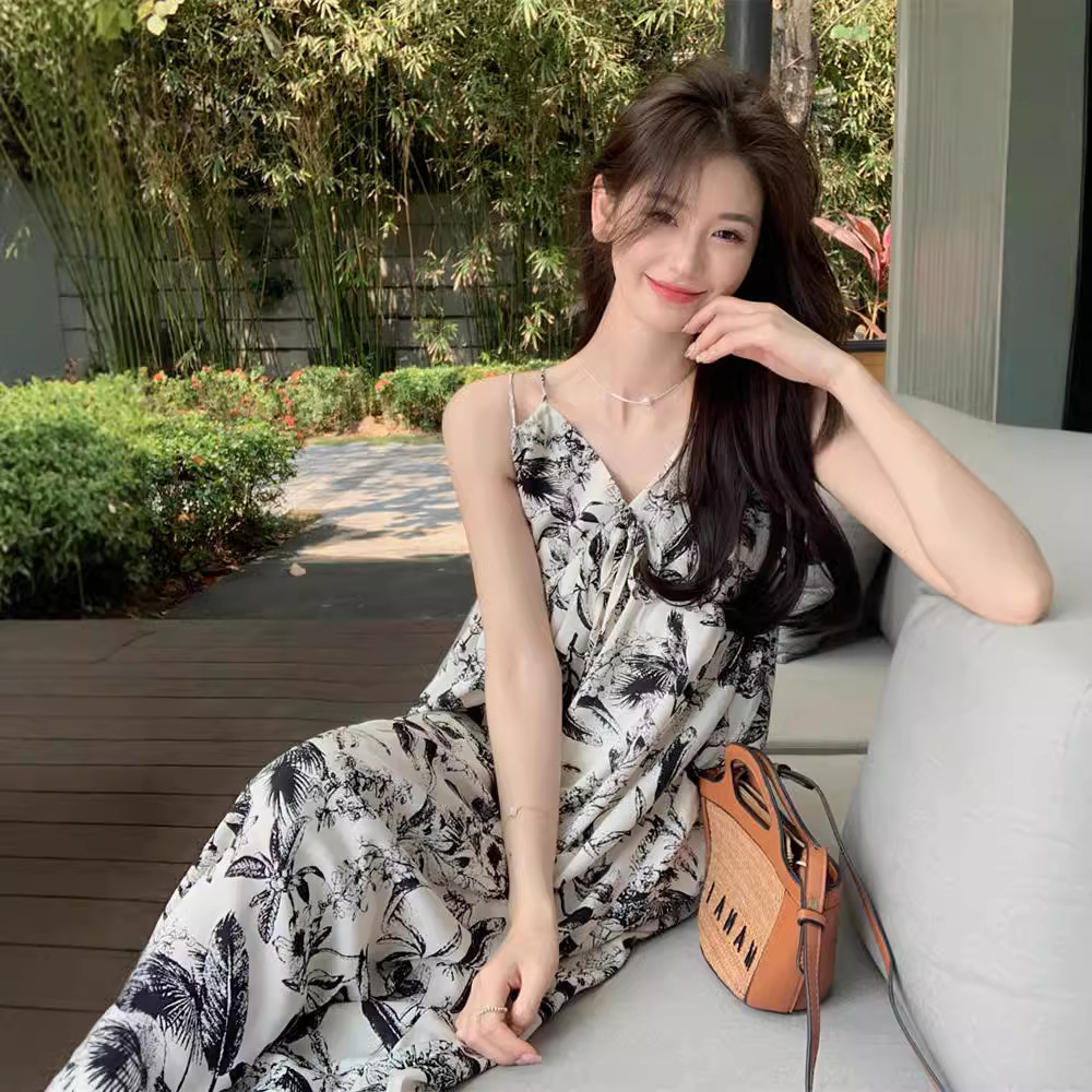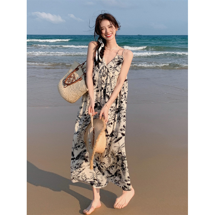 水墨画v领韩系吊带裙女装夏季纯欲风休闲长裙绝美别致茶歇连衣裙