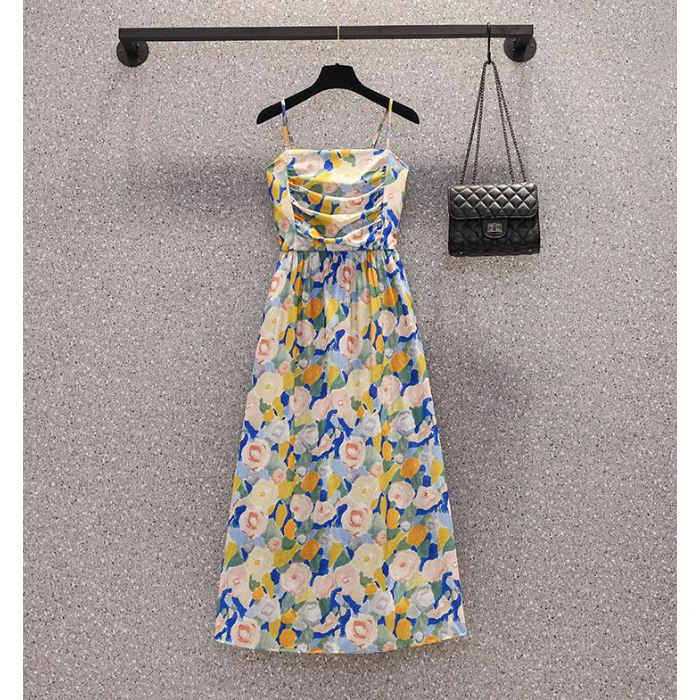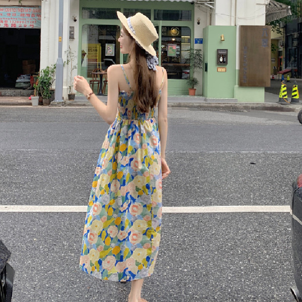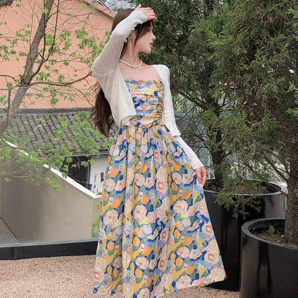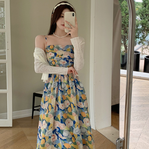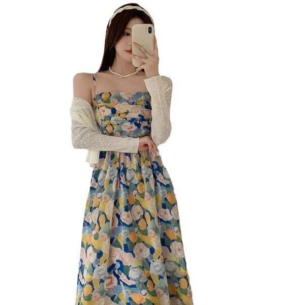 法式复古油画碎花连衣裙子女夏套装2025新款海边度假沙滩吊带长裙