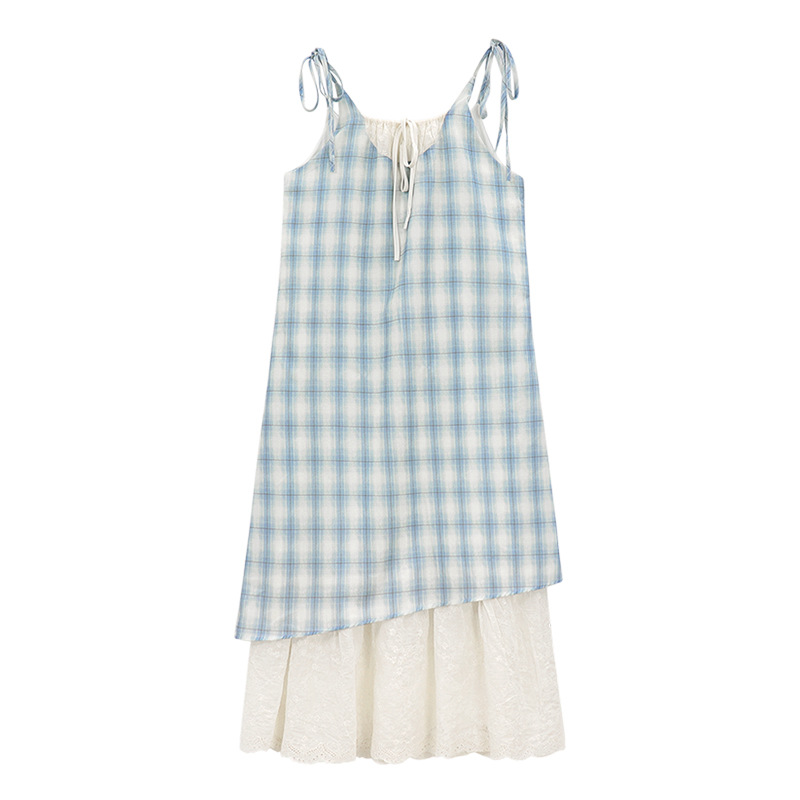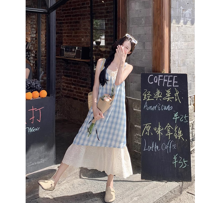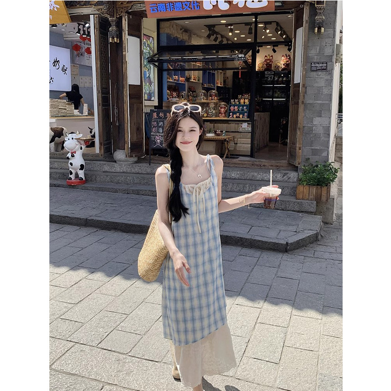夏季新款温柔风小清新格纹显瘦假两件吊带连衣裙女小众设计感长裙