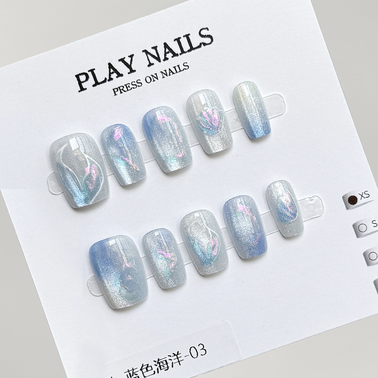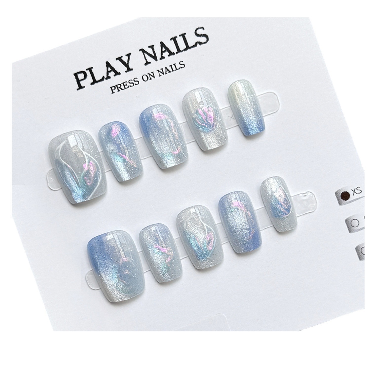 新款高级手工梯形穿戴甲 猫眼电镀工艺彩色卡通涂鸦美甲 渐变显白