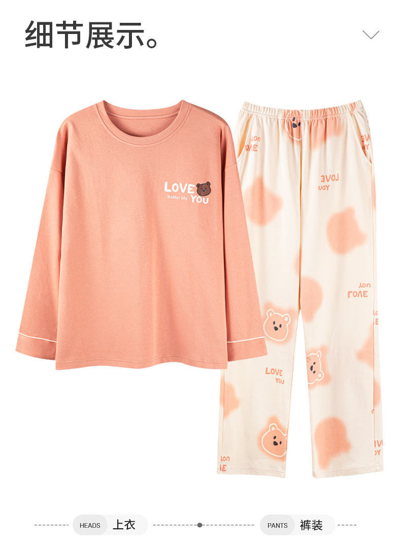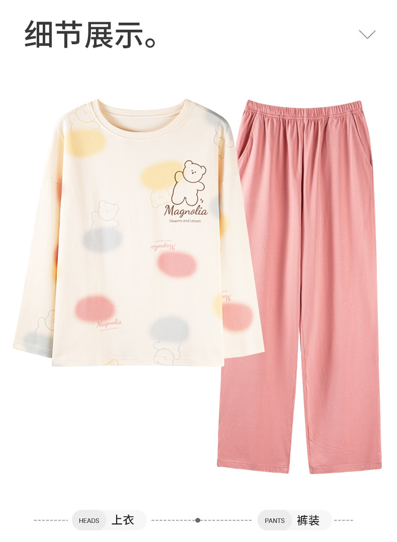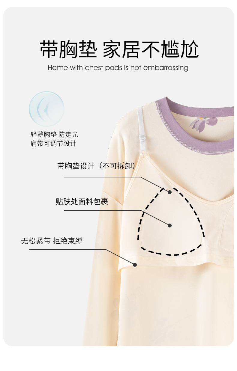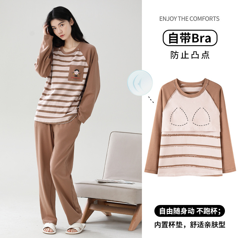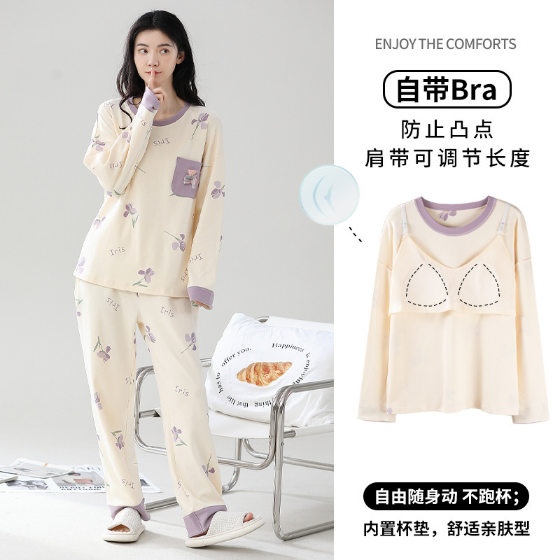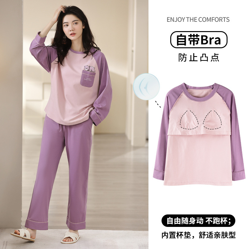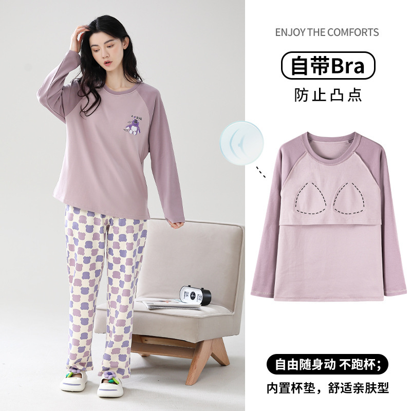纯棉睡衣女秋季新款圆领长袖长裤甜美卡通带胸垫一体可外穿家居服