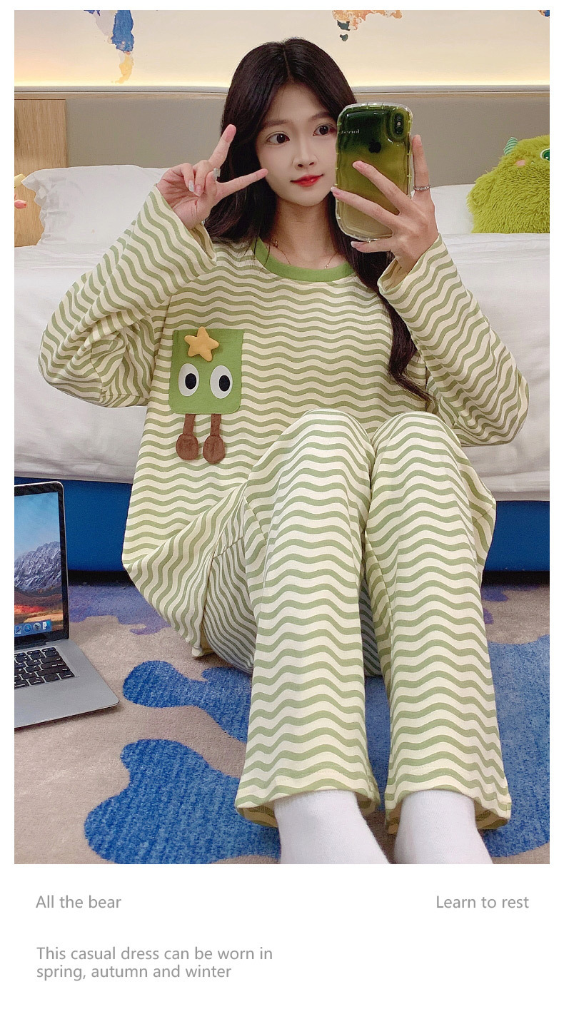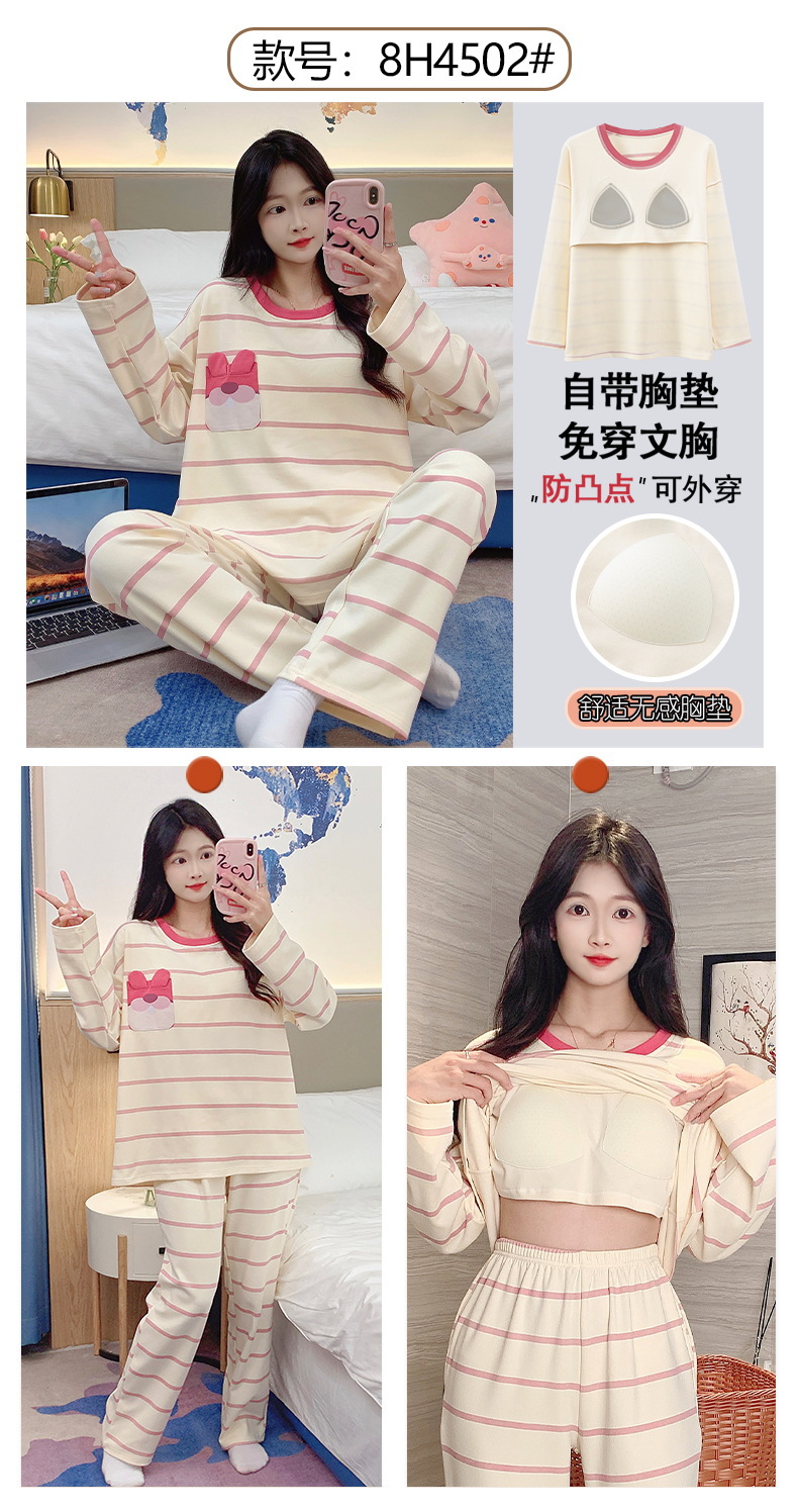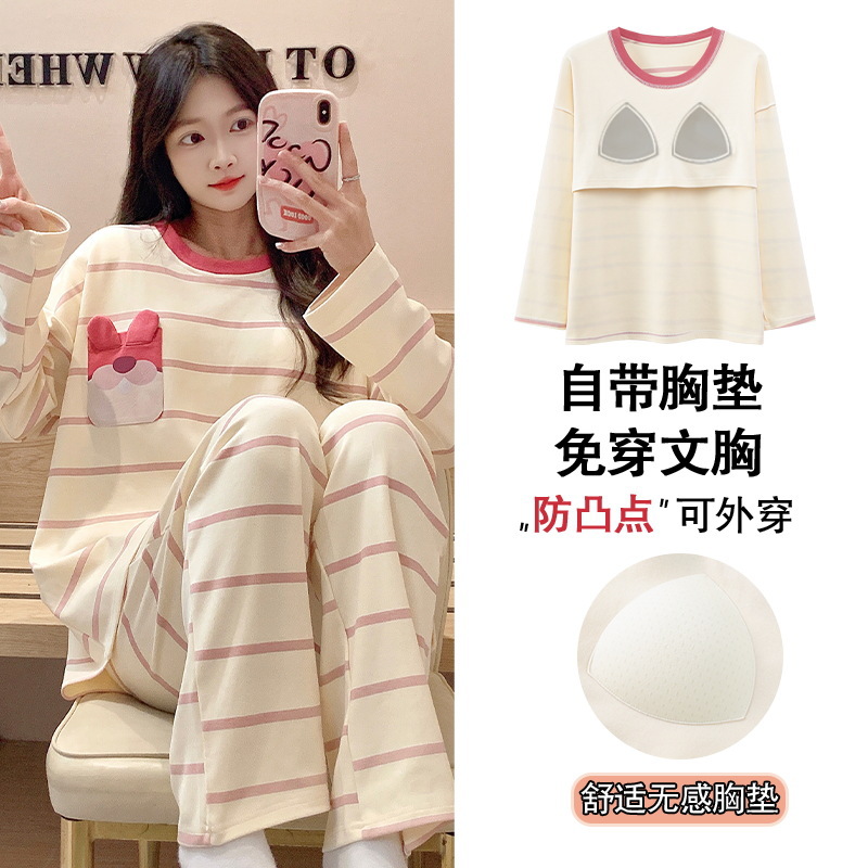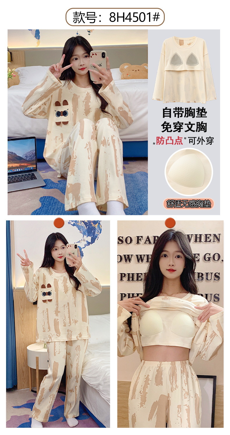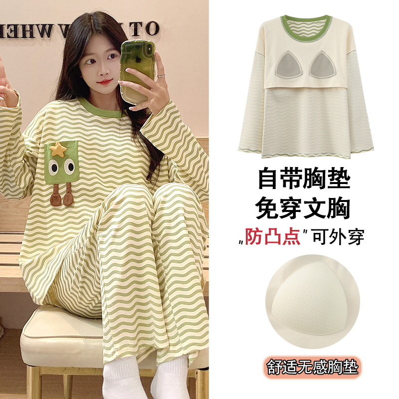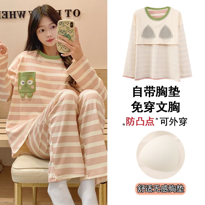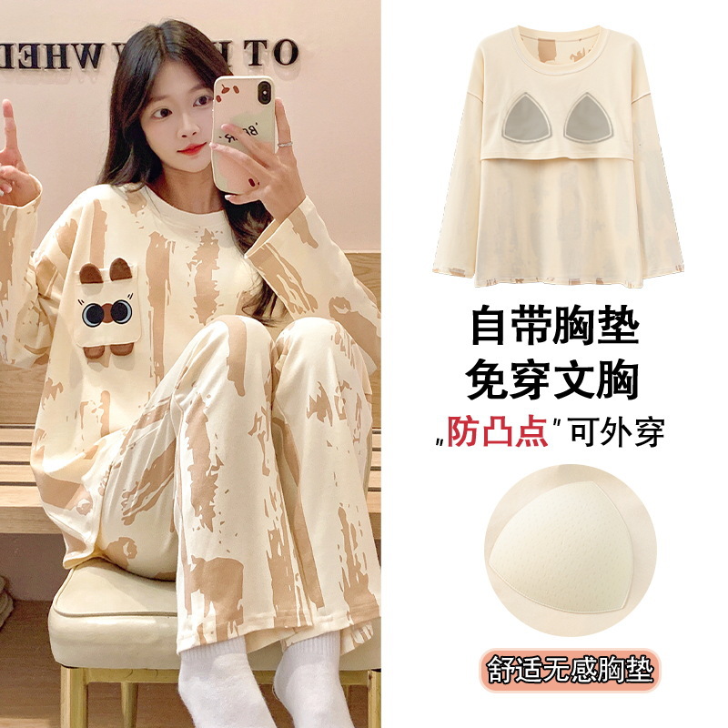 带胸垫睡衣女秋冬季长袖套头女学生卡通可爱家居服套装可外穿仿棉