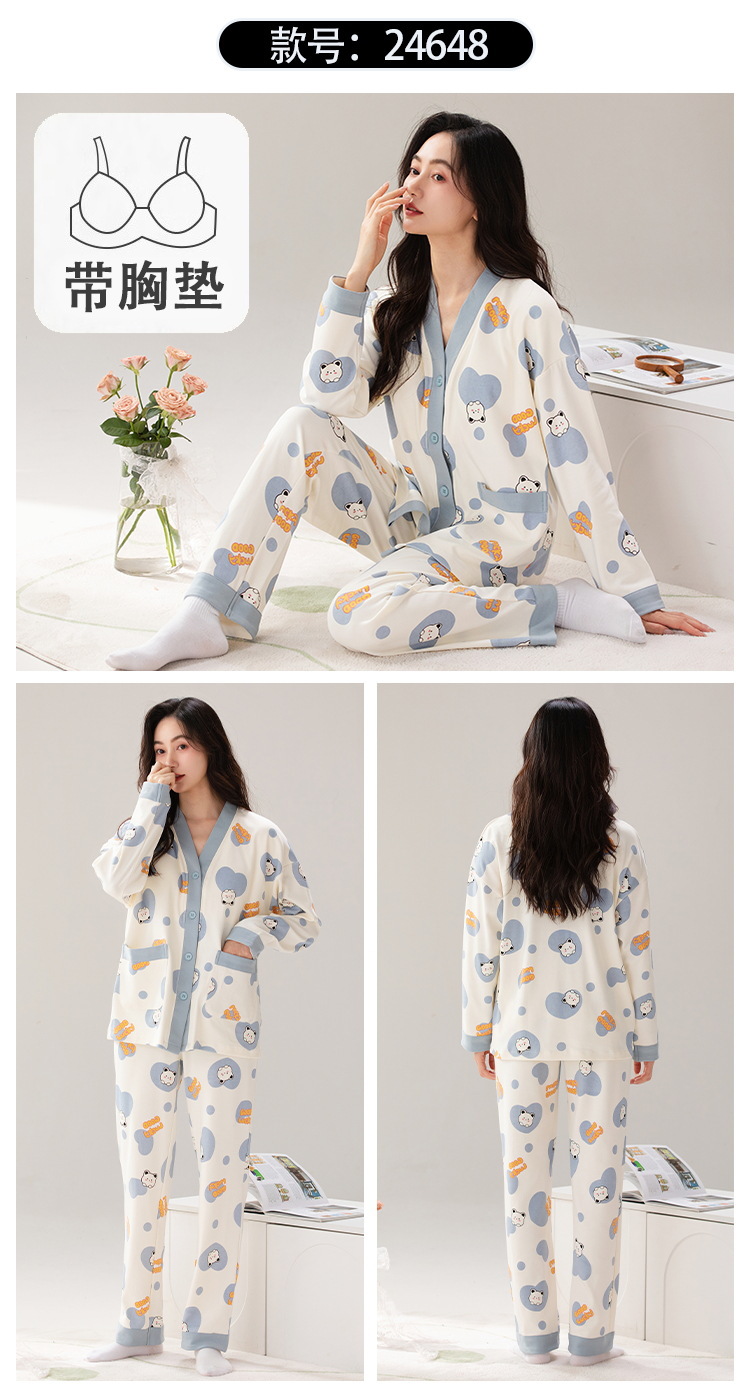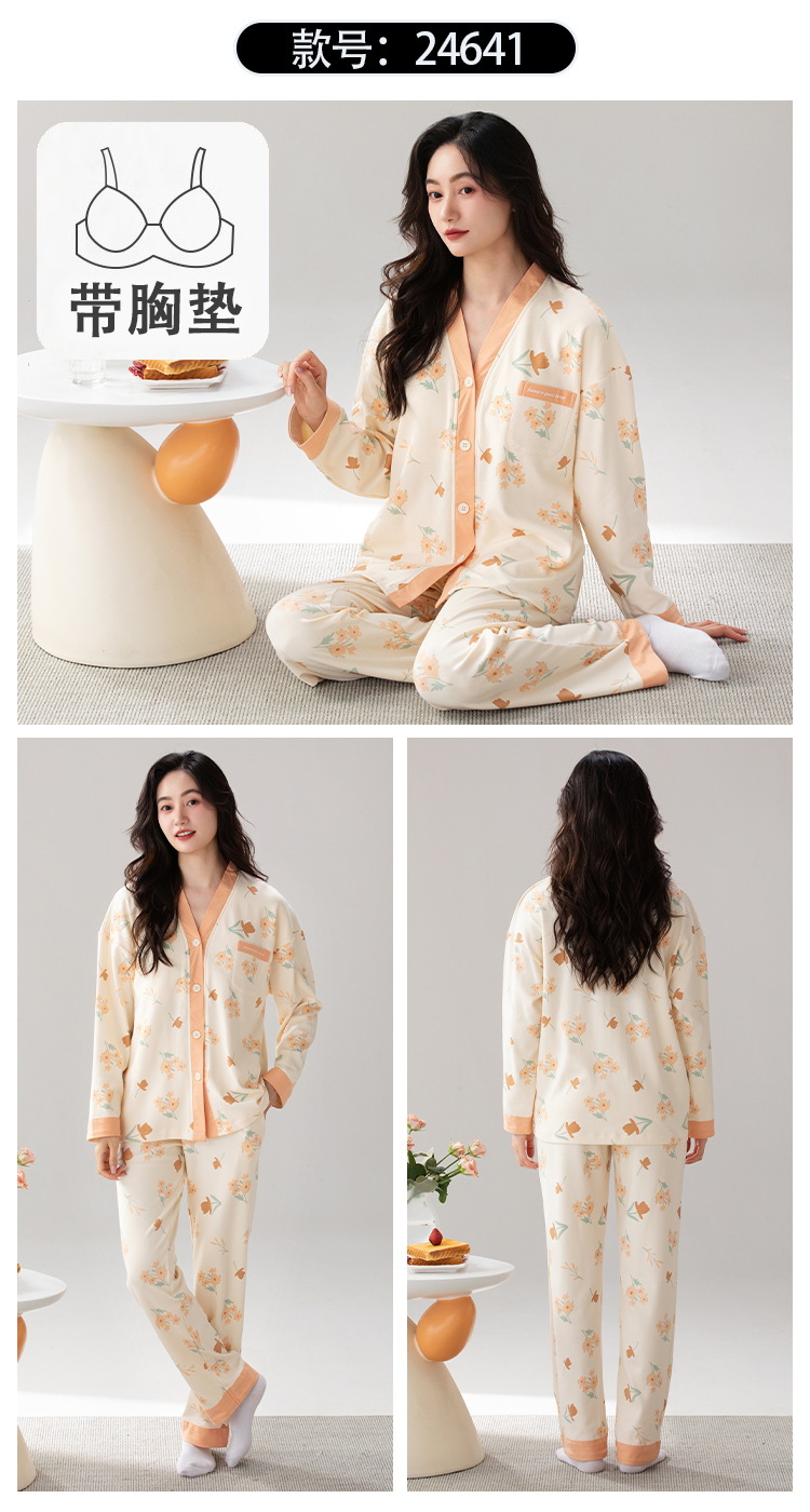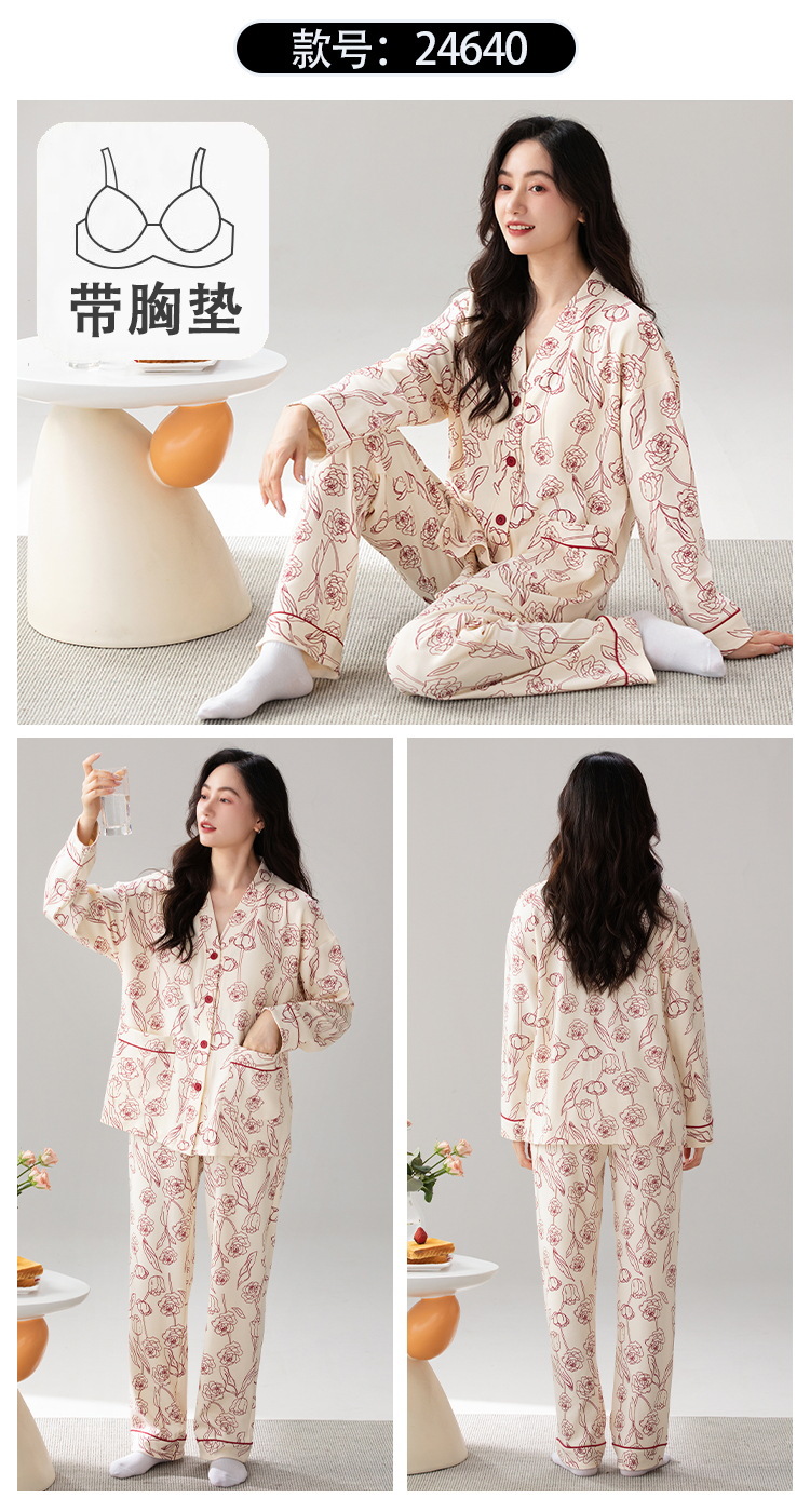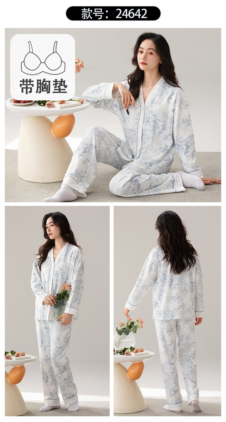 睡衣女带胸垫长袖长裤春秋季薄款和服领开衫可外穿女士家居服新款