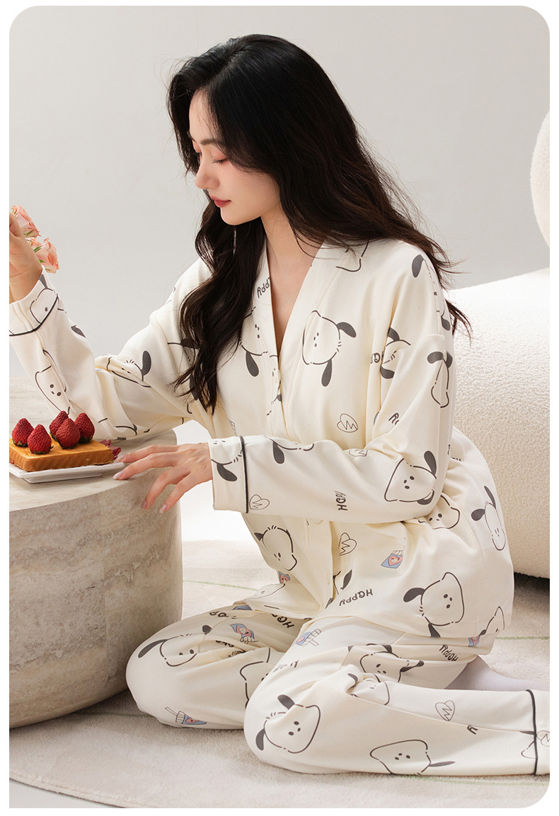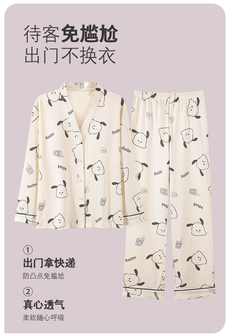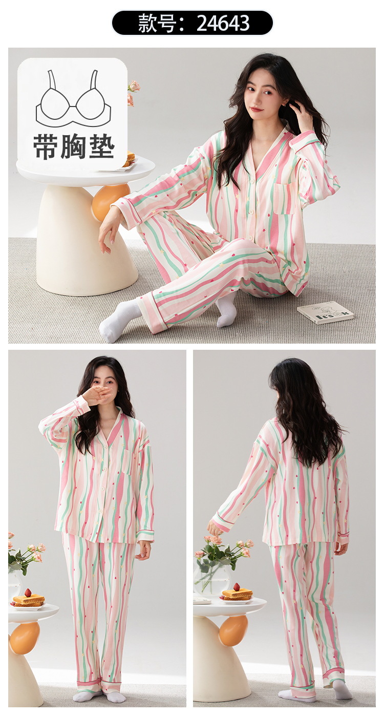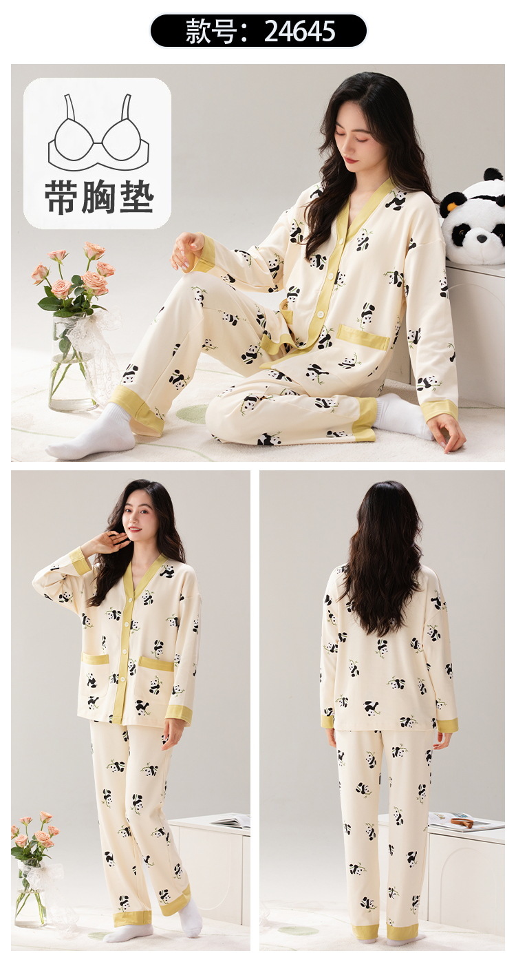 睡衣女带胸垫长袖长裤春秋季薄款和服领开衫可外穿女士家居服新款