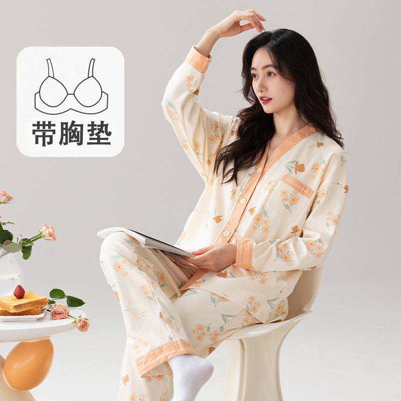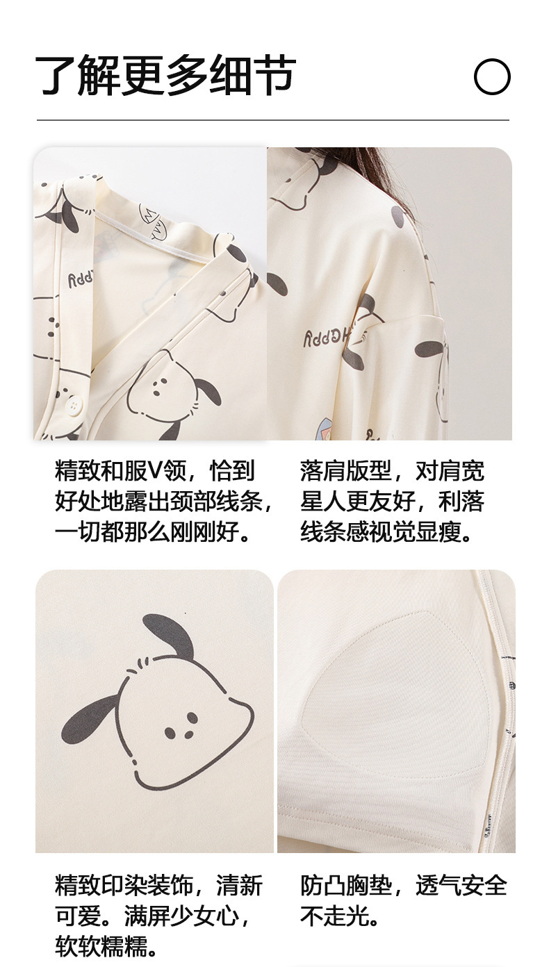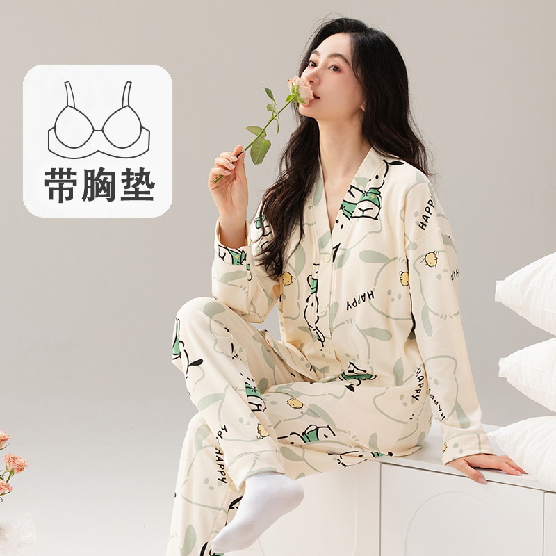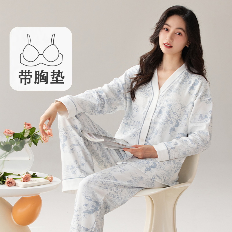pajamas women‘s long-sleeved trousers with chest pad spring and autumn thin kimono collar cardigan can be worn outside ladies‘ homewear new