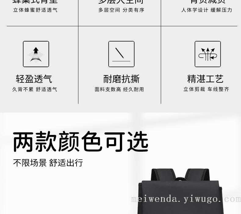 美文达箱包厂 位于“书包之都”湖南省邵东市。从事箱包制造行业近20年,生产能力强,员工500余人,设备400台套,日均生产书包4000个。产品畅销俄罗斯、南非、欧美、东南亚等几十个地区。 我们期待与您携手共进! 支持大量批发、少量混批、一件代发 支持来样加工、打样定制、OEM、来图定制、定制LOGO 长期库存,源头工厂,一手货源 欢迎实体商家、电商平台卖家、捐赠机构、培训学校咨询合作 质量保证,款式新颖,价格便宜,欢迎来电咨询!