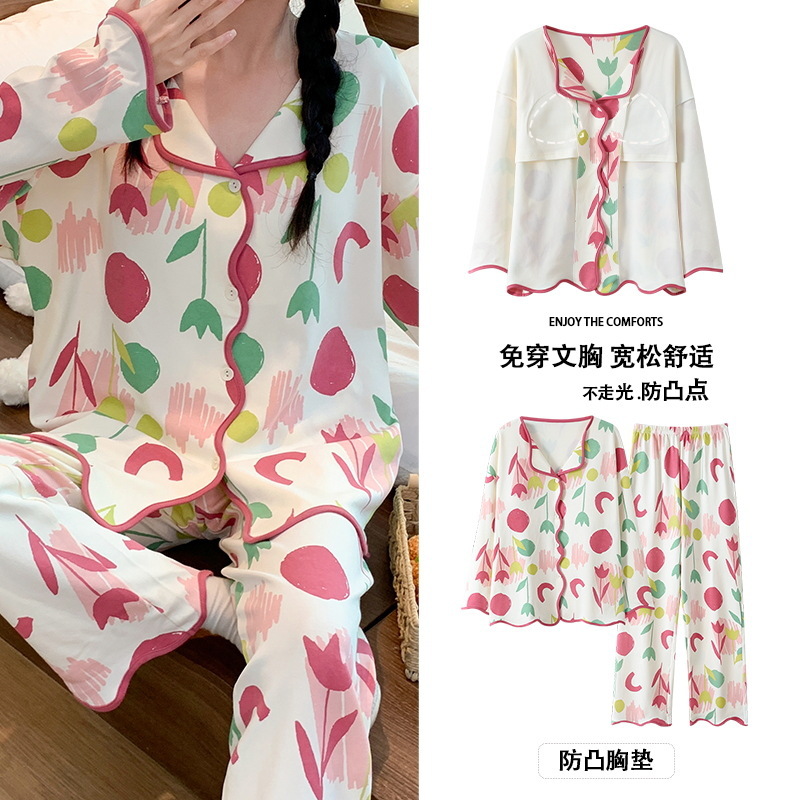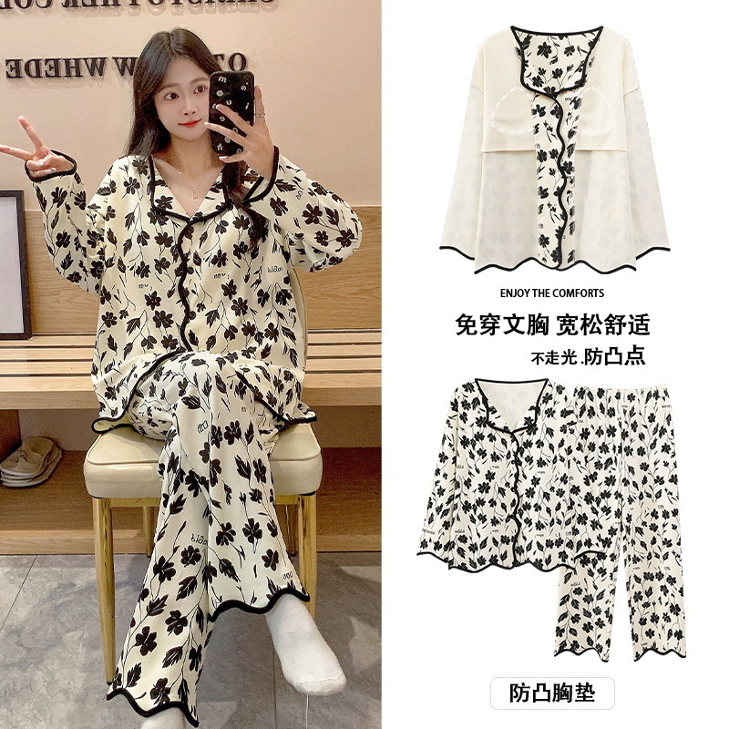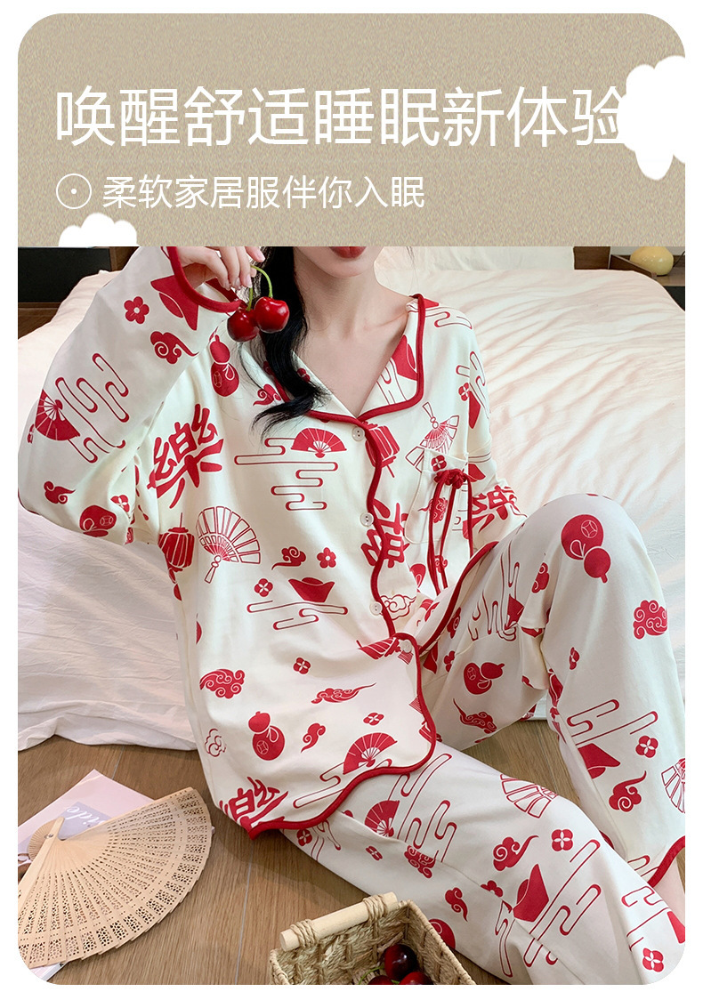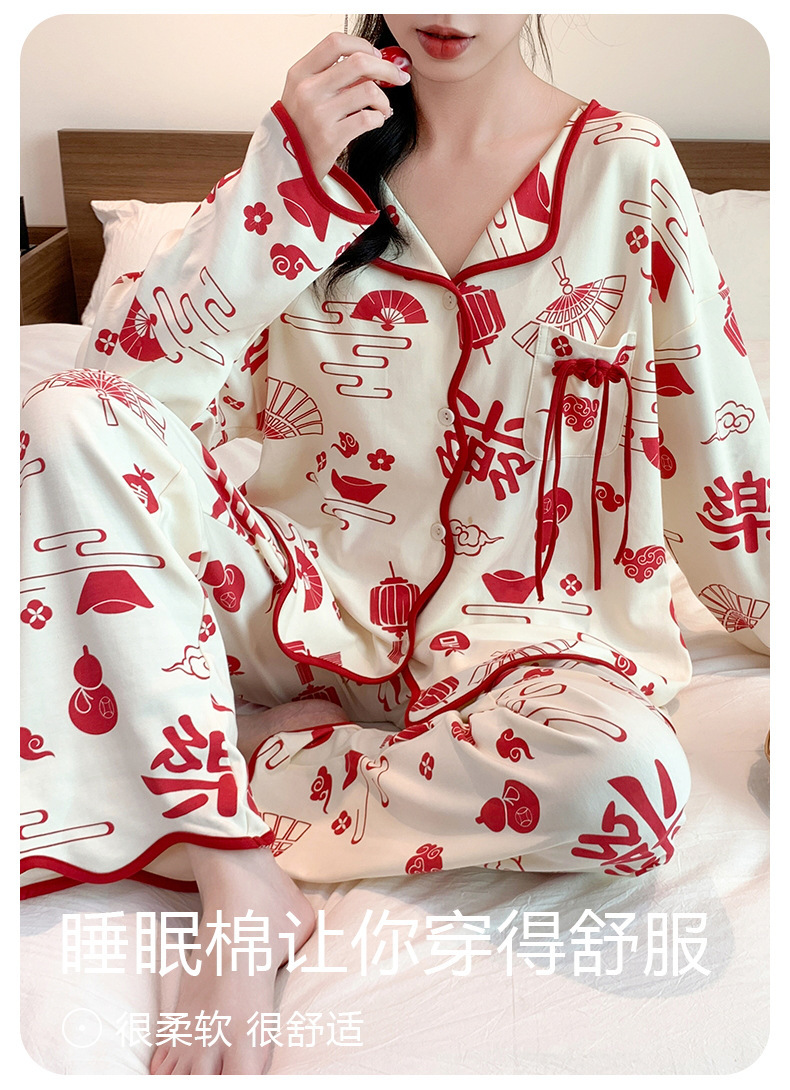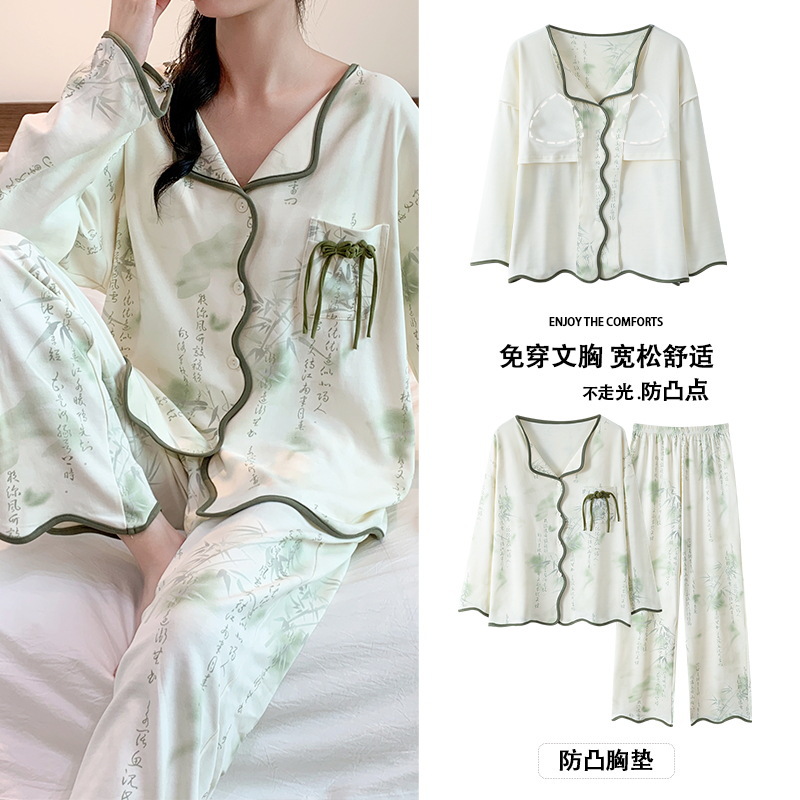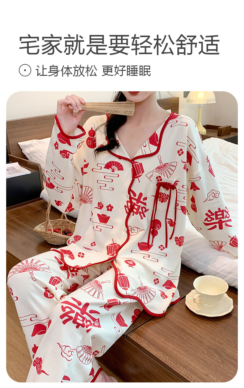 新款睡衣女士春秋款秋季休闲简约宽松开衫棉质长袖家居服套装批发