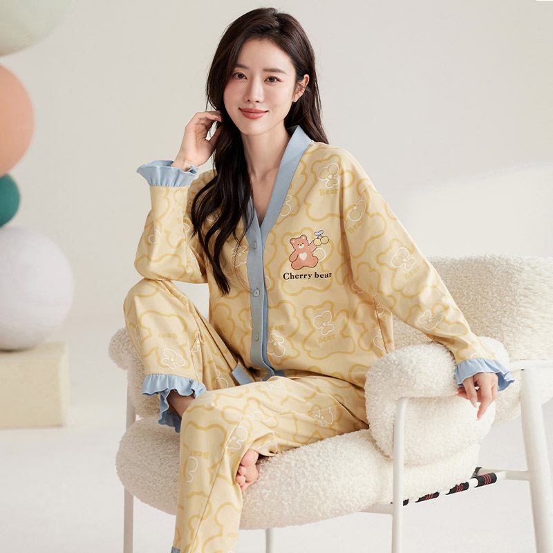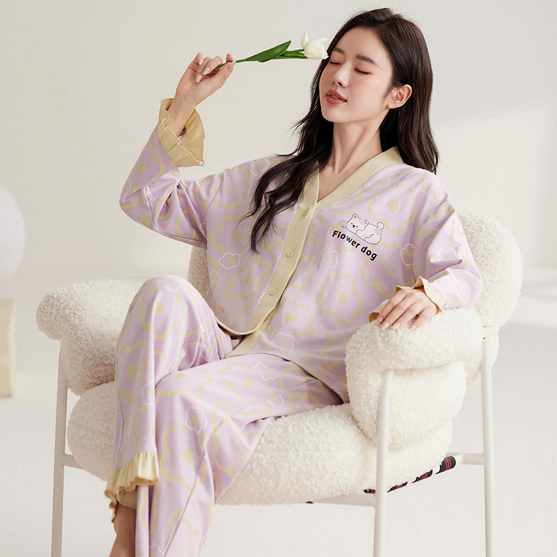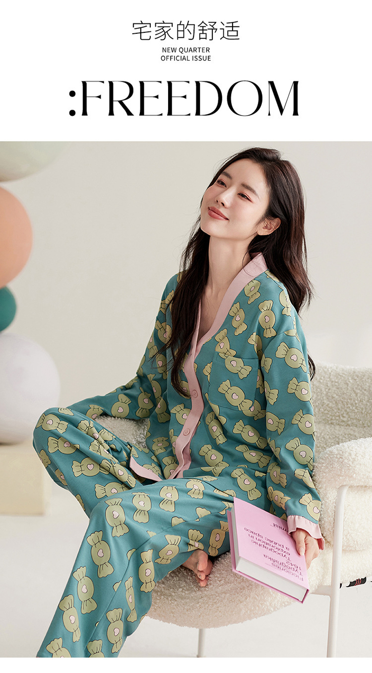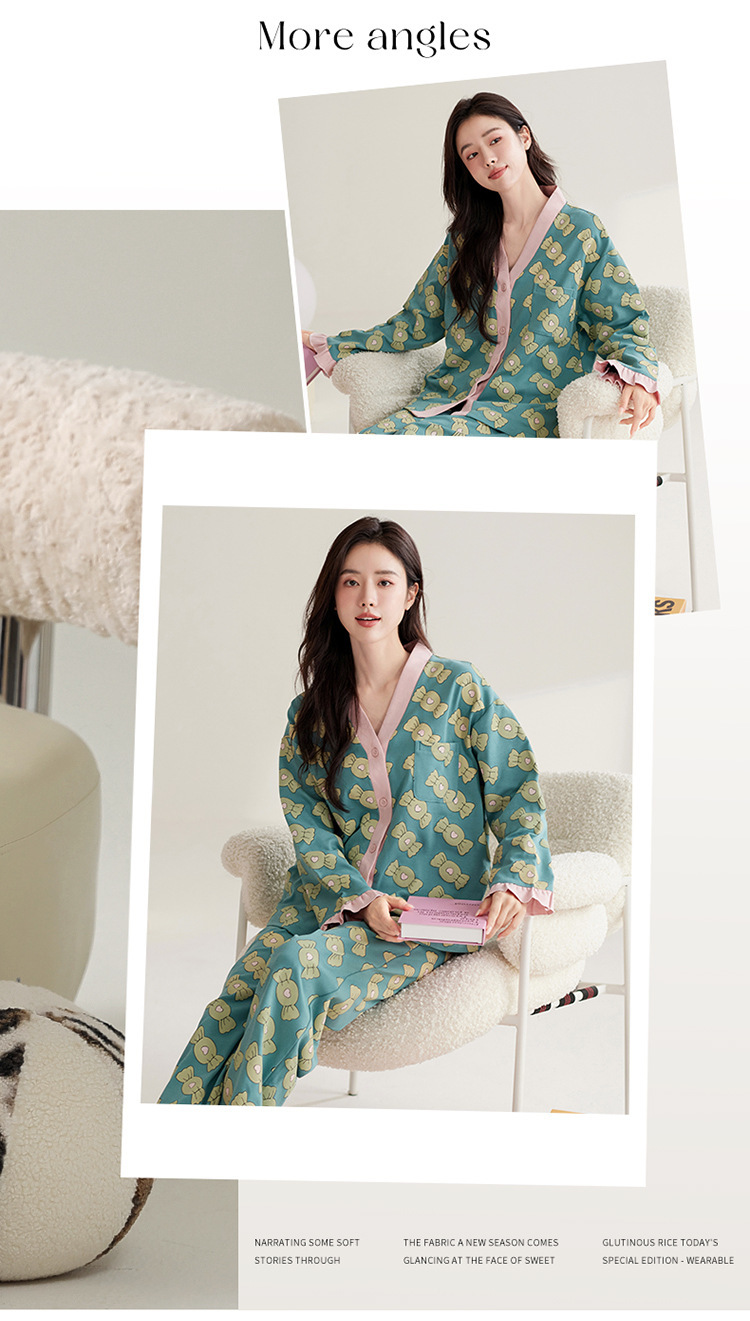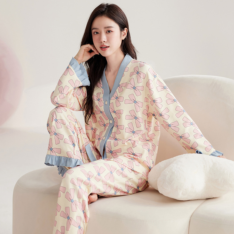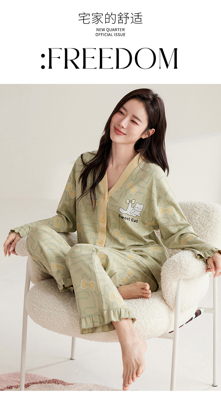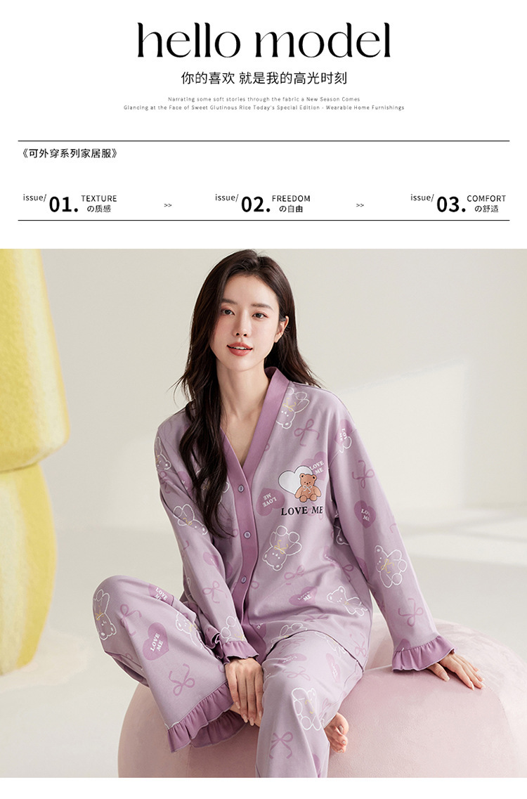 仿棉高档睡衣女新品春秋季开衫棉质长袖长裤ins可外穿家居服套装