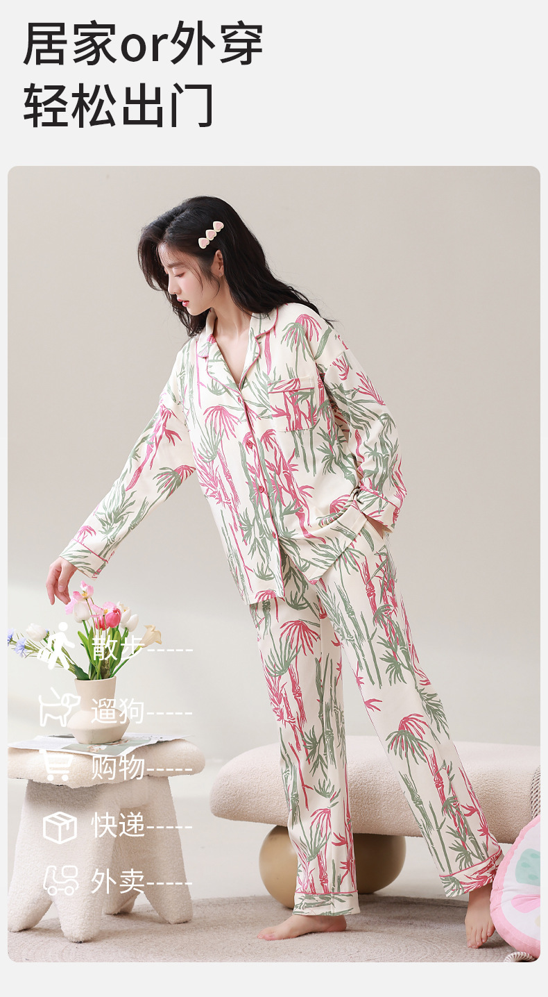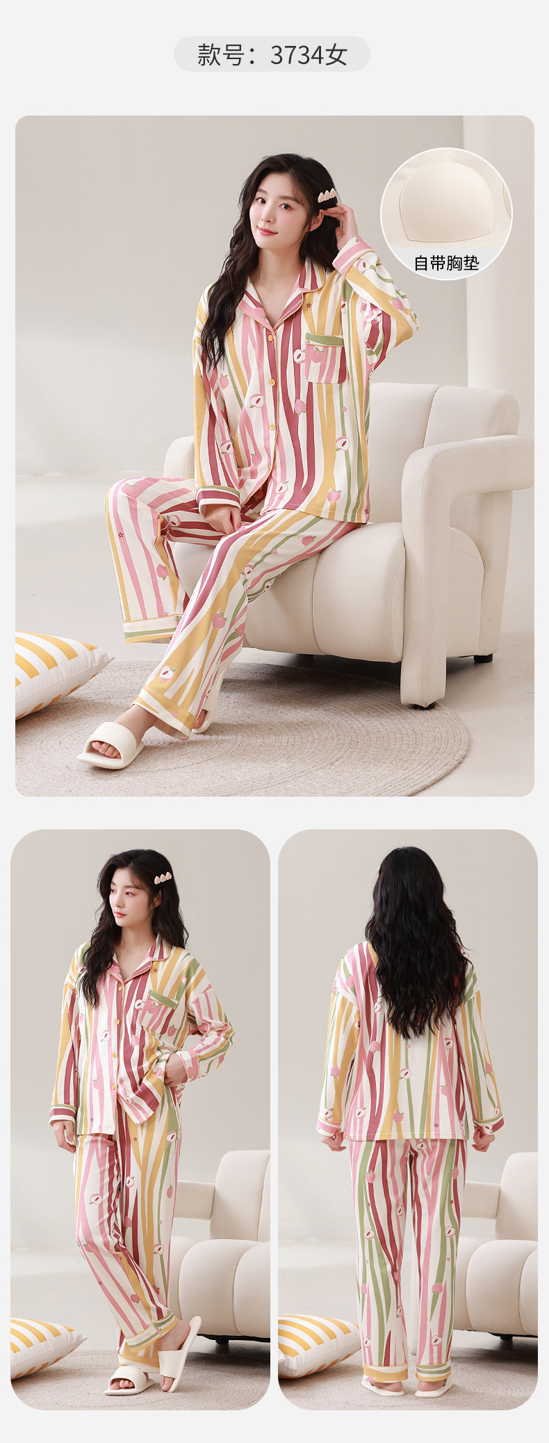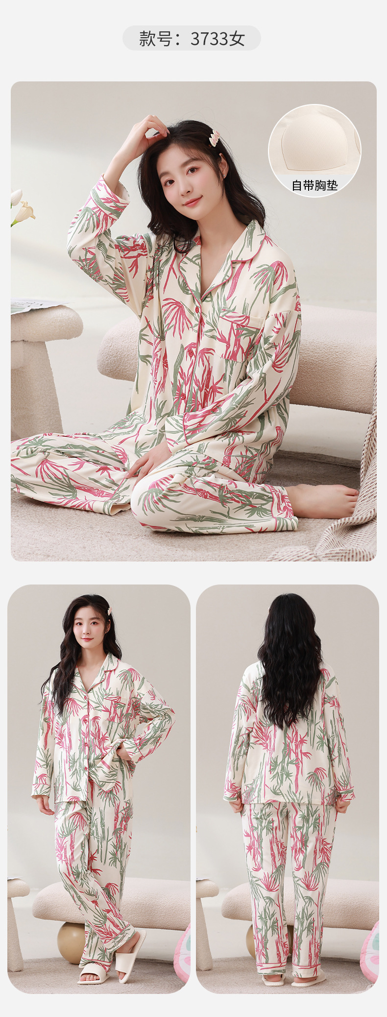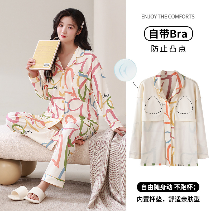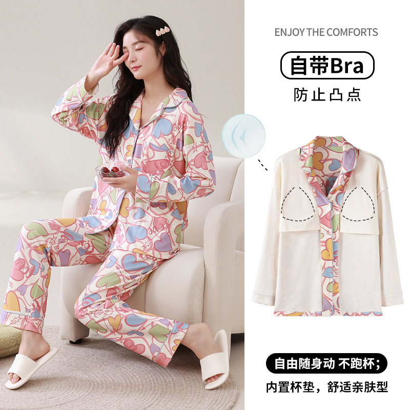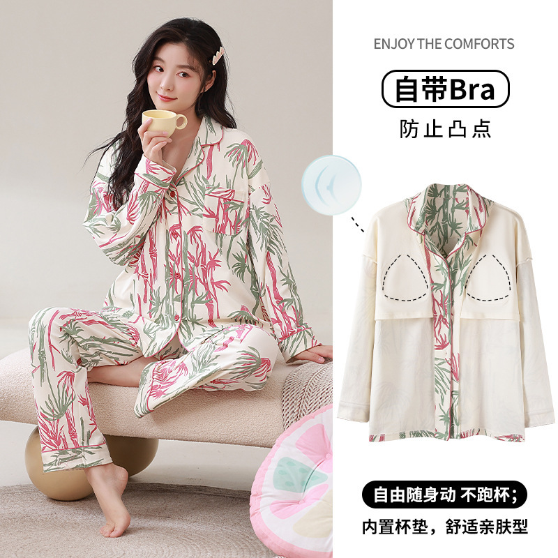 带胸垫一体纯棉睡衣女春秋季长袖开衫前扣全棉大码家居服套装秋冬