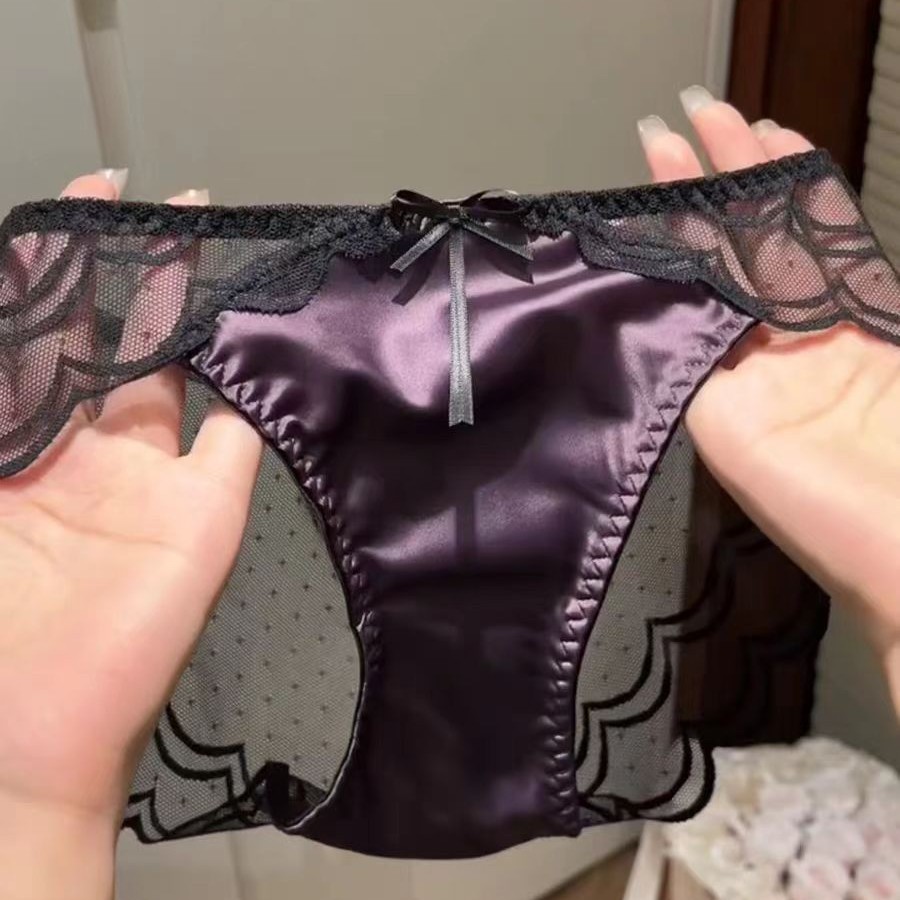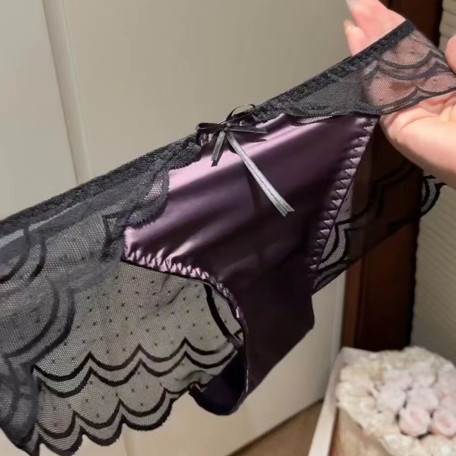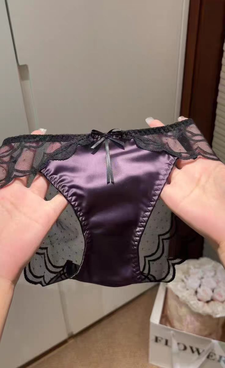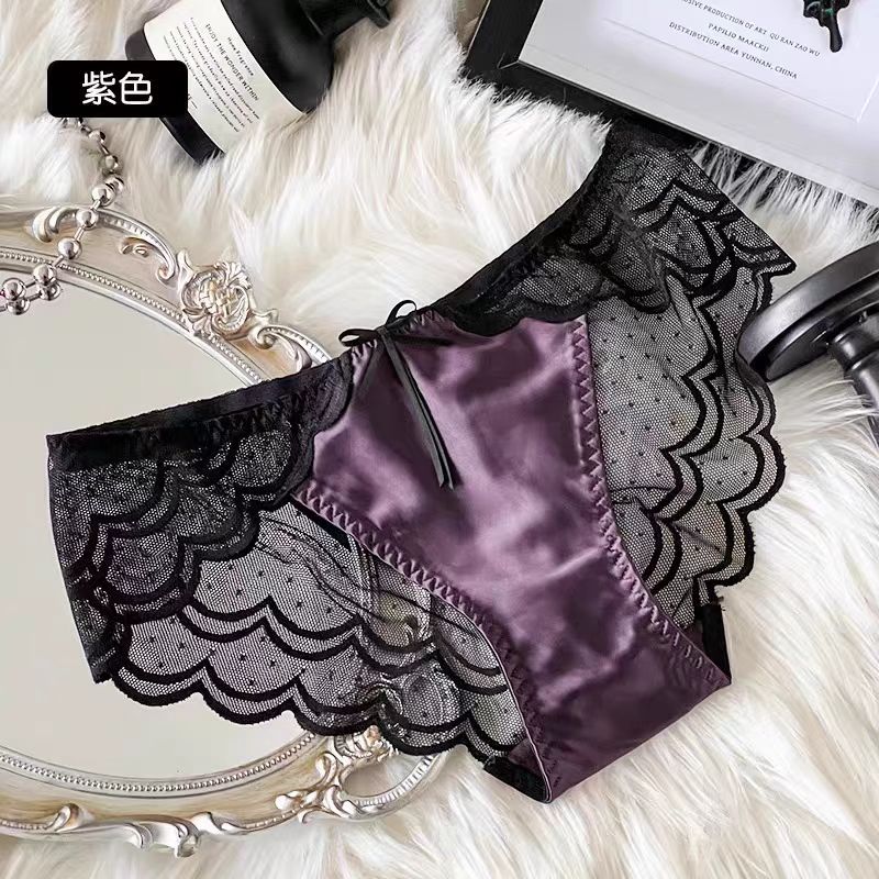 性感紫色缎面拼接蕾丝女蝴蝶结波浪蕾丝网纱三角内裤