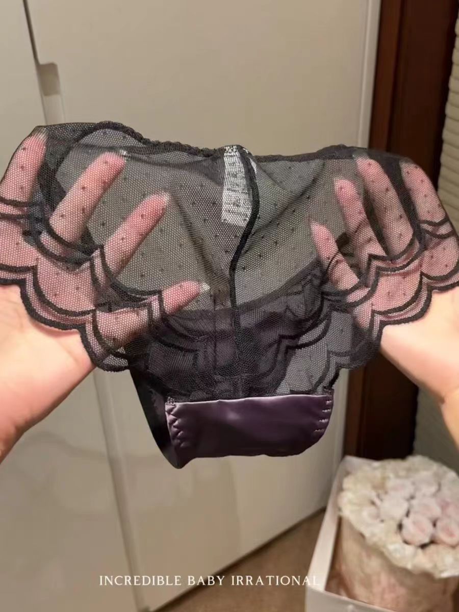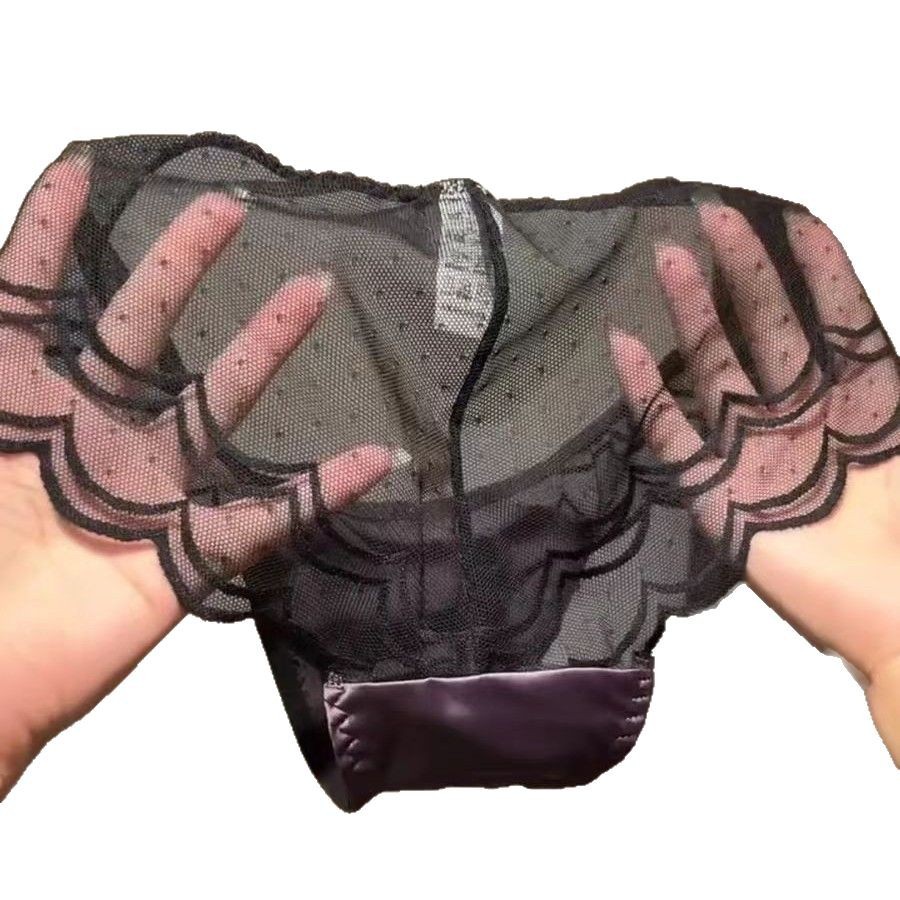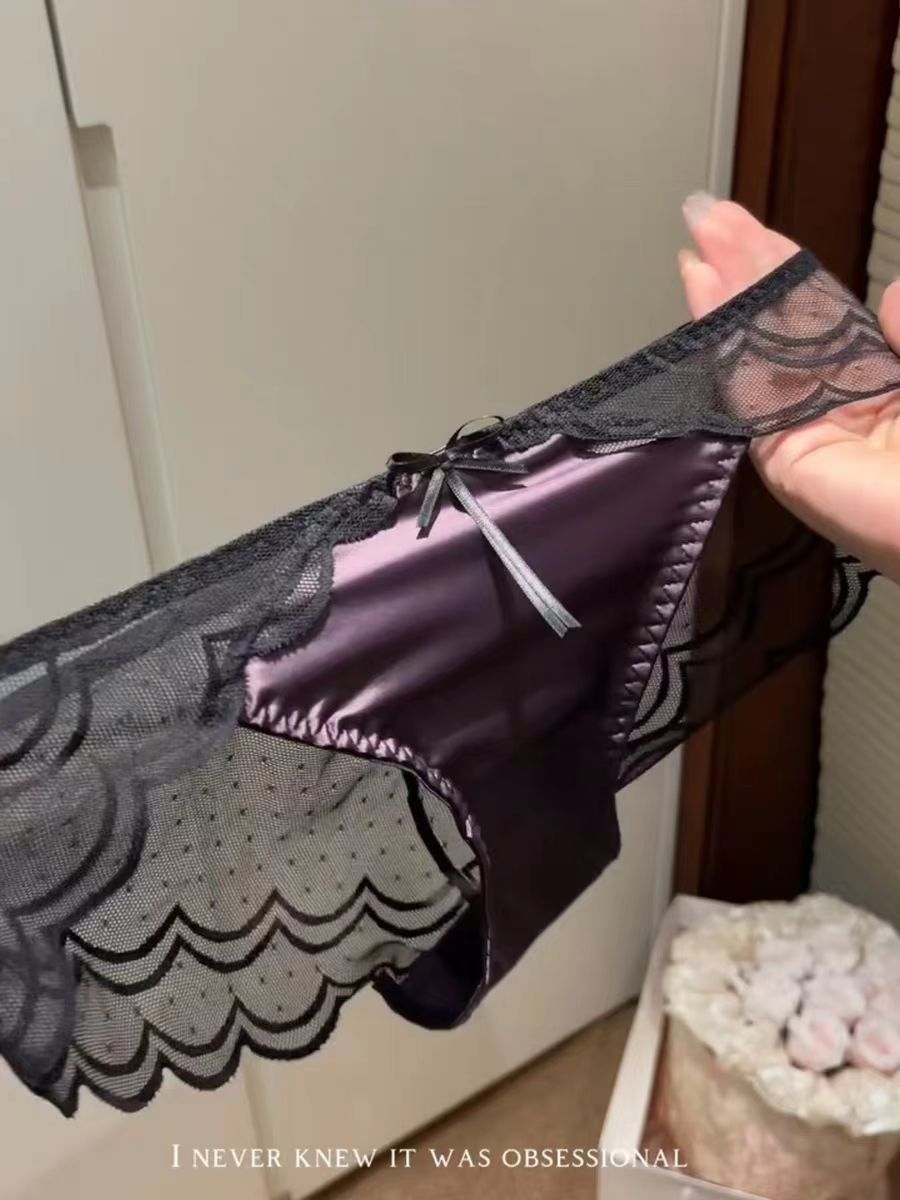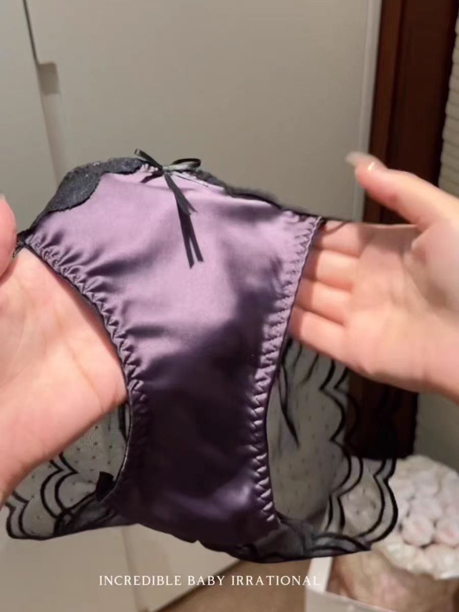 性感紫色缎面拼接蕾丝女蝴蝶结波浪蕾丝网纱三角内裤