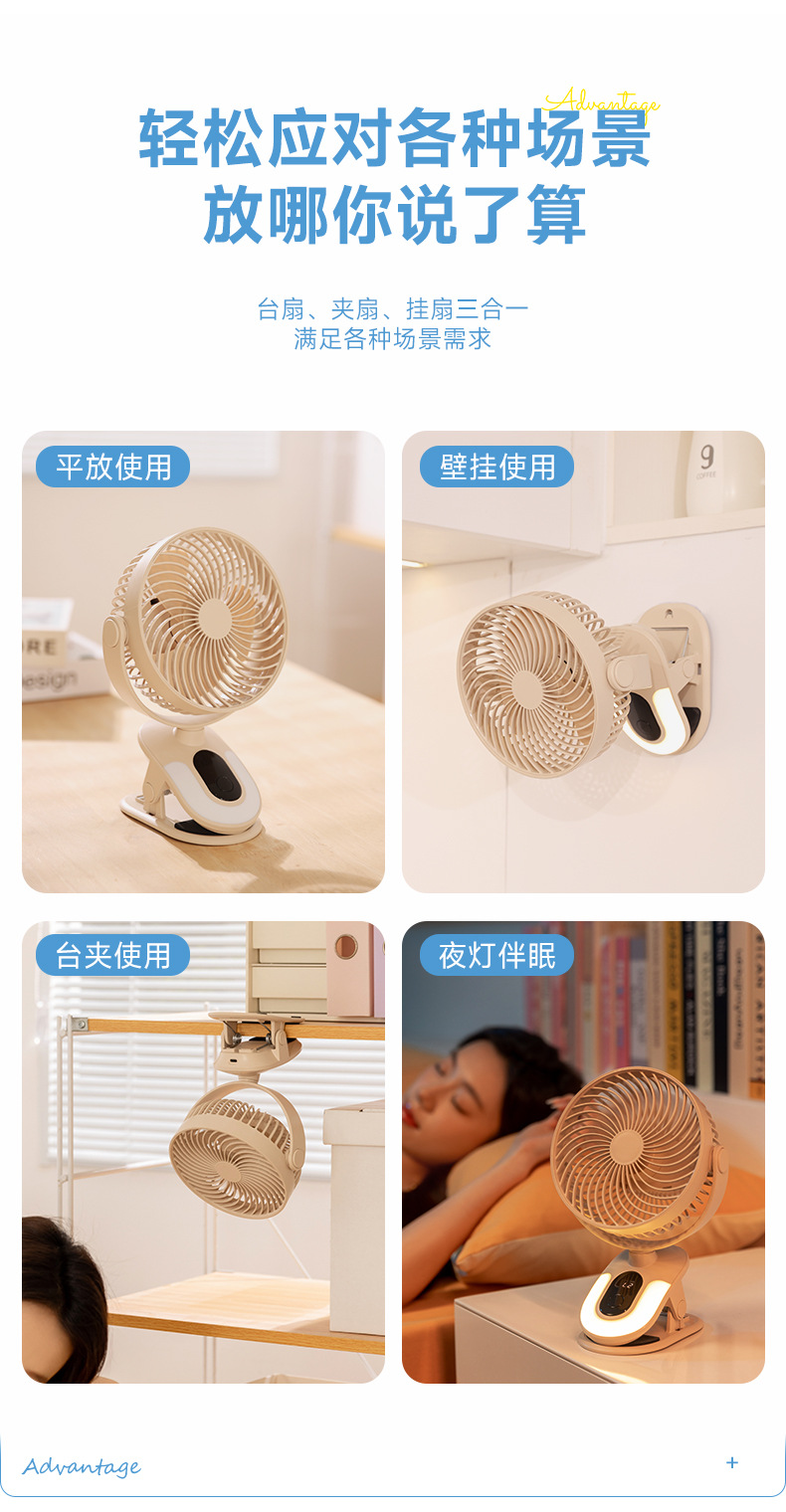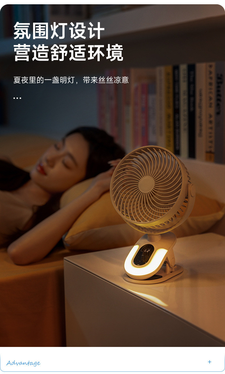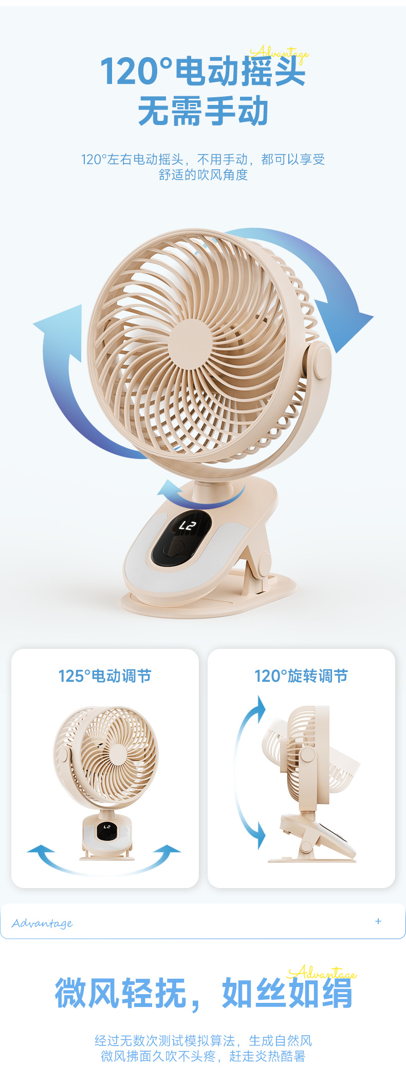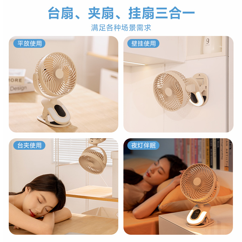 跨境夹子风扇带灯桌面小风扇台式左右摇头数显usb充电夹子小风扇